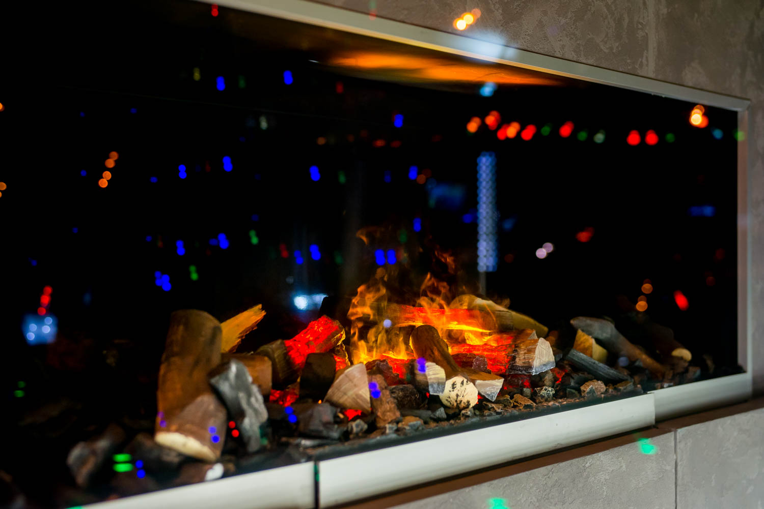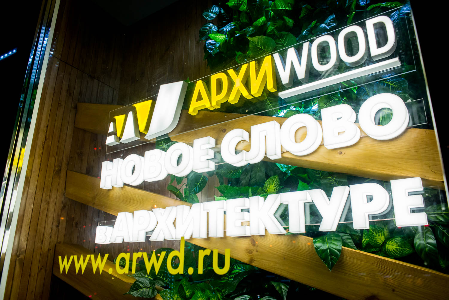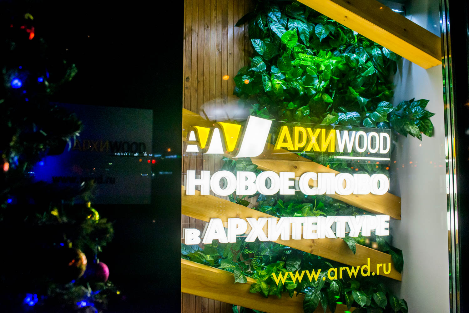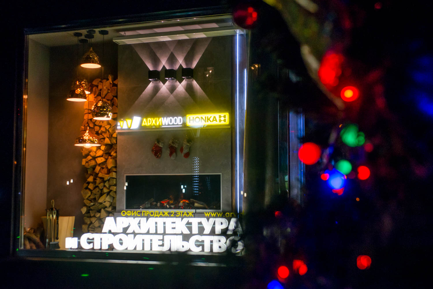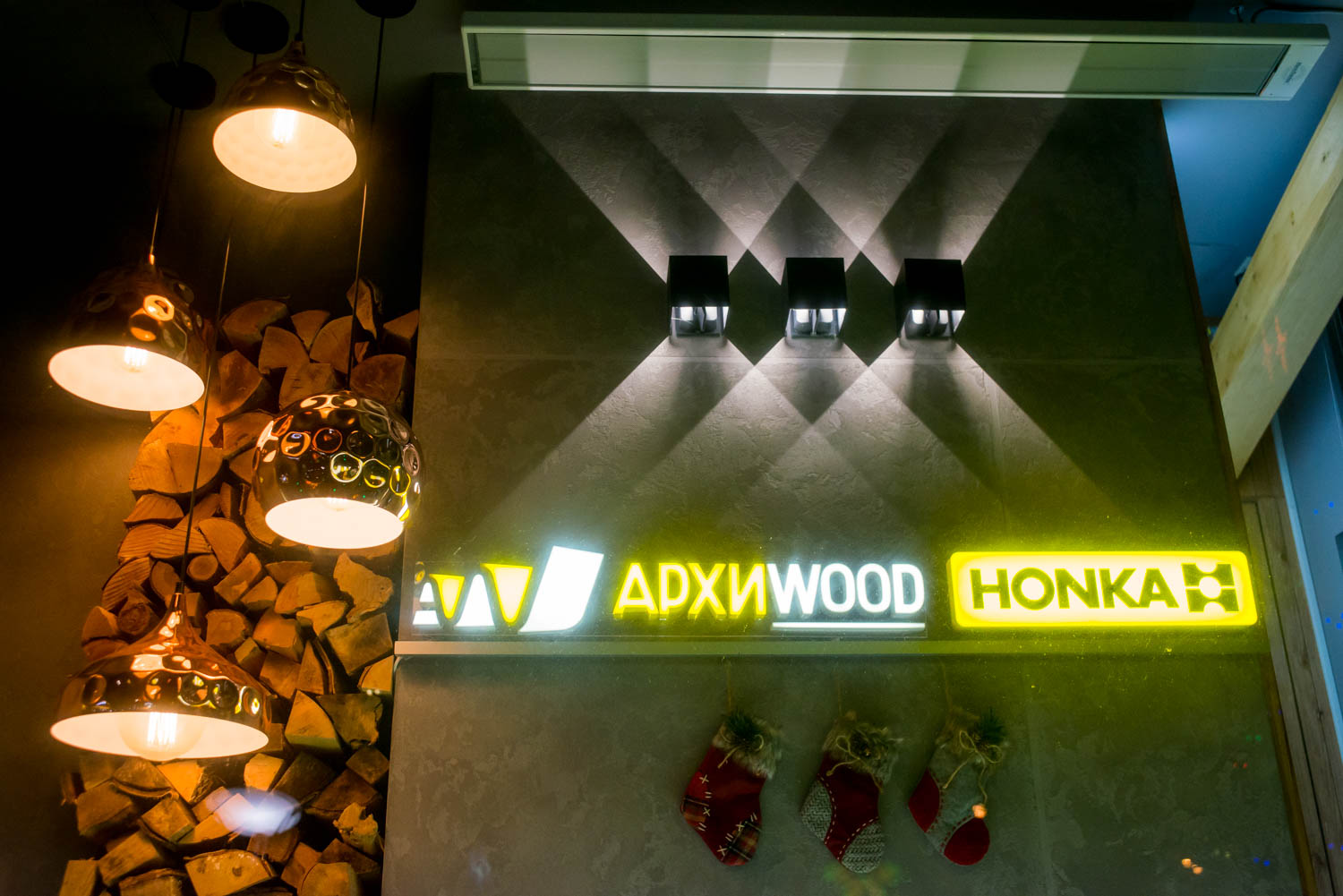 Декор витрин для компаний Архиwood и Honka был выполнен в стиле загородного шале. Теплый свет ламп, дрова, настоящий камин, деревянные элементы и декоративный зимний сад создают уютную и домашнюю атмосферу.
