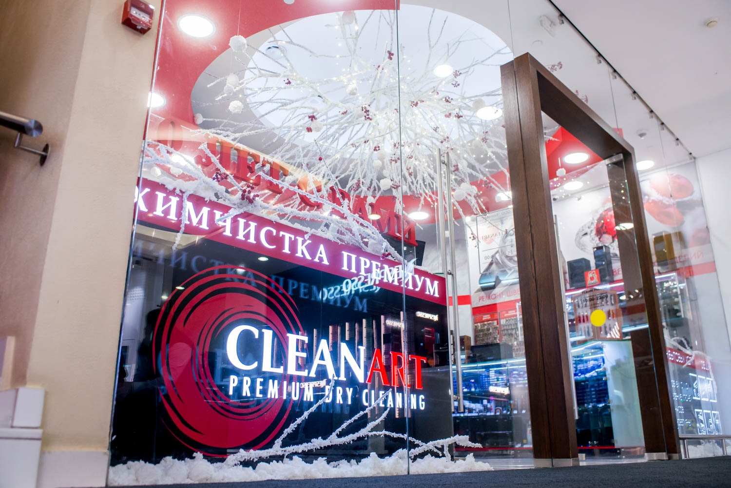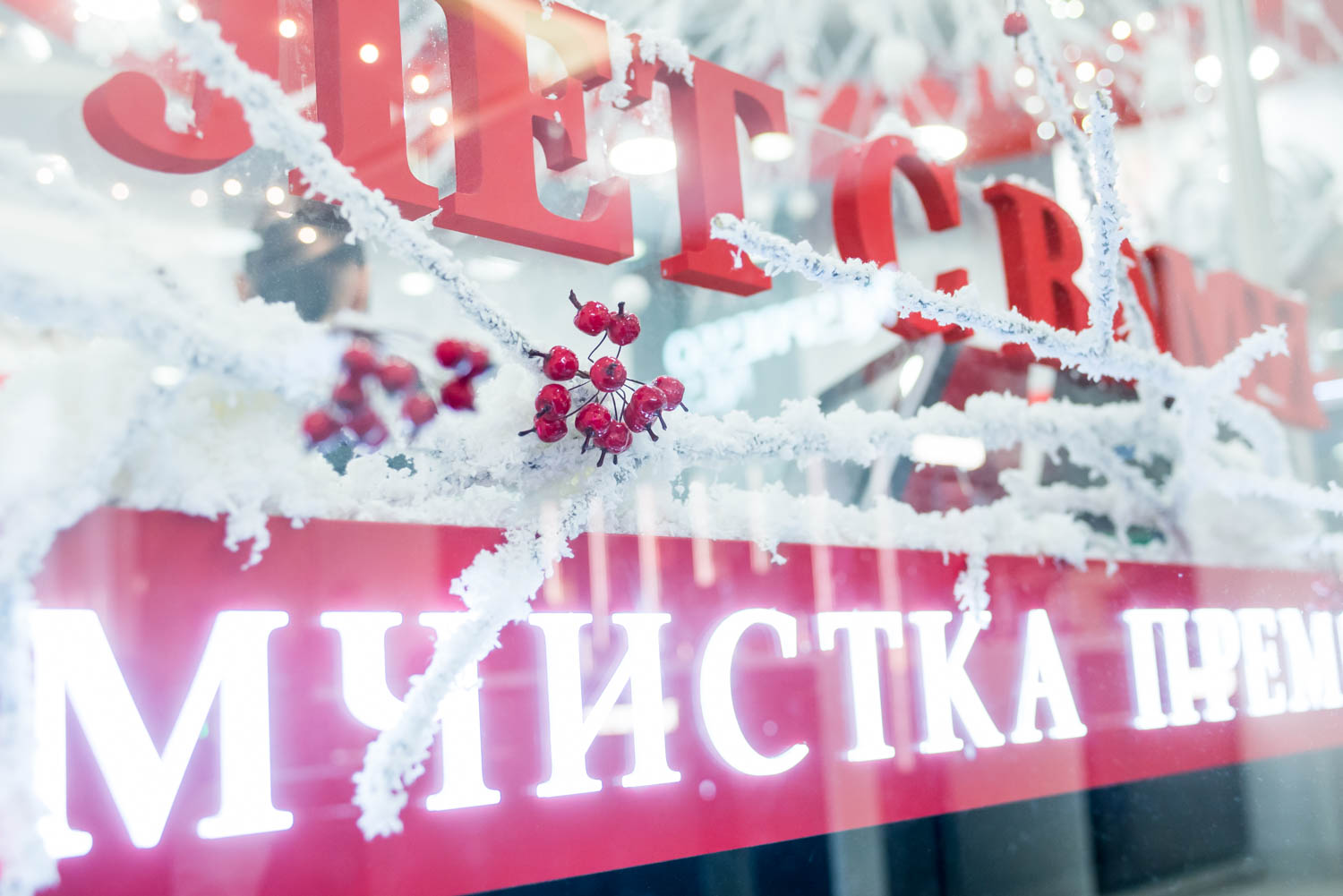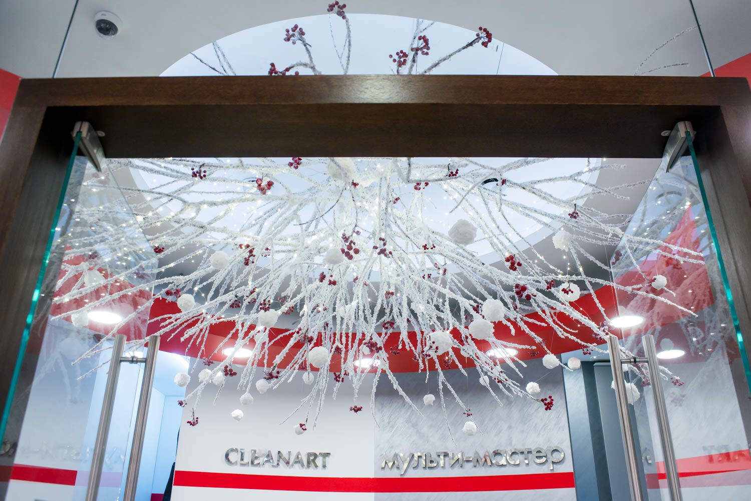 Искрящееся новогоднее оформление для премиум сервиса по уходу за одеждой наполнило праздником помещение и подчеркнуло витрины. Объемная конструкция из ветвей дерева, покрытых инеем, украшенная декоративными снежками, красными ягодами и светом новогодней гирлянды подчеркивает конструкцию потолка и сочетается с цветовым решением помещения.