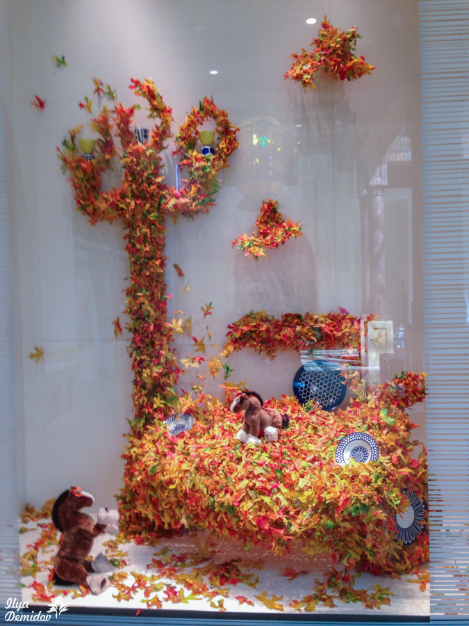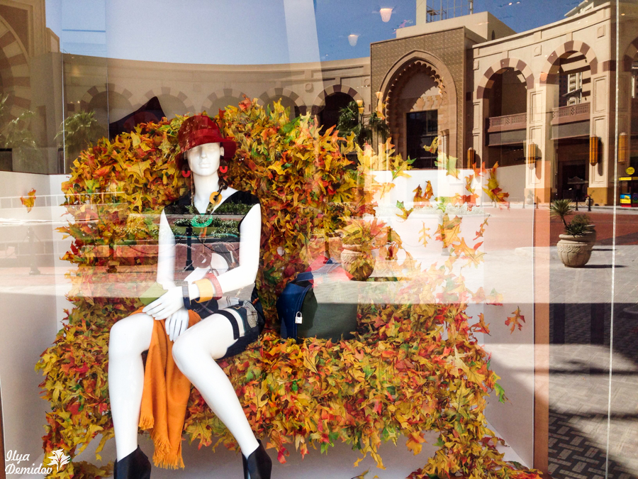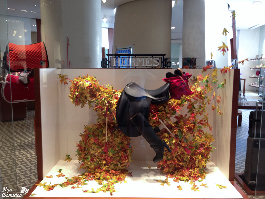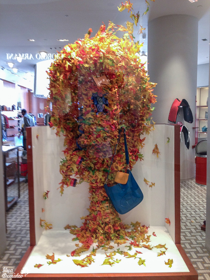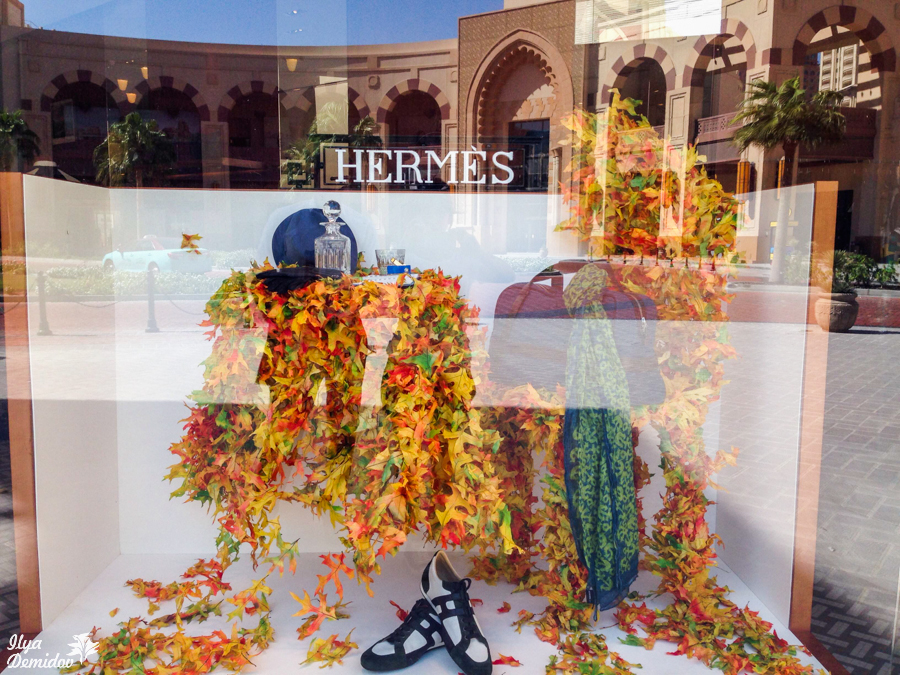 Осень – возможно, самое романтичное время года. Ведь это так вдохновляет, когда все вокруг покрывается яркими красками и запахом листвы. Натуральные осенние листья, как-будто бы только упавшие с деревьев, окутывают собой невидимые объемные фигуры, создавая яркую осеннюю атмосферу в витринах бутика Hermes, The Pearl в г. Доха.