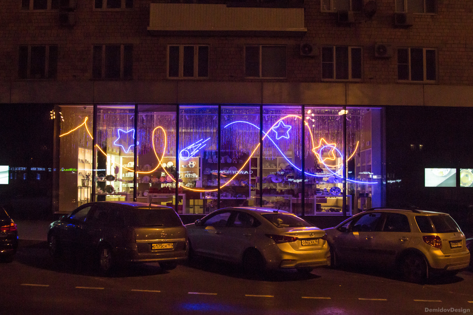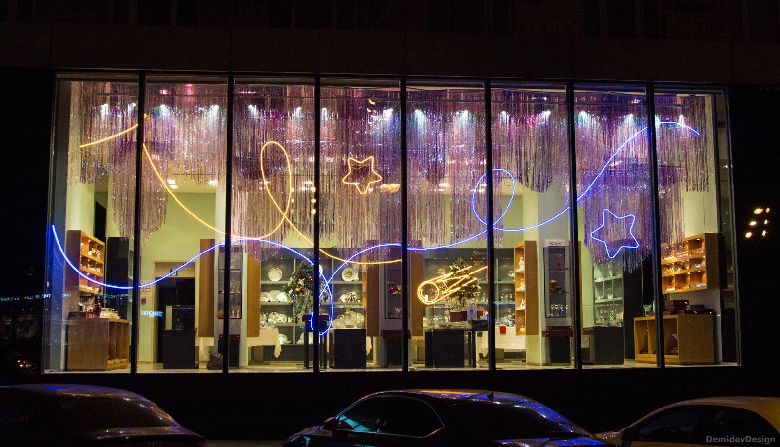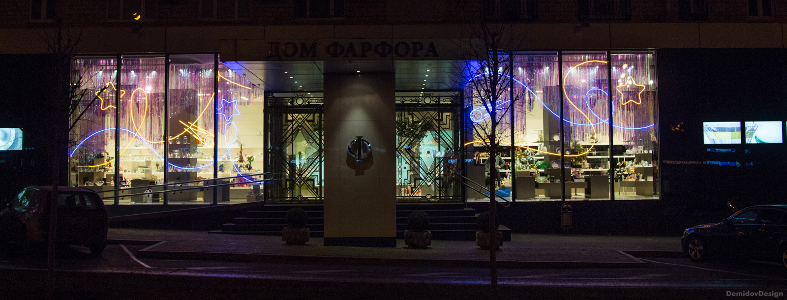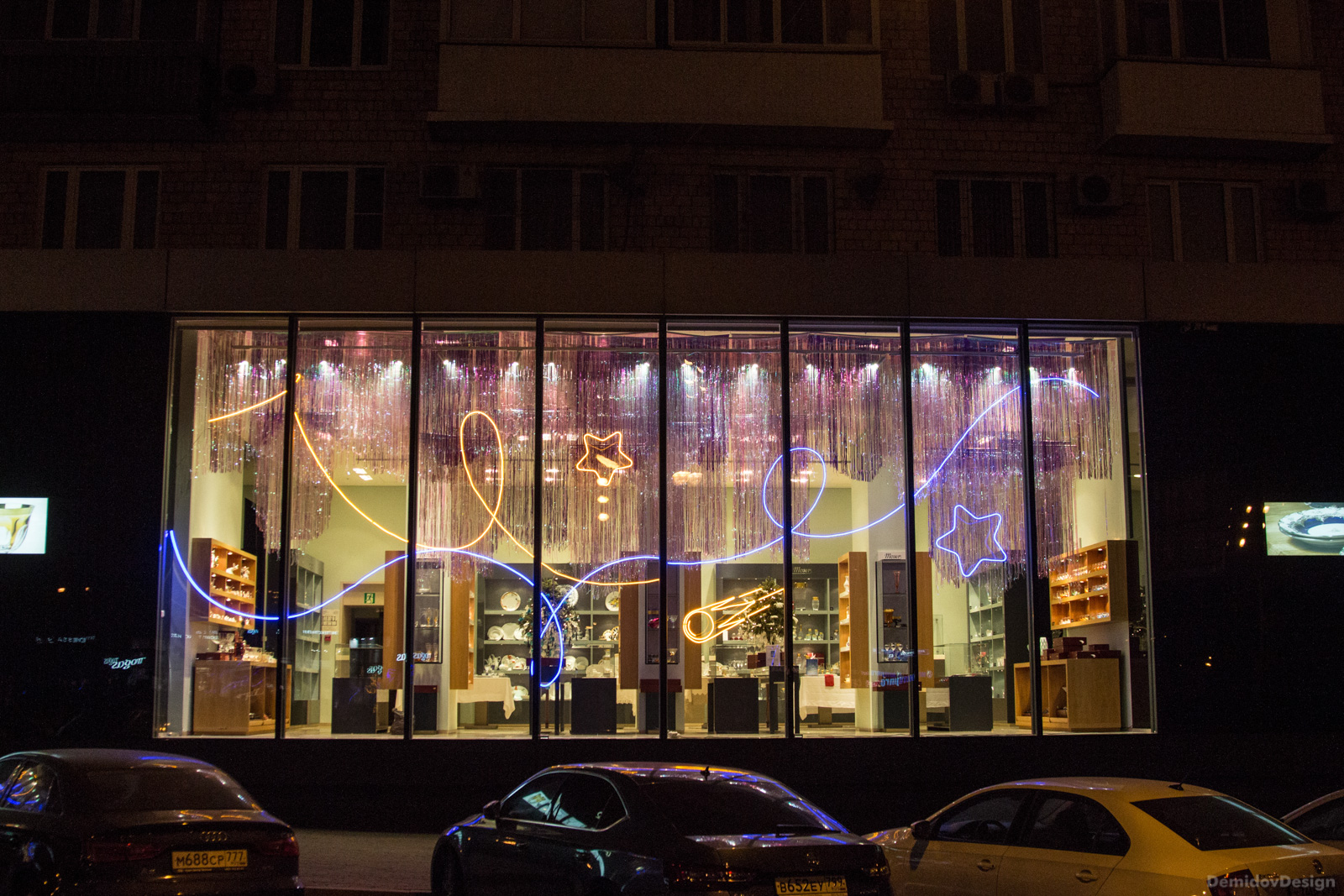 Торговый дом «Дом фарфора» специализируется на эксклюзивных предметах декора. Продуманное оформление для этой компании не просто имидж, а часть концепции бренда. Новогодние витрины хотелось сделать яркими и запоминающимися. Поэтому решили использовать необычные материалы и интересный свет. Фон сделан из нескольких слоев декоративного дождика, а на передний план поставили фигуры, выполненные из гибкого неона на пластиковом каркасе.