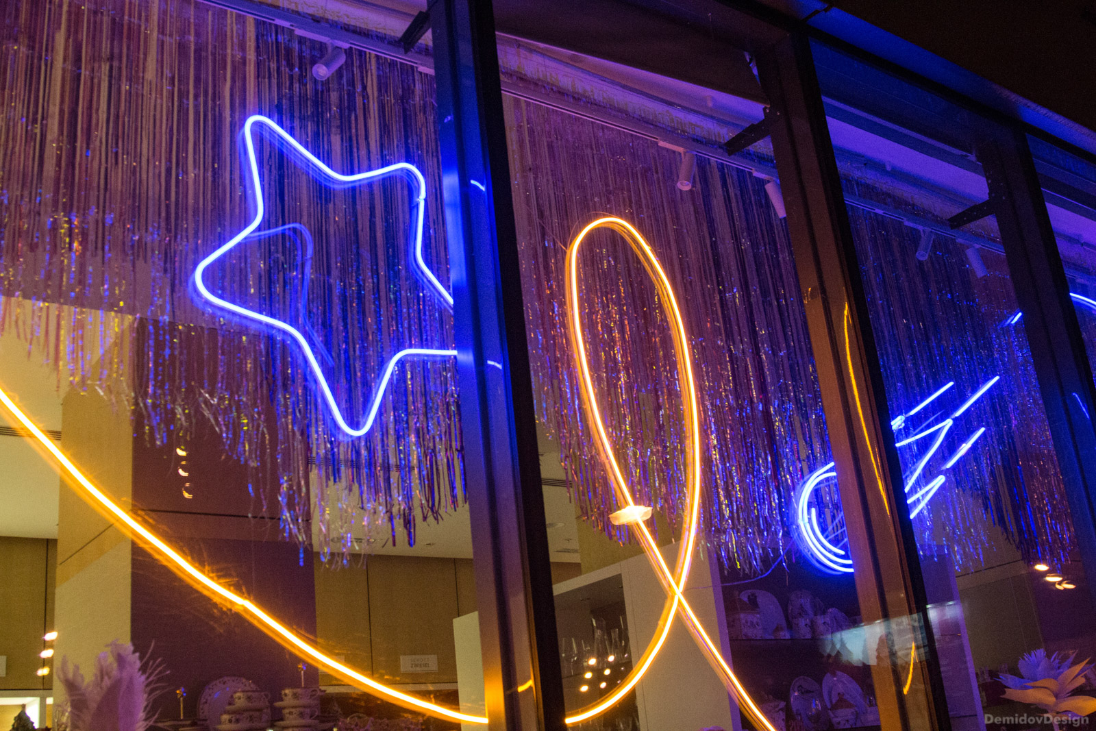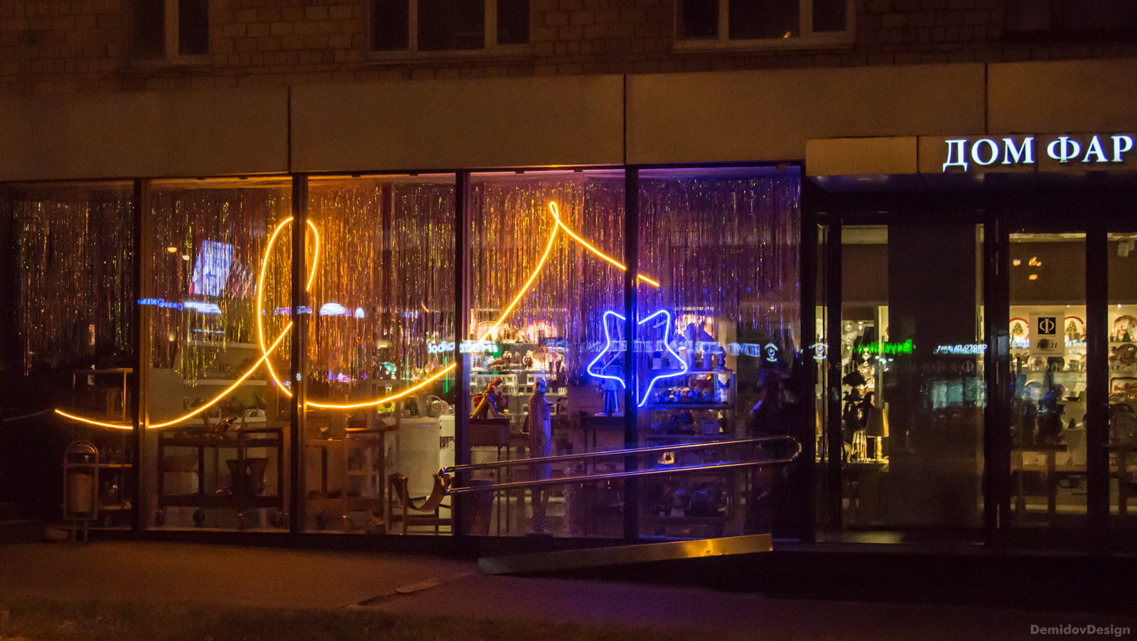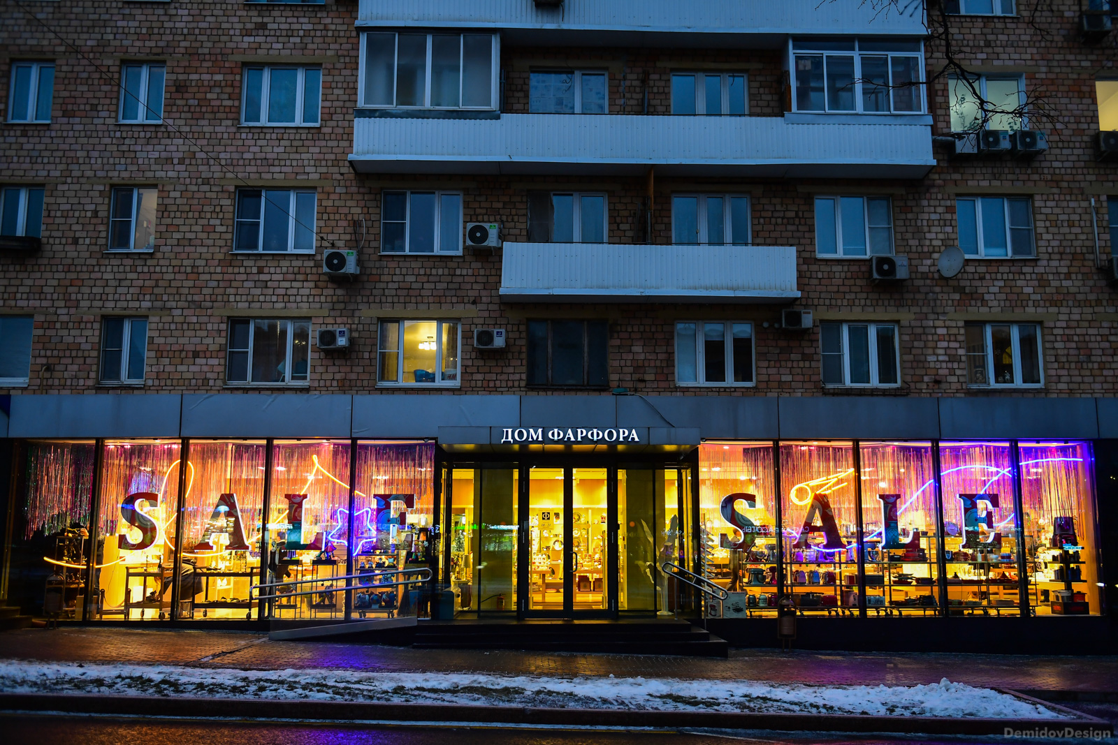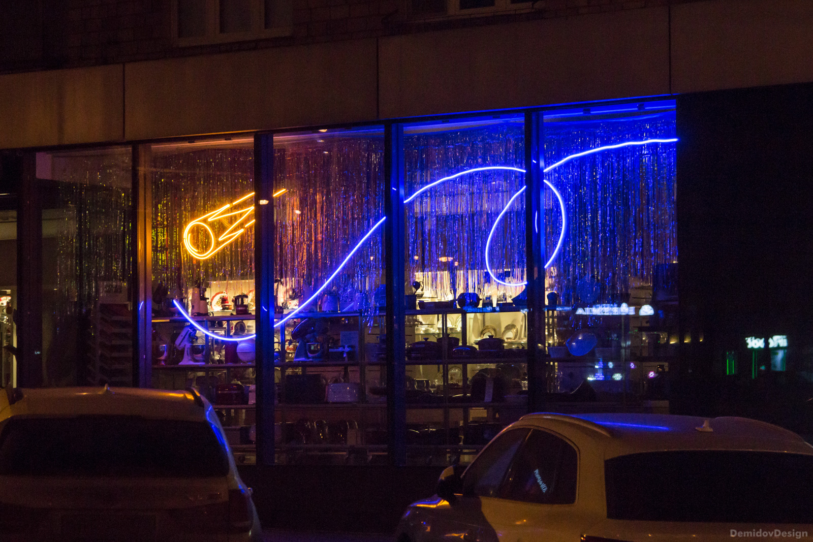 Торговый дом «Дом фарфора» специализируется на эксклюзивных предметах декора. Продуманное оформление для этой компании не просто имидж, а часть концепции бренда. Новогодние витрины хотелось сделать яркими и запоминающимися. Поэтому решили использовать необычные материалы и интересный свет. Фон сделан из нескольких слоев декоративного дождика, а на передний план поставили фигуры, выполненные из гибкого неона на пластиковом каркасе.