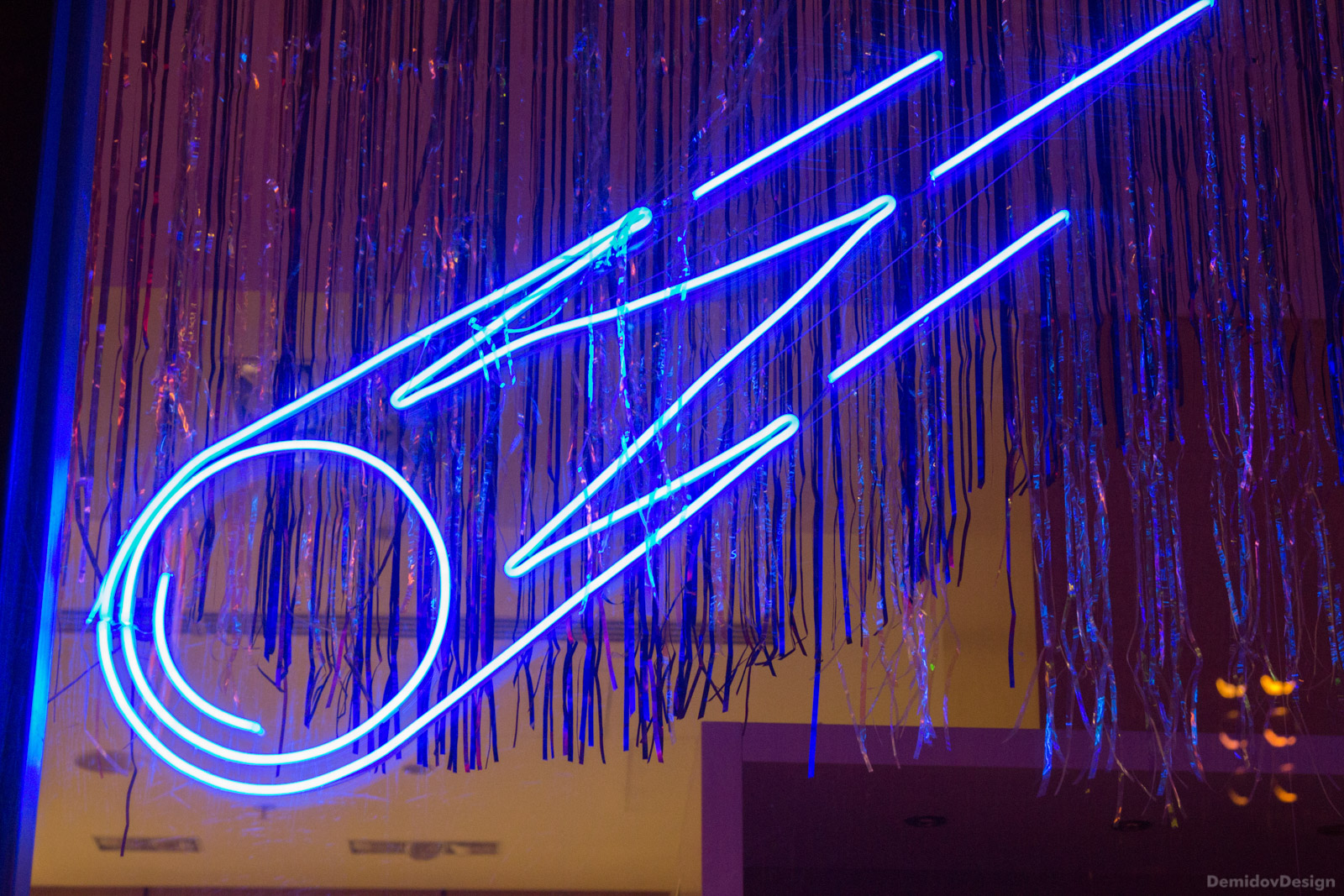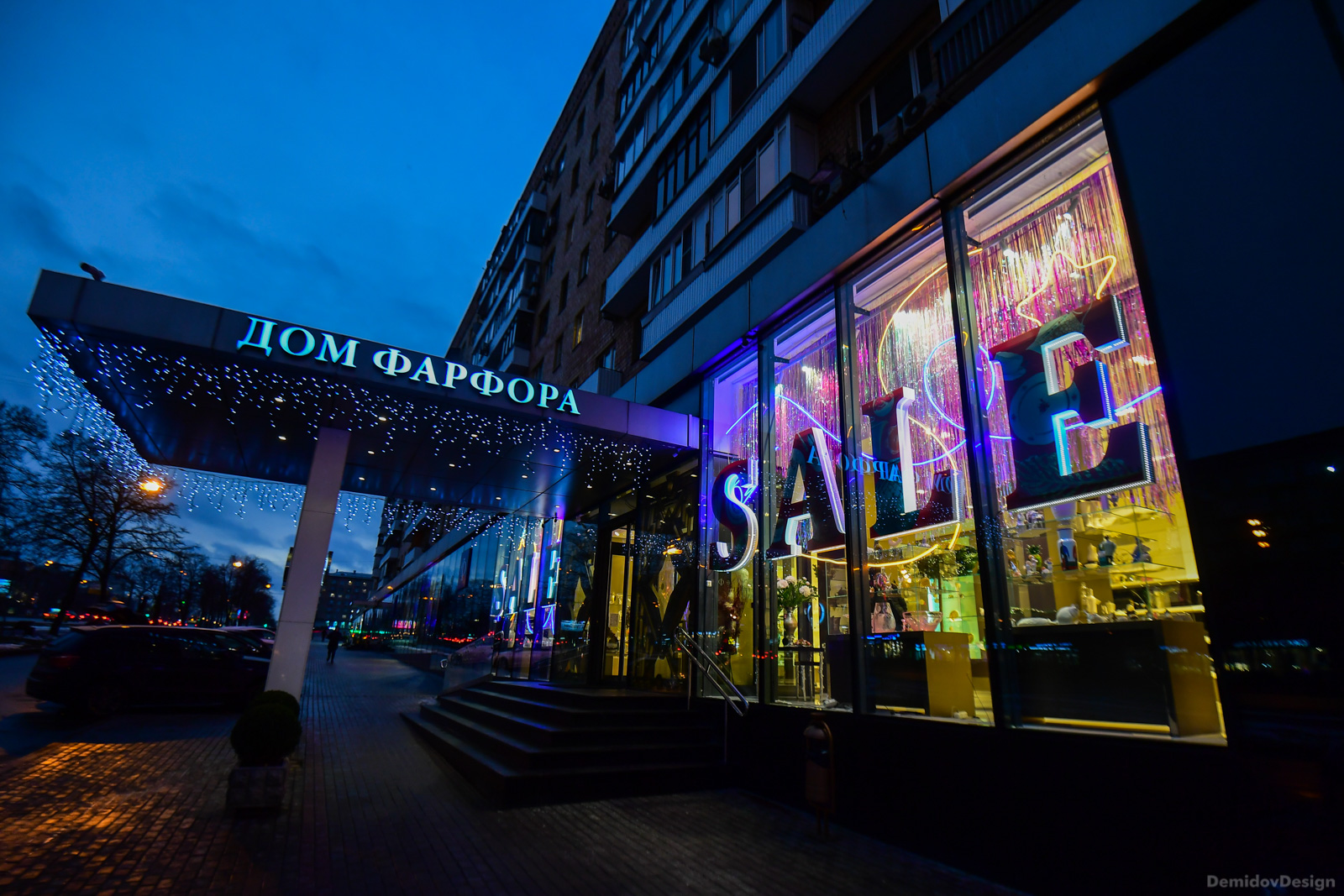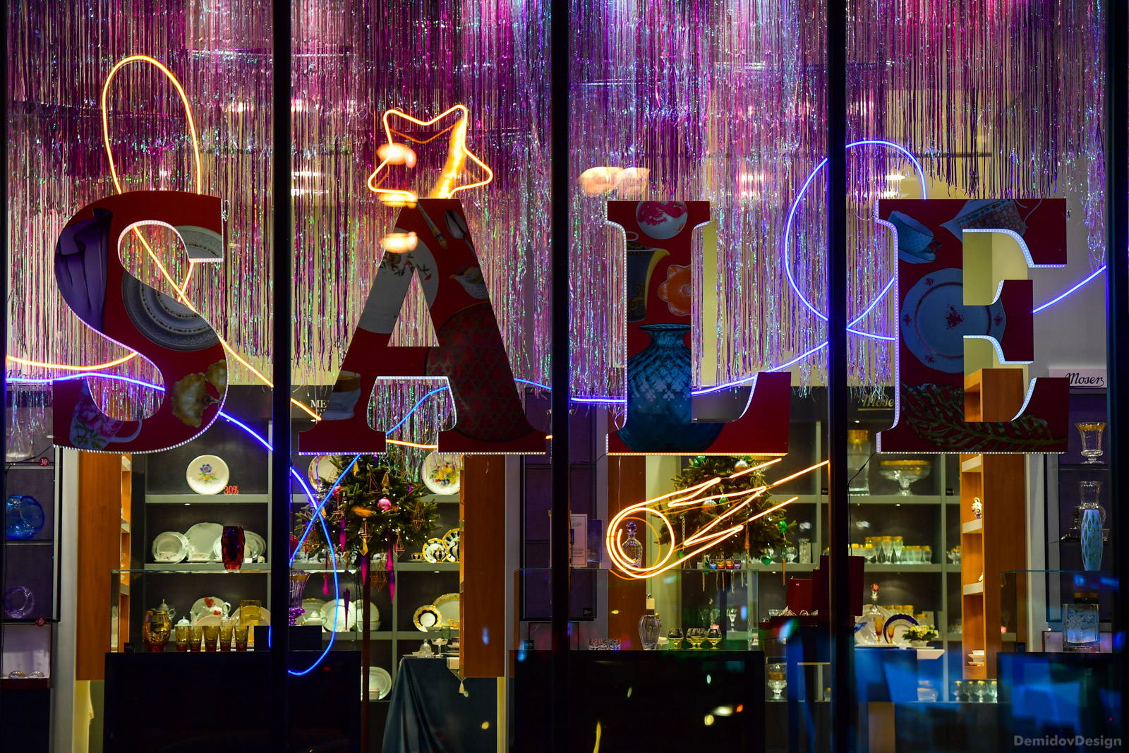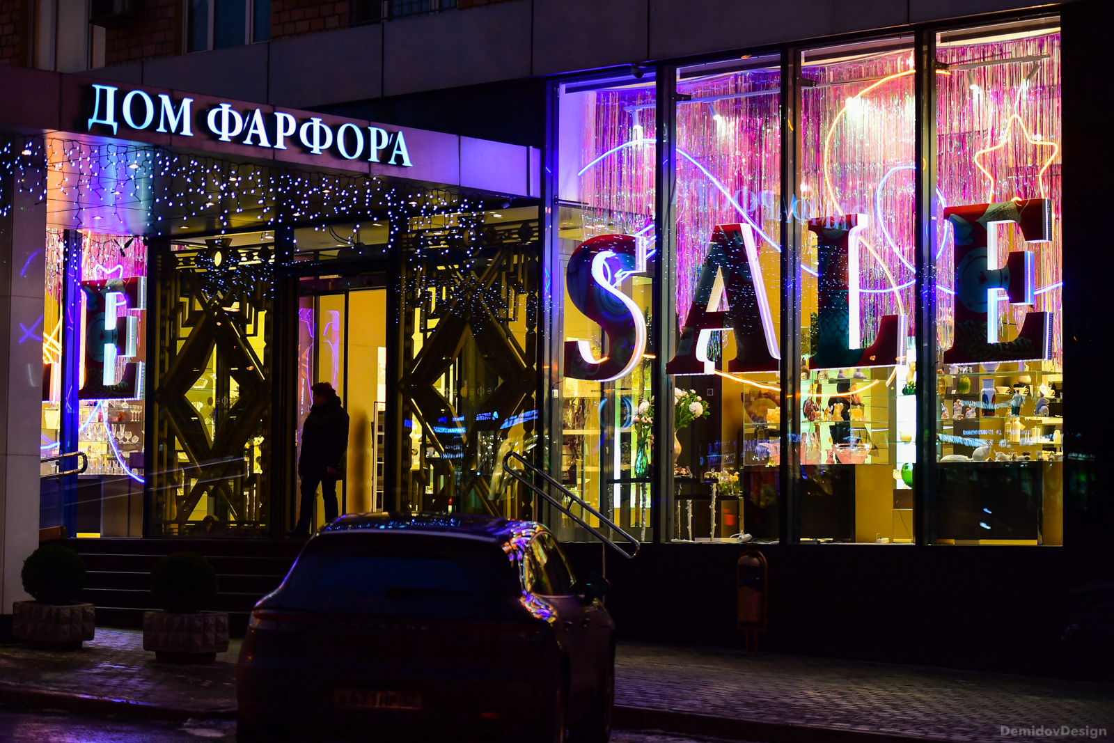 Торговый дом «Дом фарфора» специализируется на эксклюзивных предметах декора. Продуманное оформление для этой компании не просто имидж, а часть концепции бренда. Новогодние витрины хотелось сделать яркими и запоминающимися. Поэтому решили использовать необычные материалы и интересный свет. Фон сделан из нескольких слоев декоративного дождика, а на передний план поставили фигуры, выполненные из гибкого неона на пластиковом каркасе.