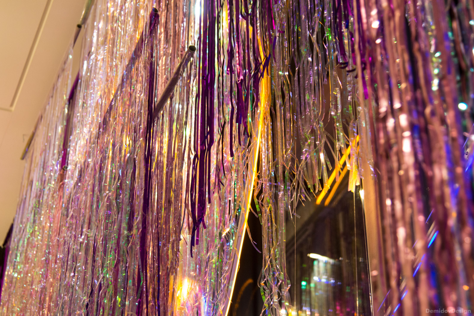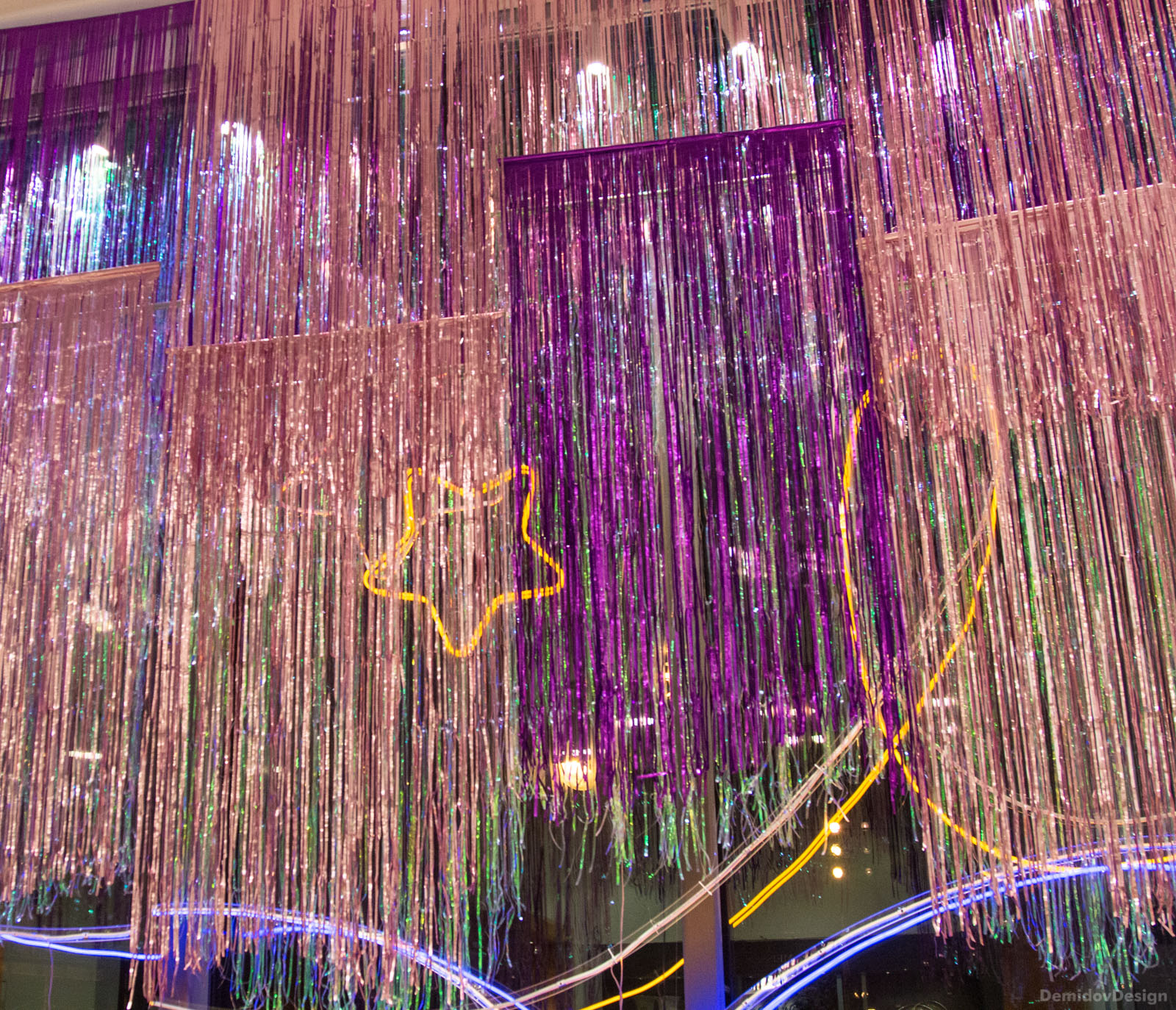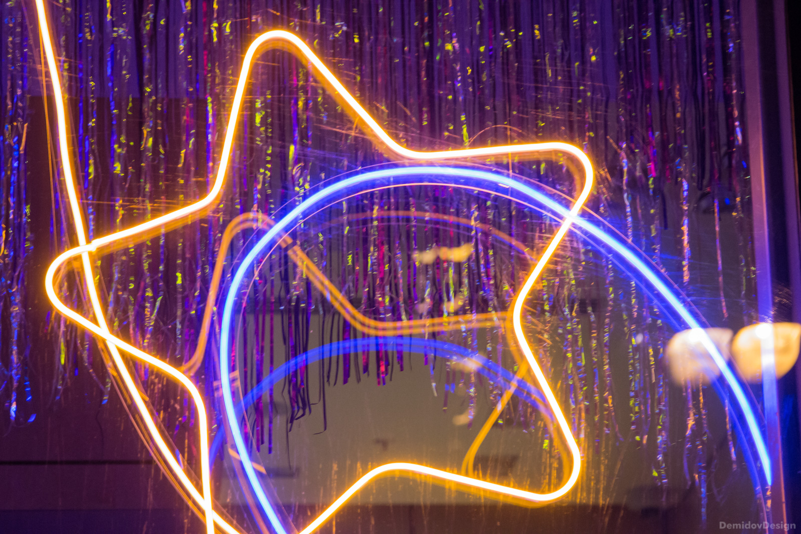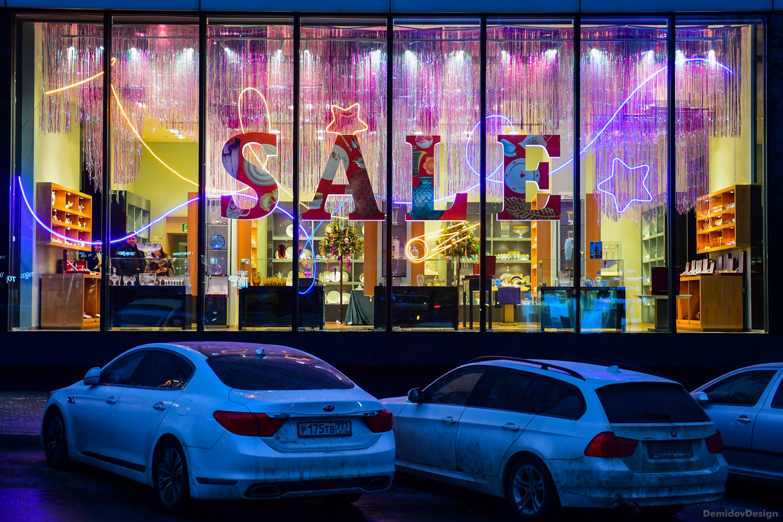 Торговый дом «Дом фарфора» специализируется на эксклюзивных предметах декора. Продуманное оформление для этой компании не просто имидж, а часть концепции бренда. Новогодние витрины хотелось сделать яркими и запоминающимися. Поэтому решили использовать необычные материалы и интересный свет. Фон сделан из нескольких слоев декоративного дождика, а на передний план поставили фигуры, выполненные из гибкого неона на пластиковом каркасе.