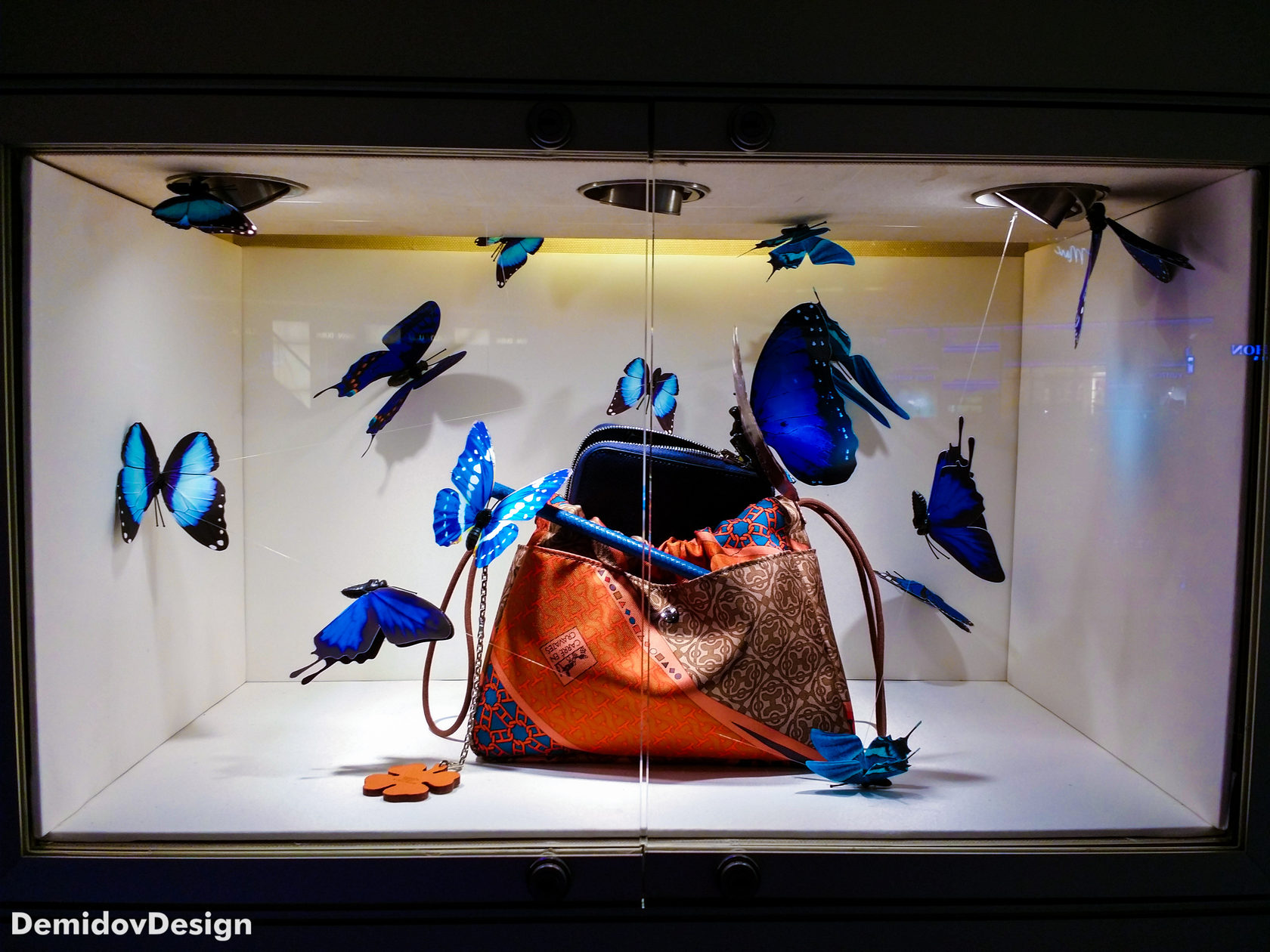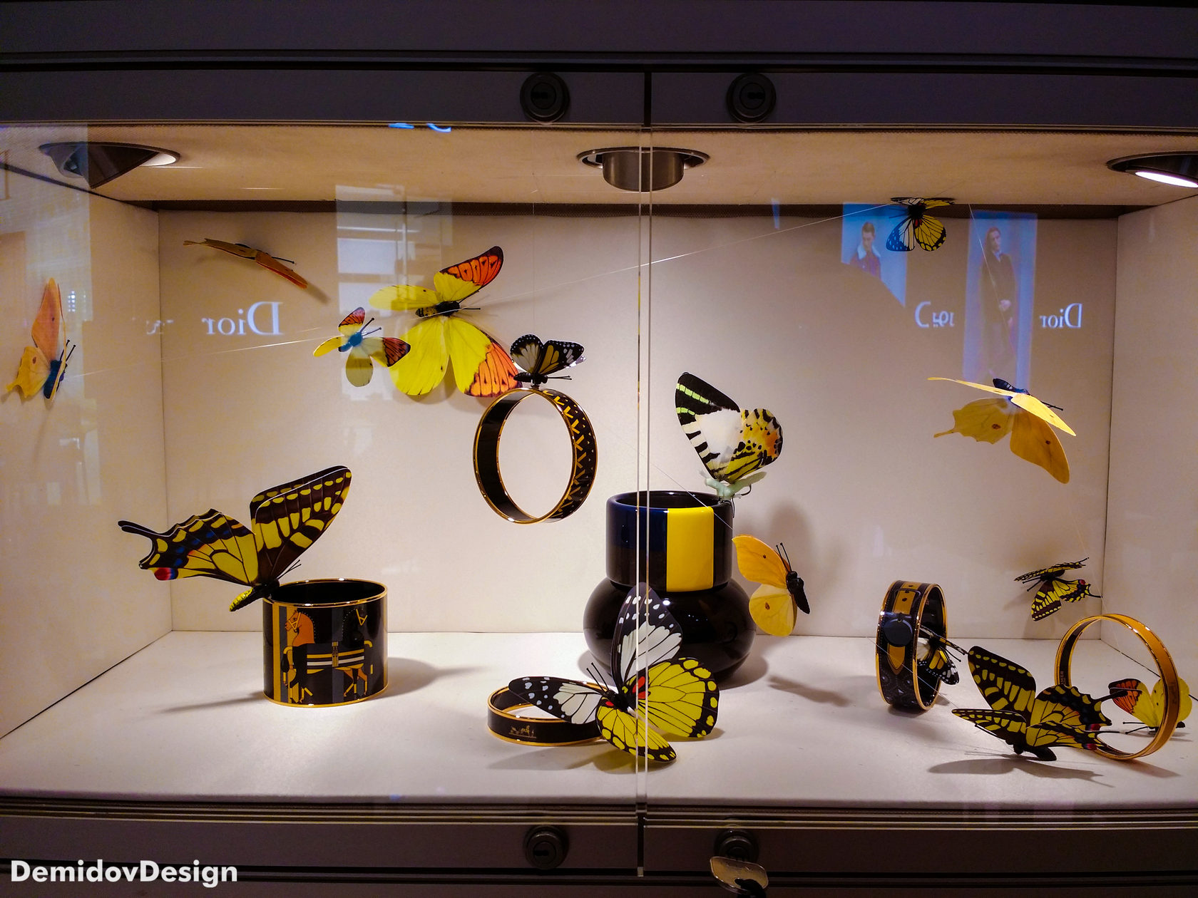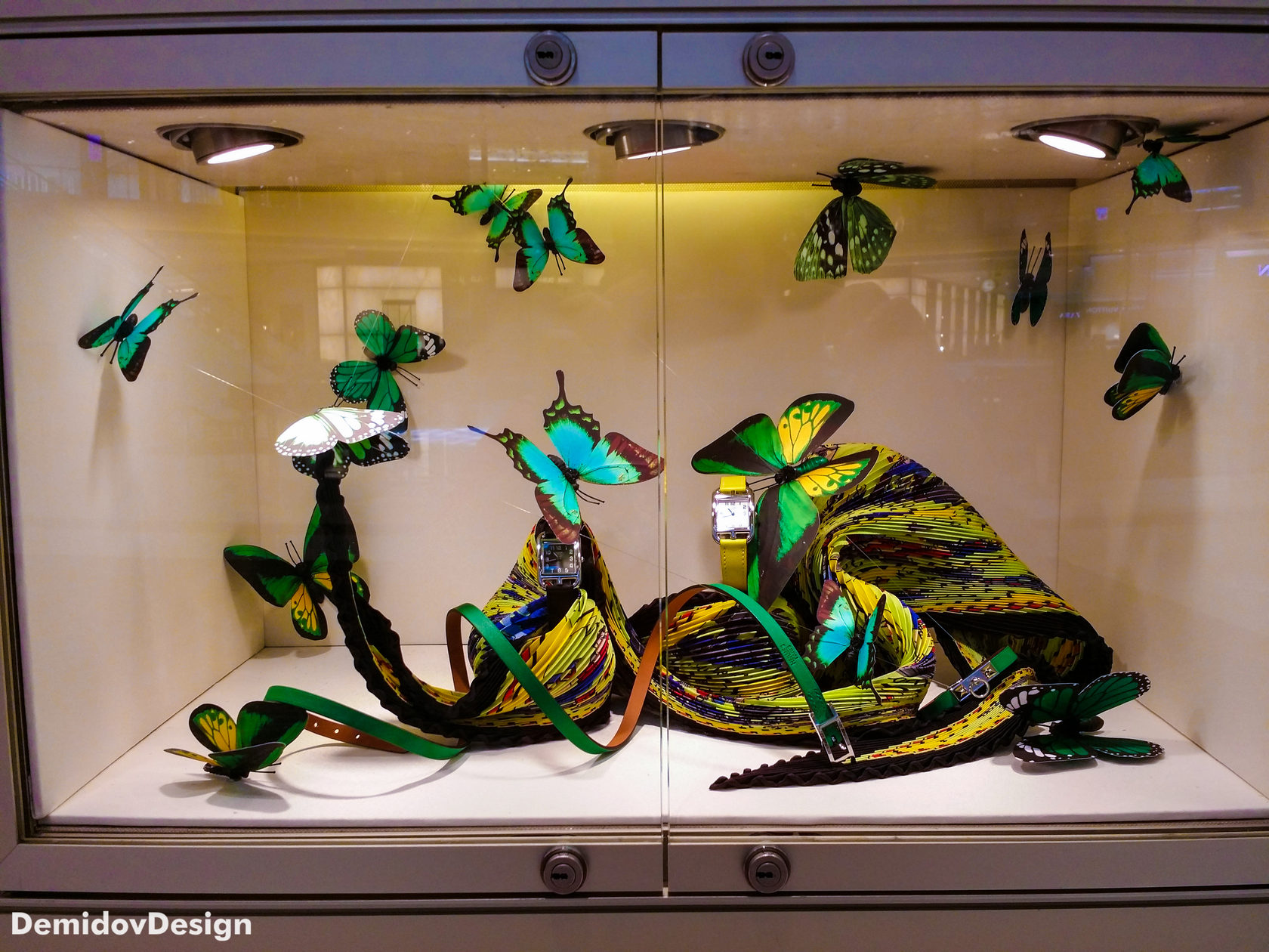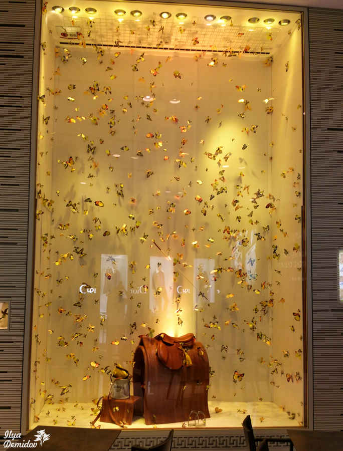 Весенняя витрина для бутика Hermes в Дубай Молле, ОАЭ. Витрина выполнена из сотен цветных бабочек. Некоторые бабочки имеют электрический механизм и машут крыльями. Яркая цветная LED подсветка придает инсталляции особую атмосферу.