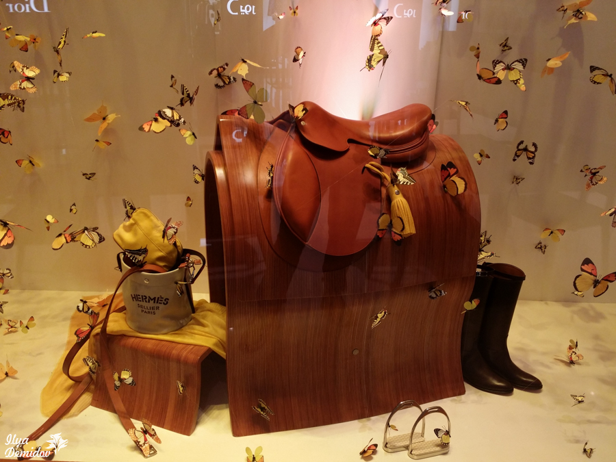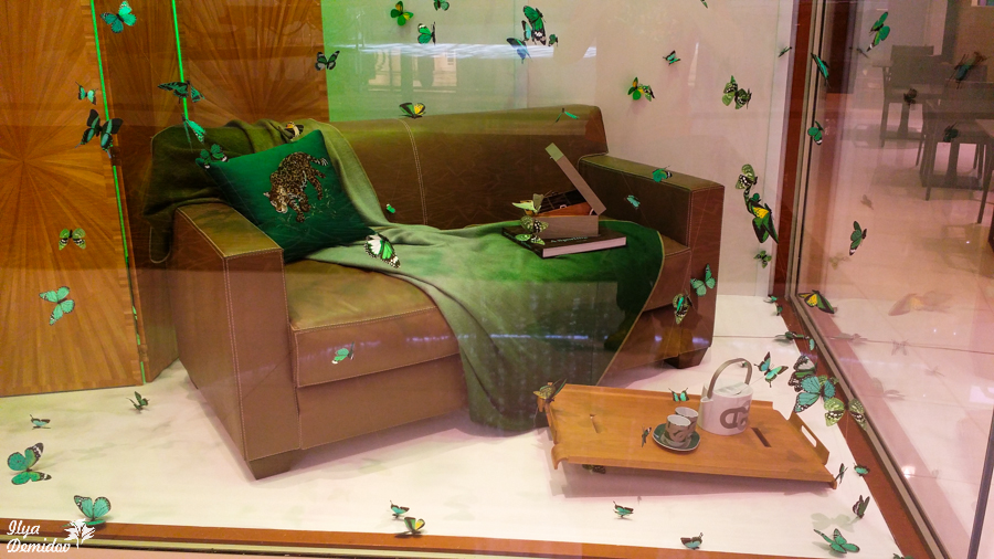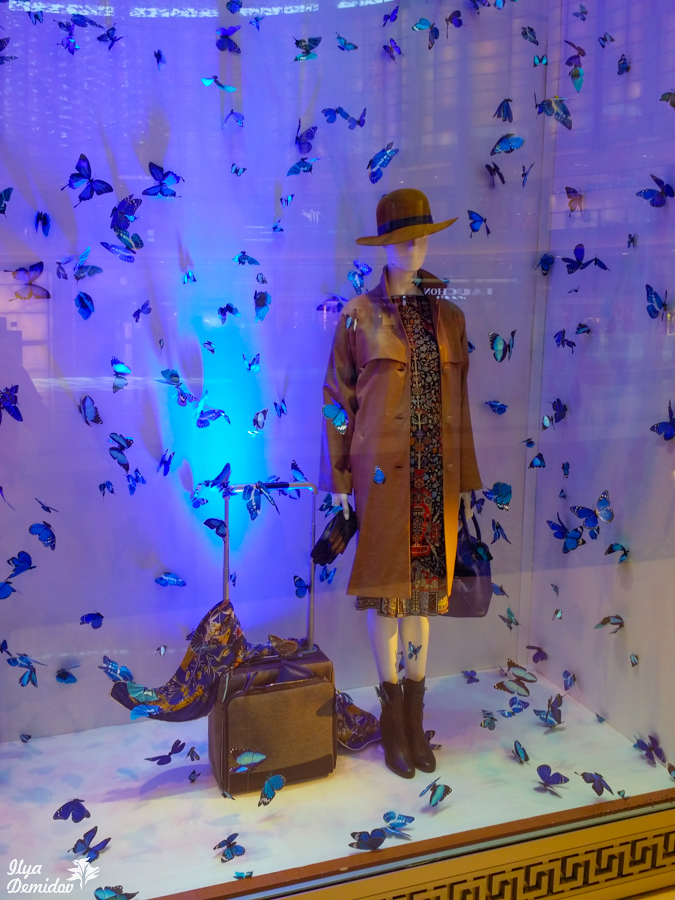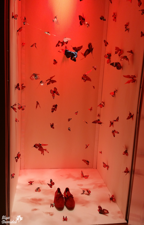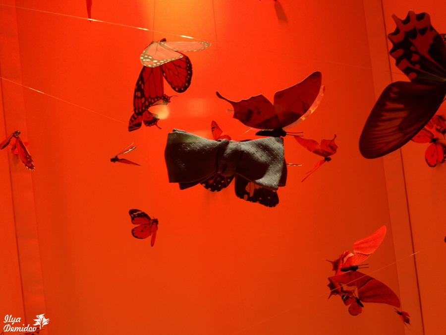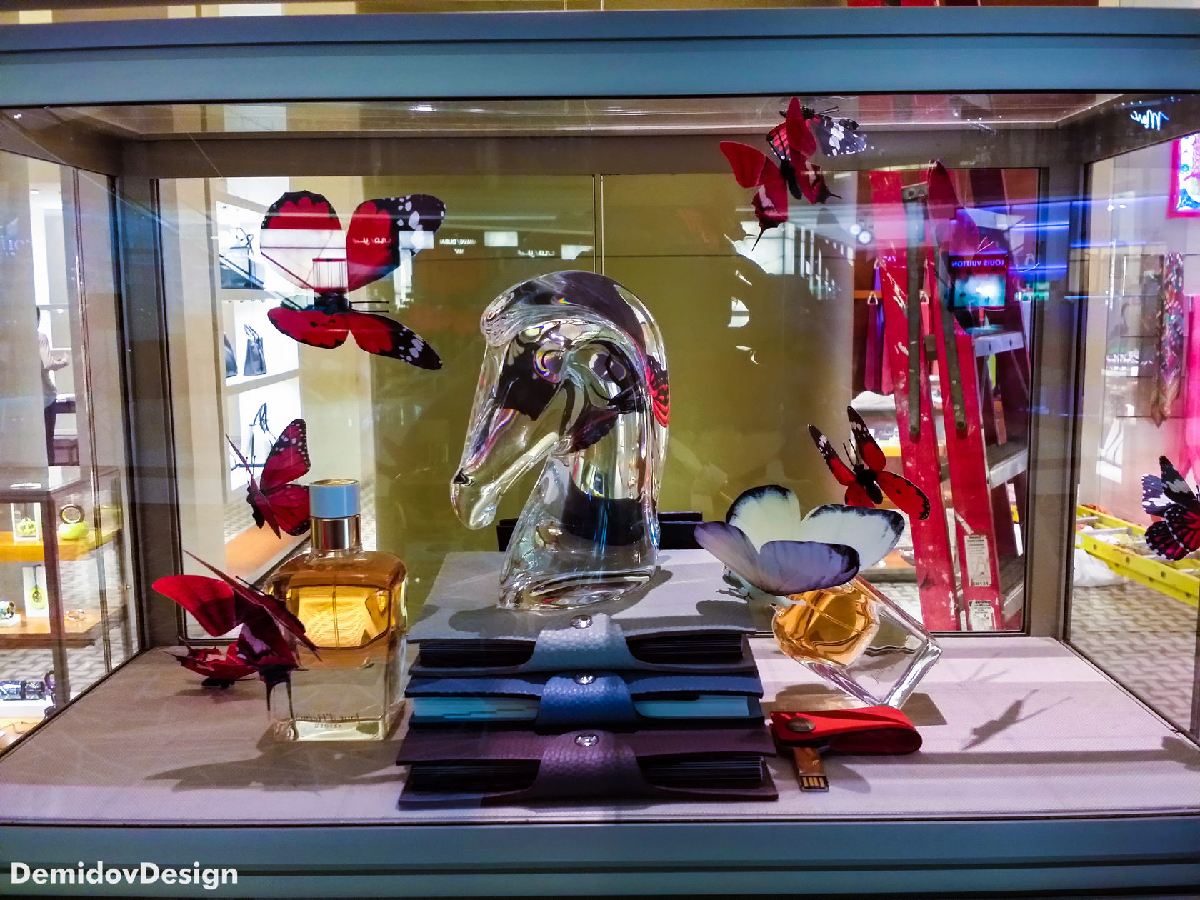 Весенняя витрина для бутика Hermes в Дубай Молле, ОАЭ. Витрина выполнена из сотен цветных бабочек. Некоторые бабочки имеют электрический механизм и машут крыльями. Яркая цветная LED подсветка придает инсталляции особую атмосферу.