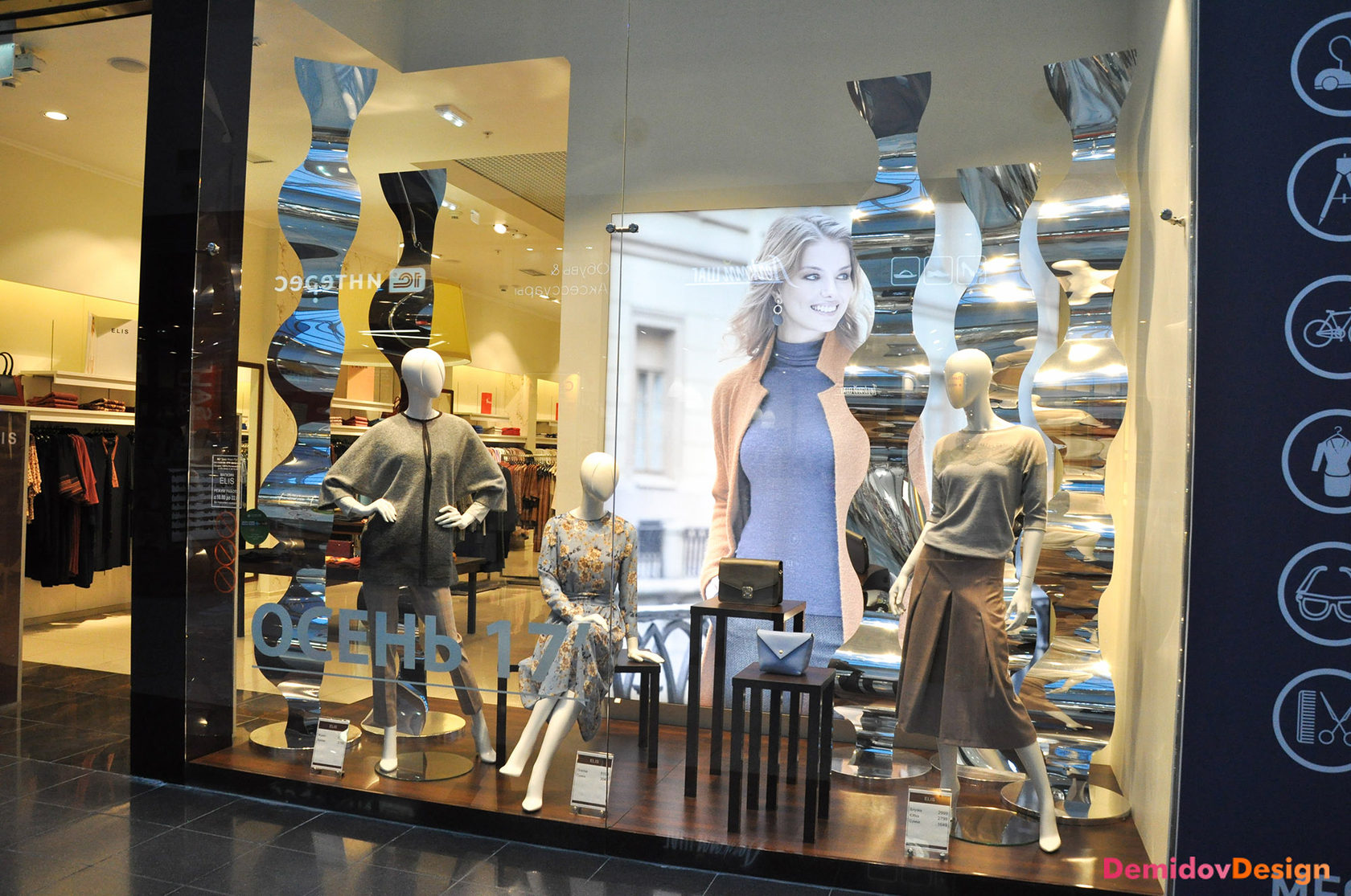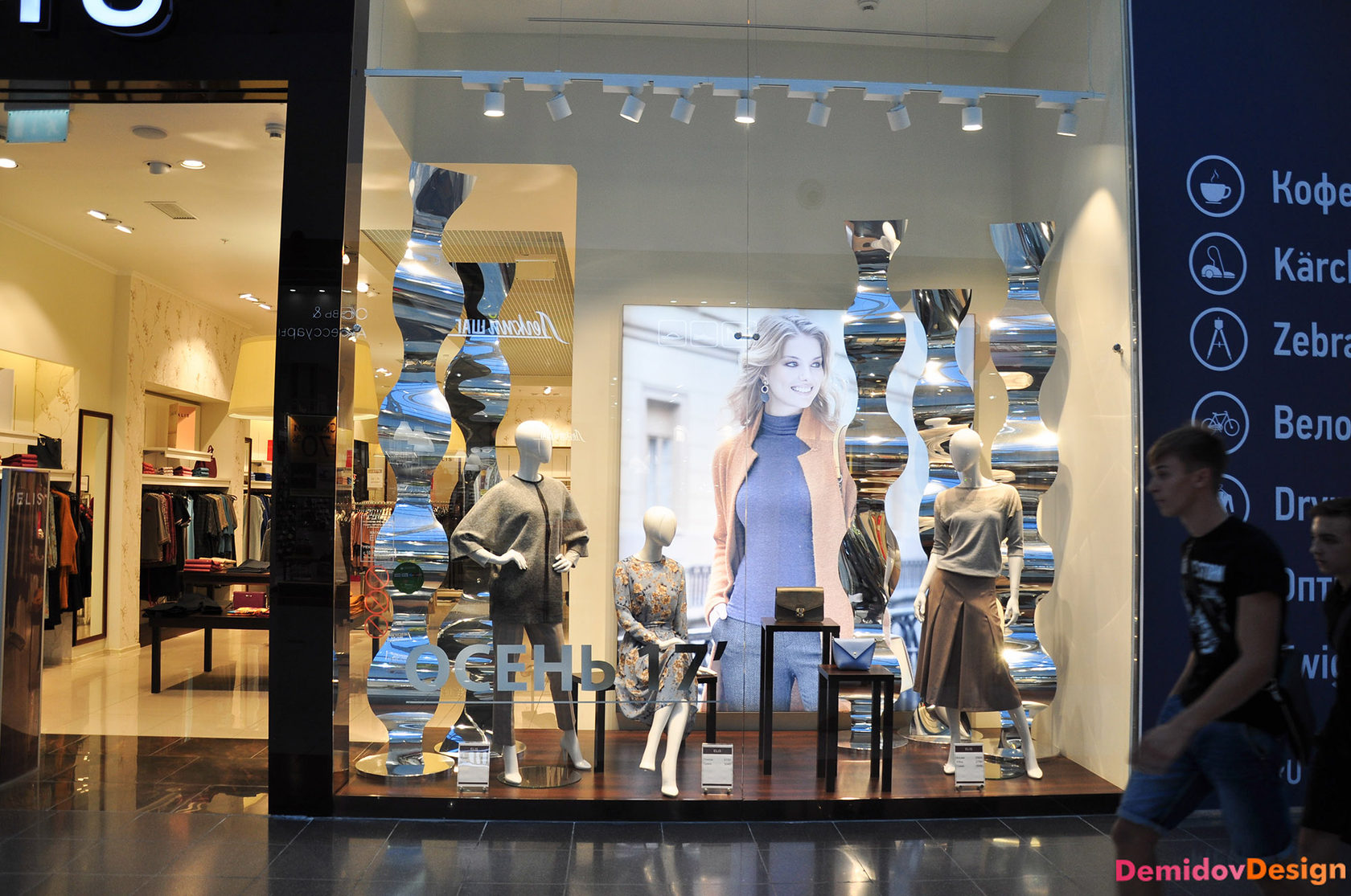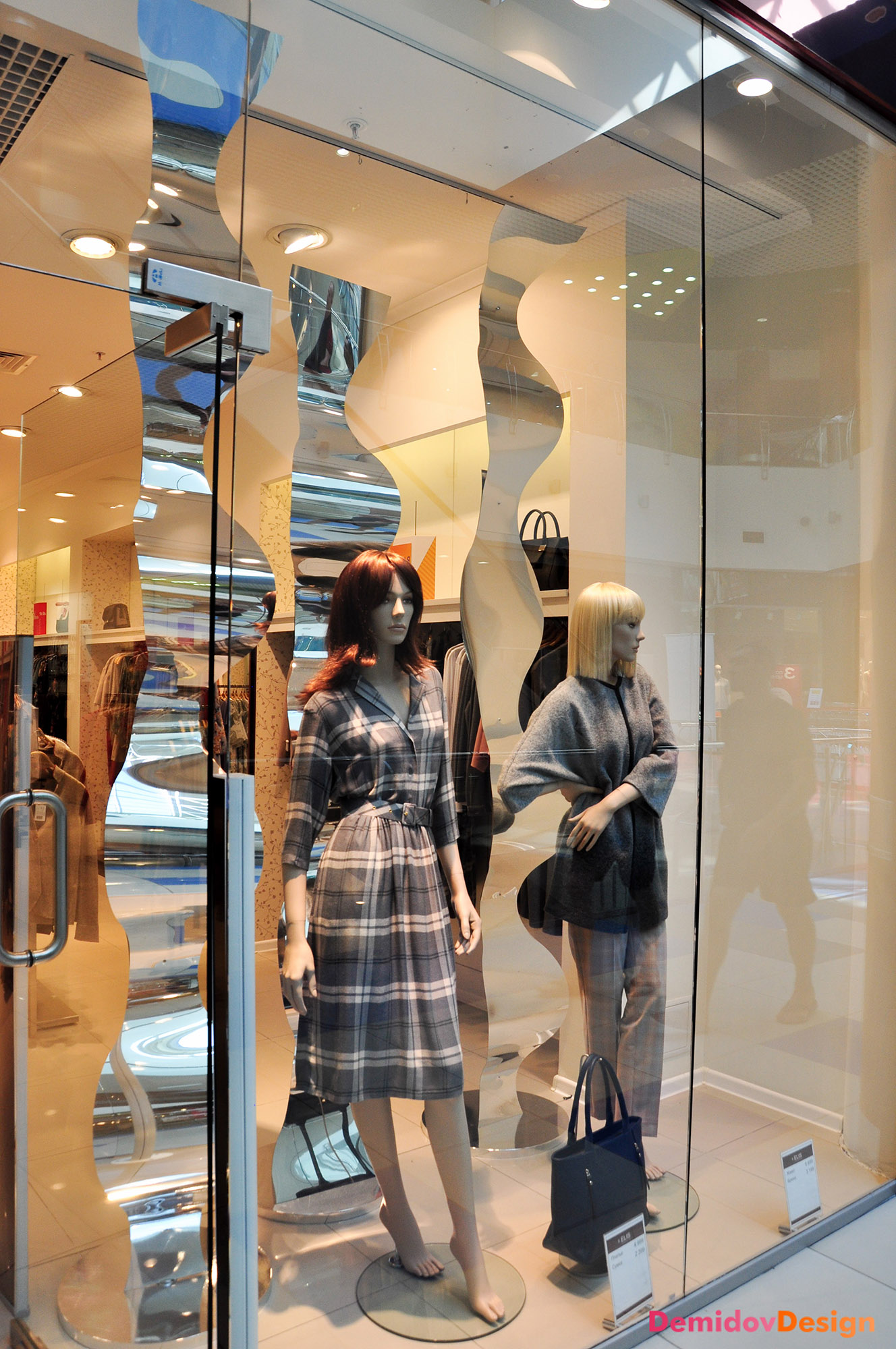 Объемные зеркальные фигуры создают множество отражений и бликов внутри витрин.