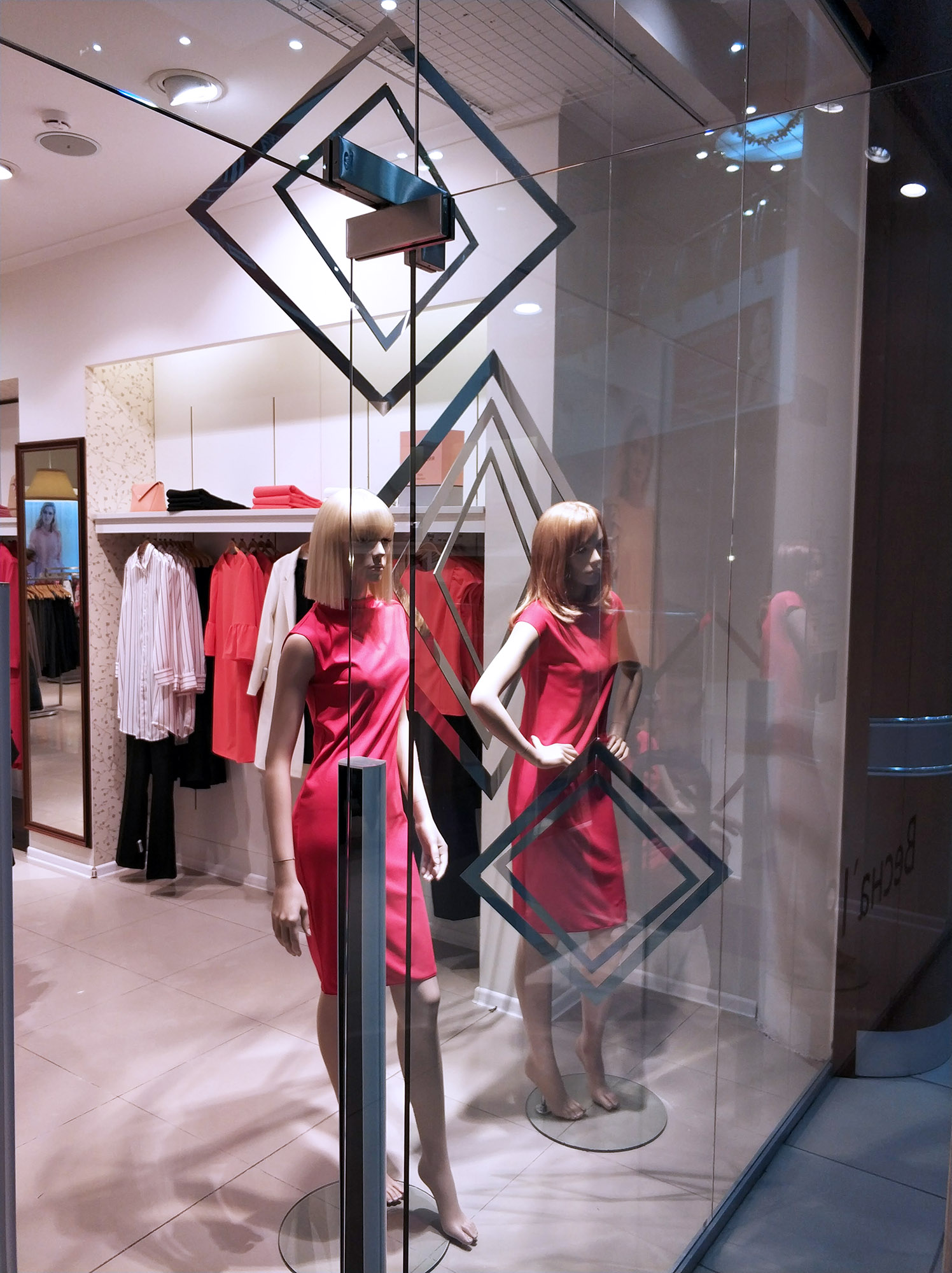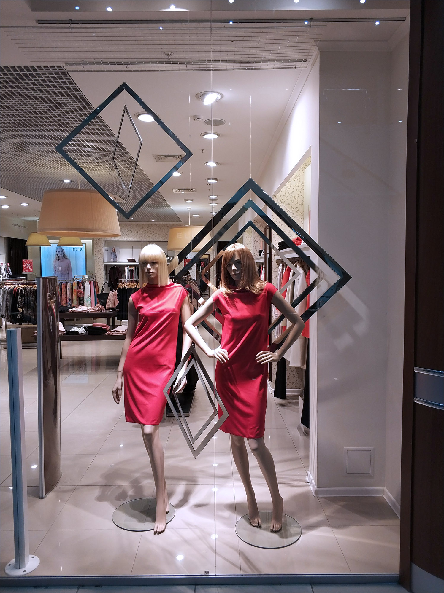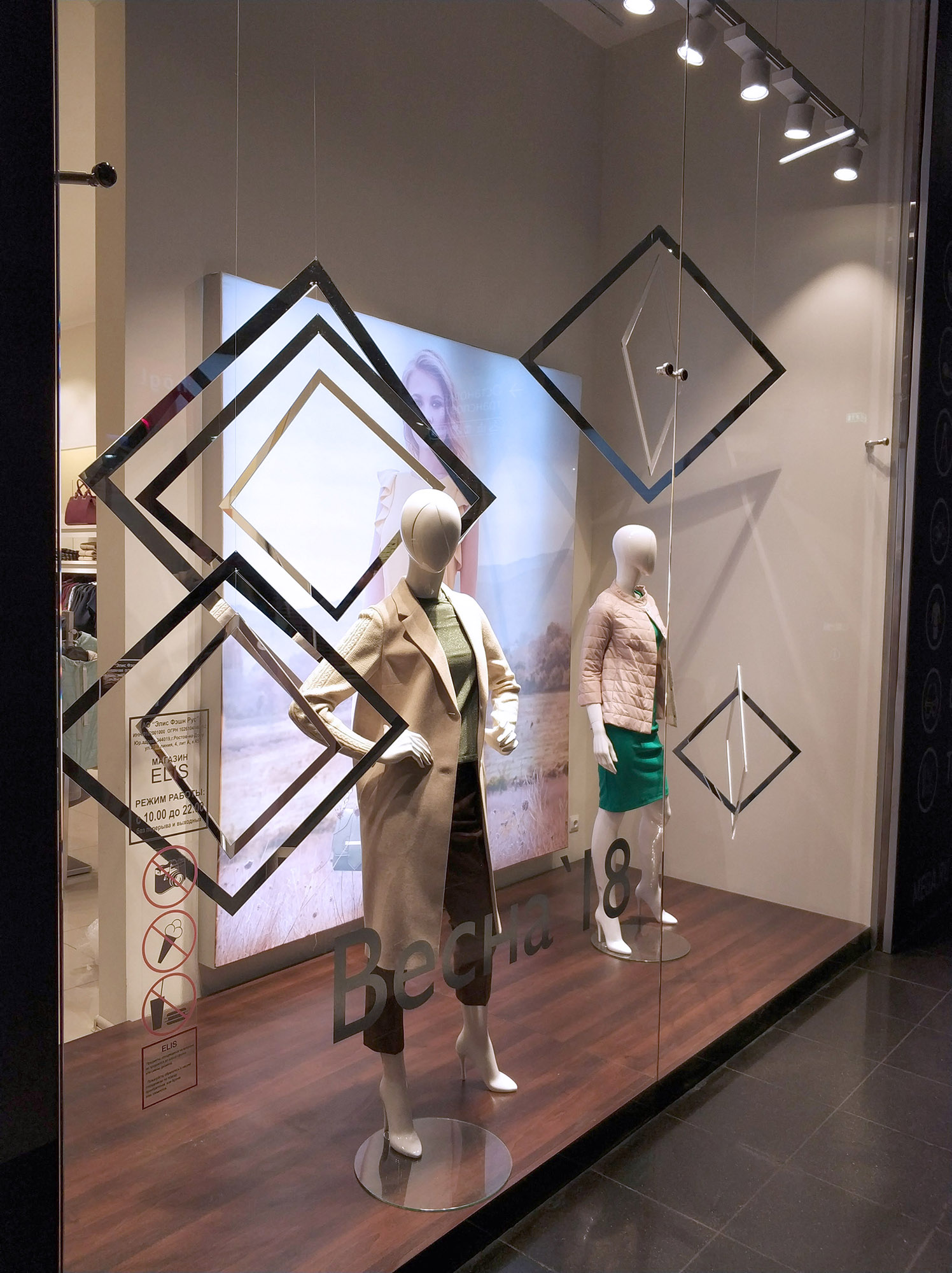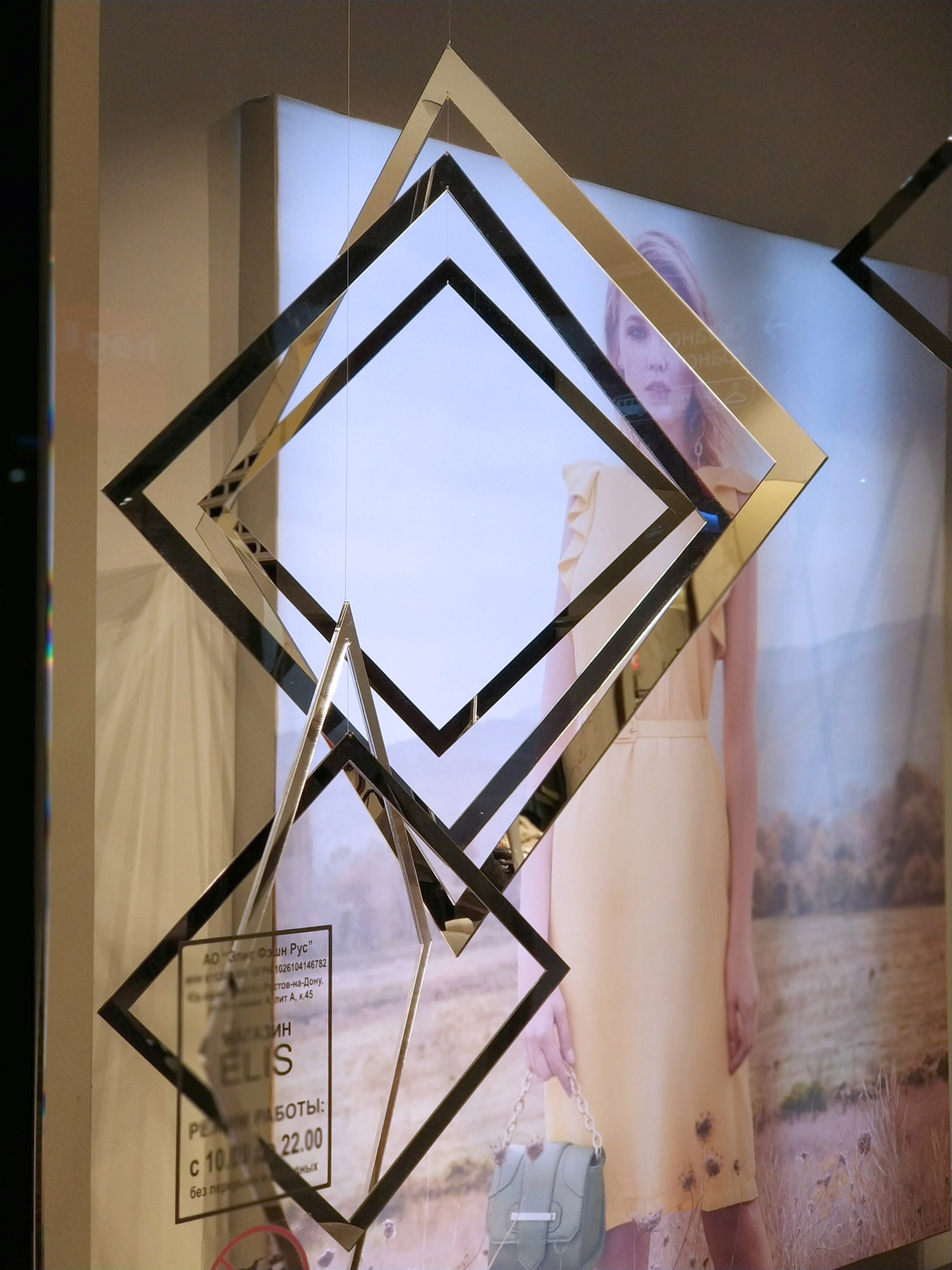 Бюджетное минималистичное оформление для крупной сети магазинов. Фигуры выполнены из зеркального пластика и подвешены в пространстве витрины.