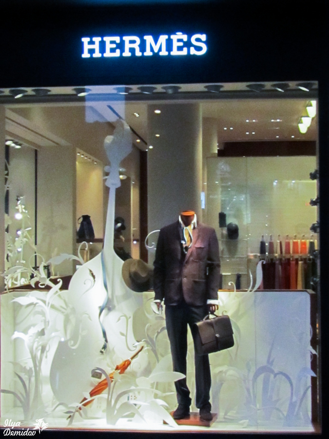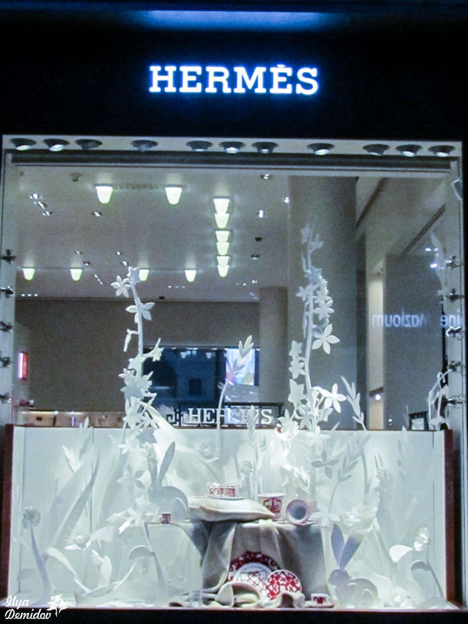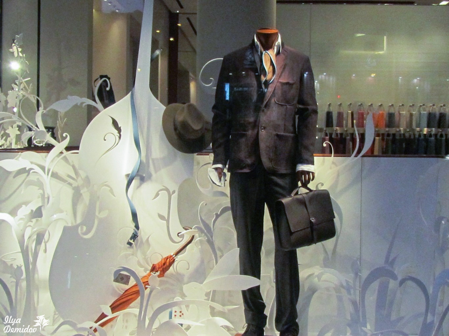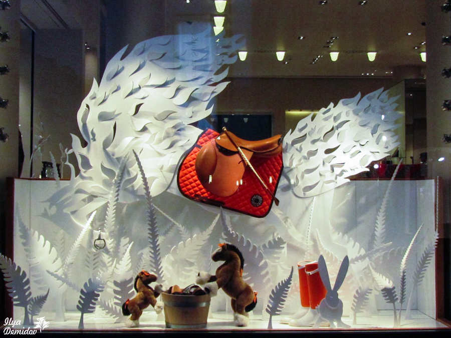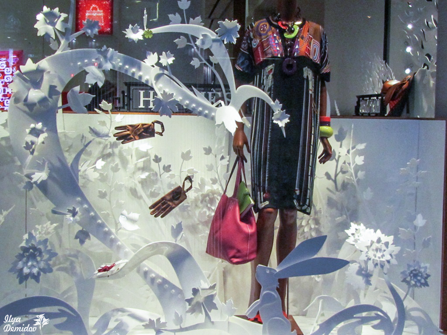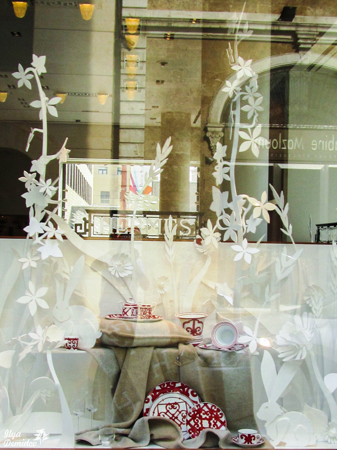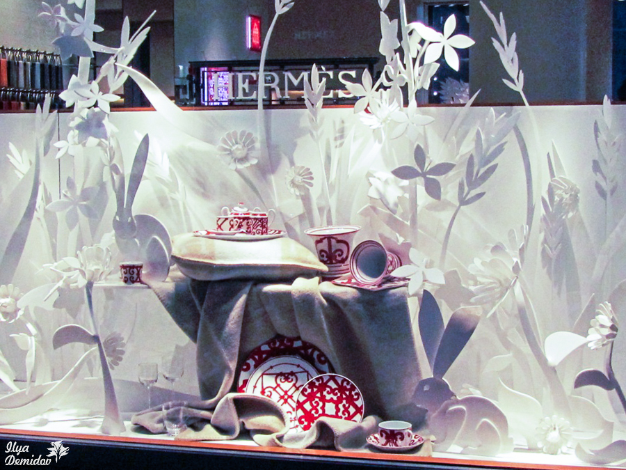 Оформление витрины выполнено из множества белых растений и цветов, которые принимают причудливые формы: качели, контрабас и силуэт лошади. Все декорации выполнены из глянцевого пластика.