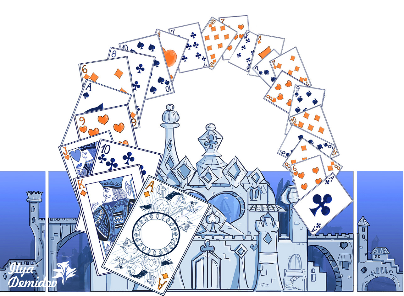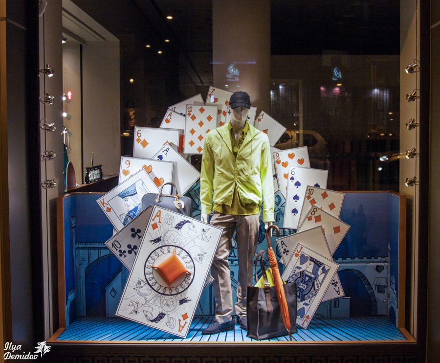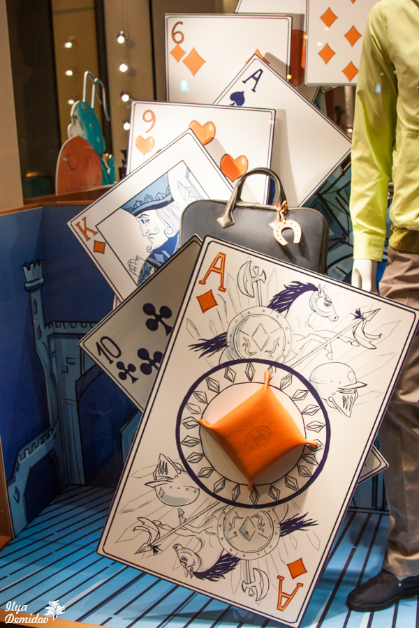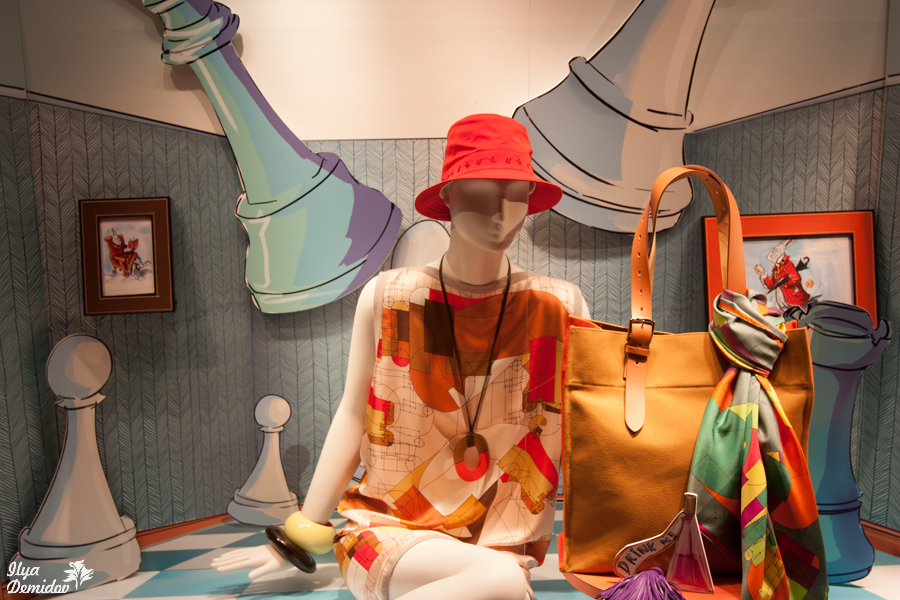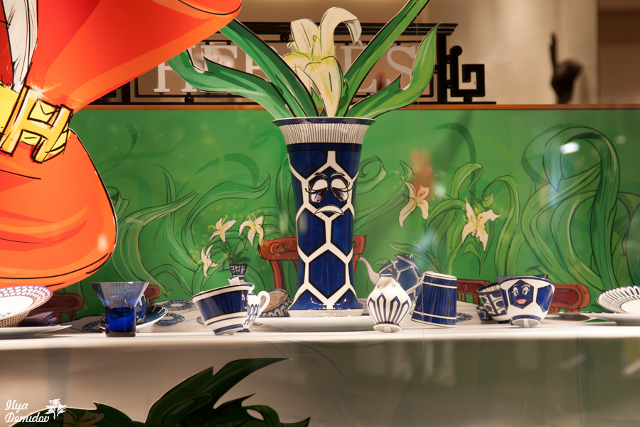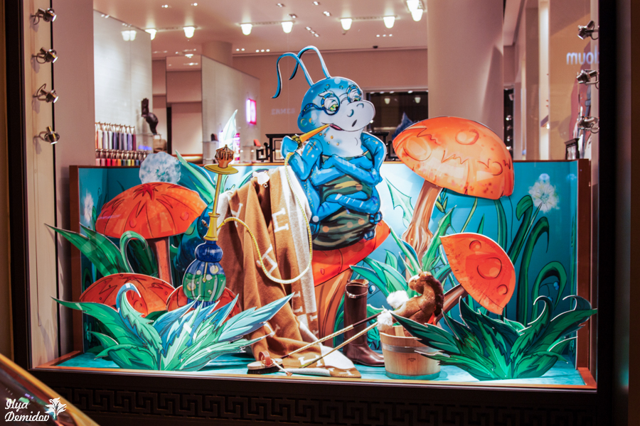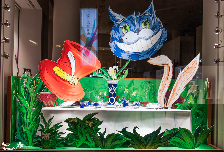 Яркая весенняя витрина, выполненная в стиле иллюстраций к книге "Алиса в Стране чудес".
