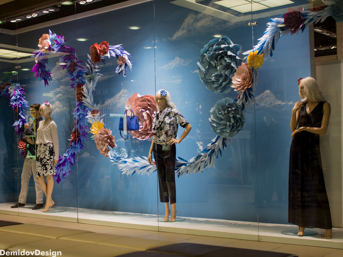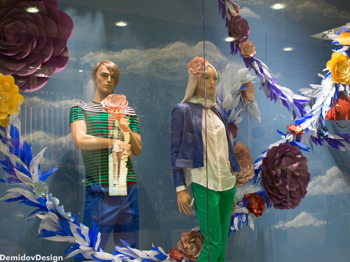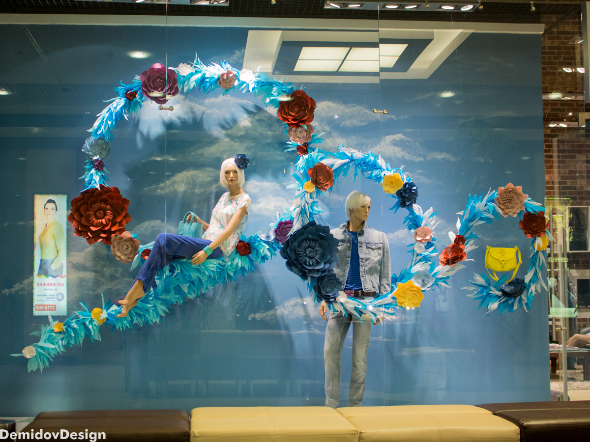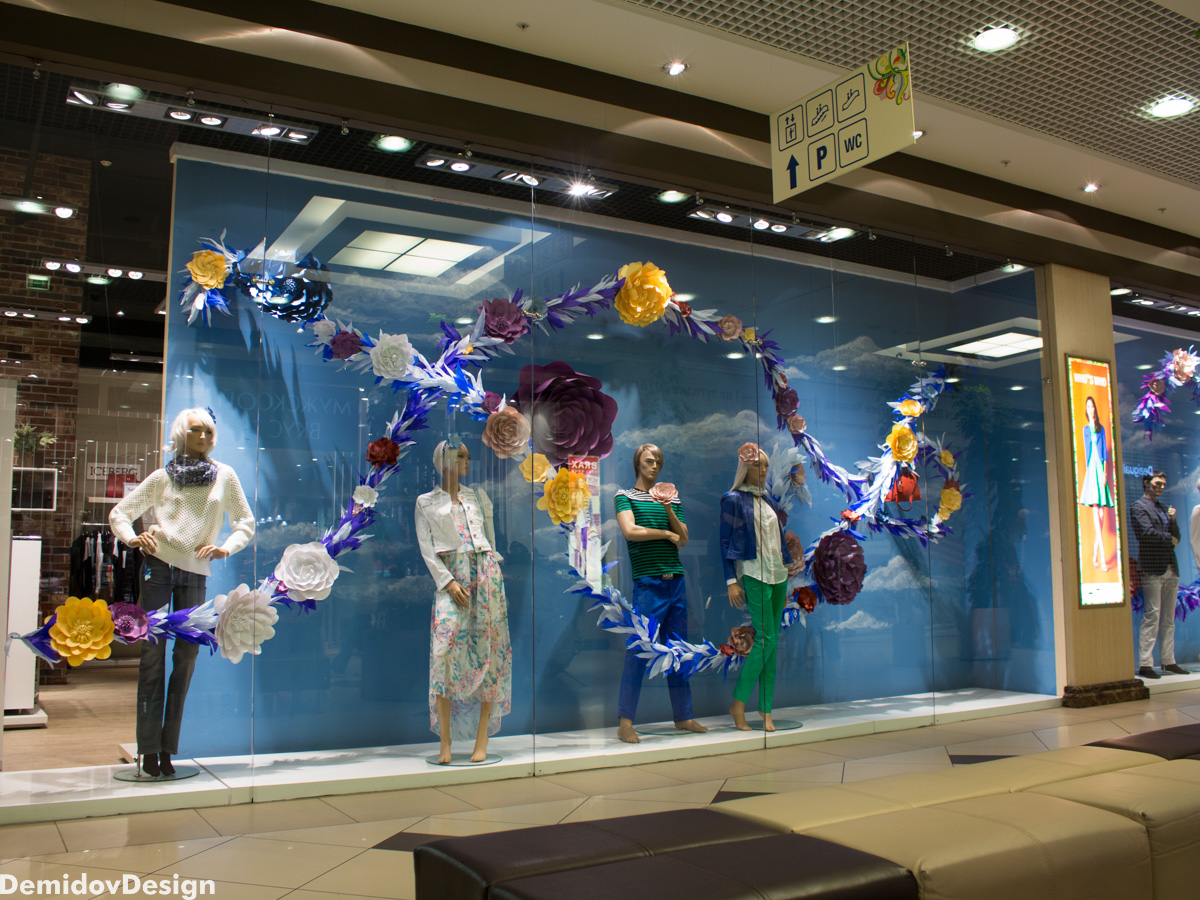 Весенняя витрина для бутика модной одежды +IT. Огромный плющ переходит из витрины в витрину, окрашивая пространство в весенние цвета. Все элементы витрины, включая роспись стен, выполнены вручную.