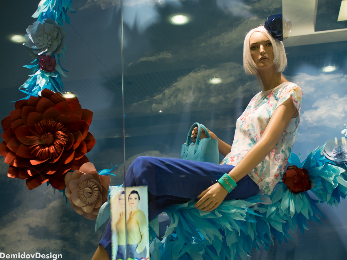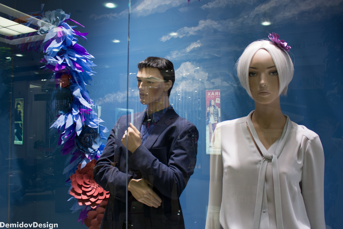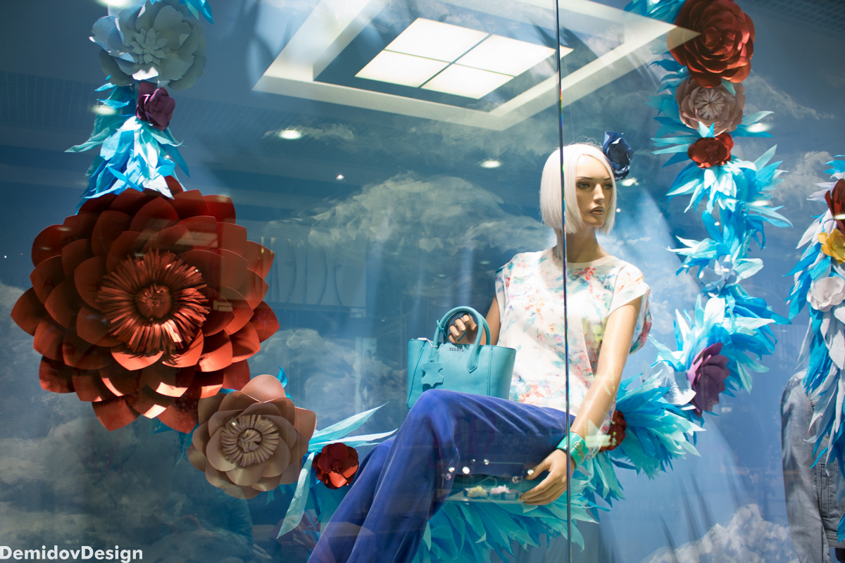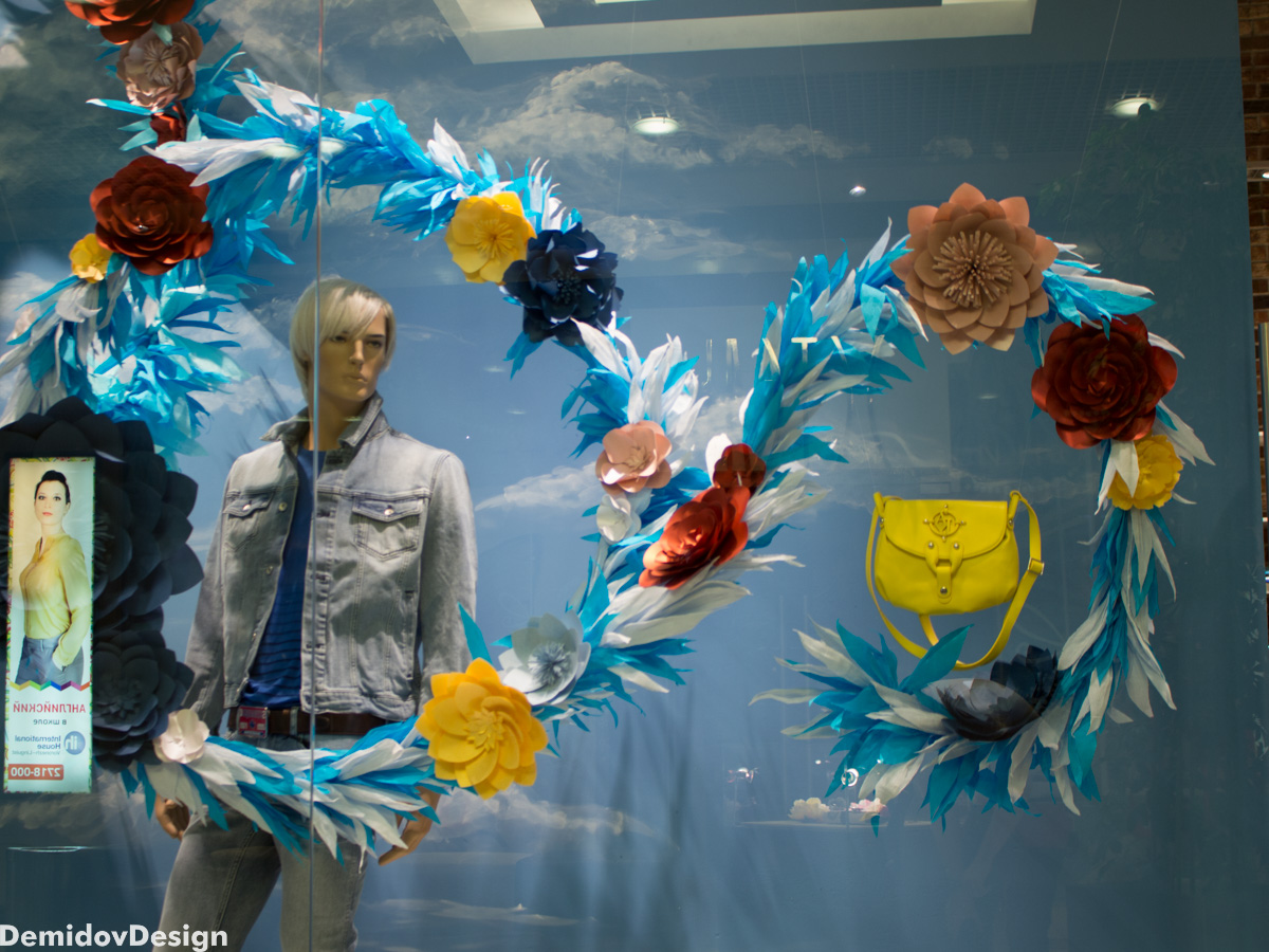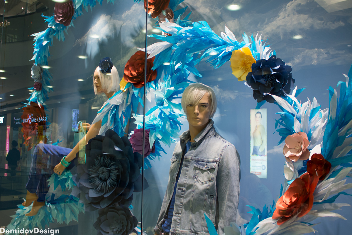 Весенняя витрина для бутика модной одежды +IT. Огромный плющ переходит из витрины в витрину, окрашивая пространство в весенние цвета. Все элементы витрины, включая роспись стен, выполнены вручную.