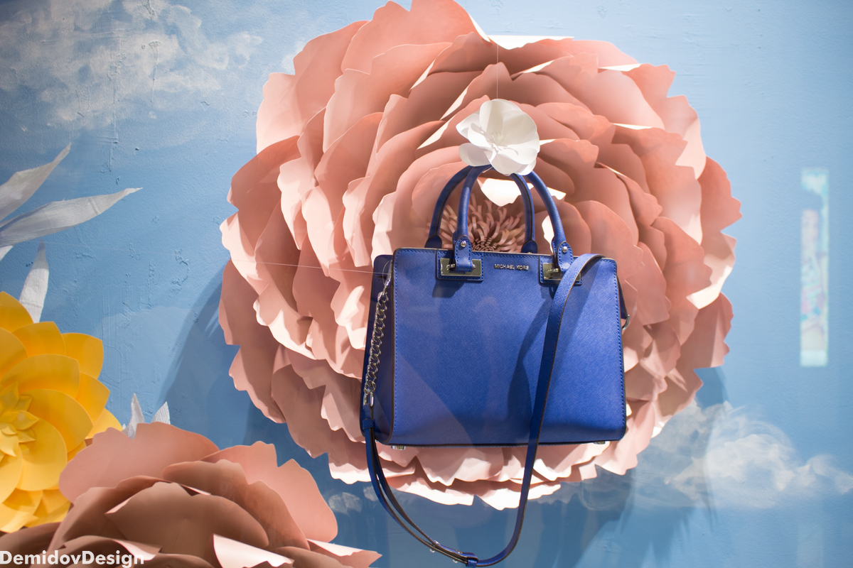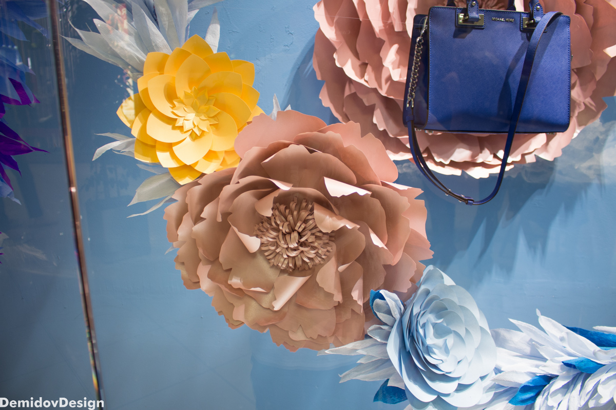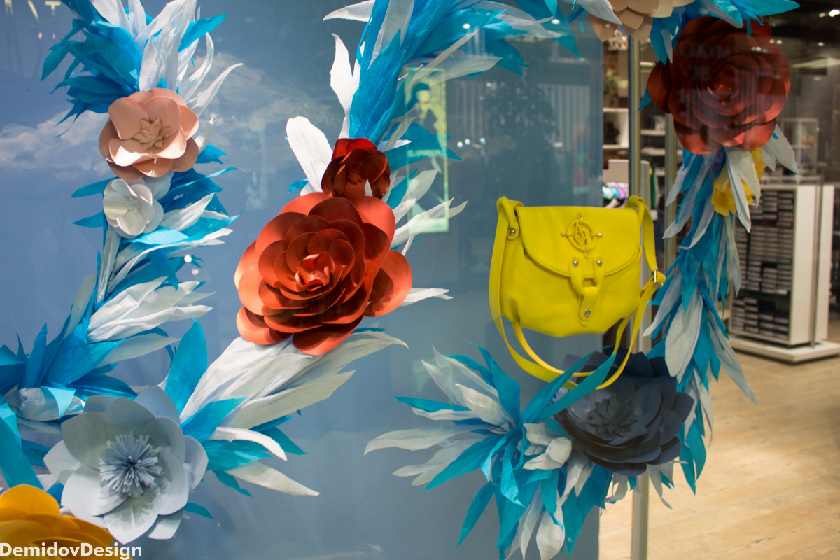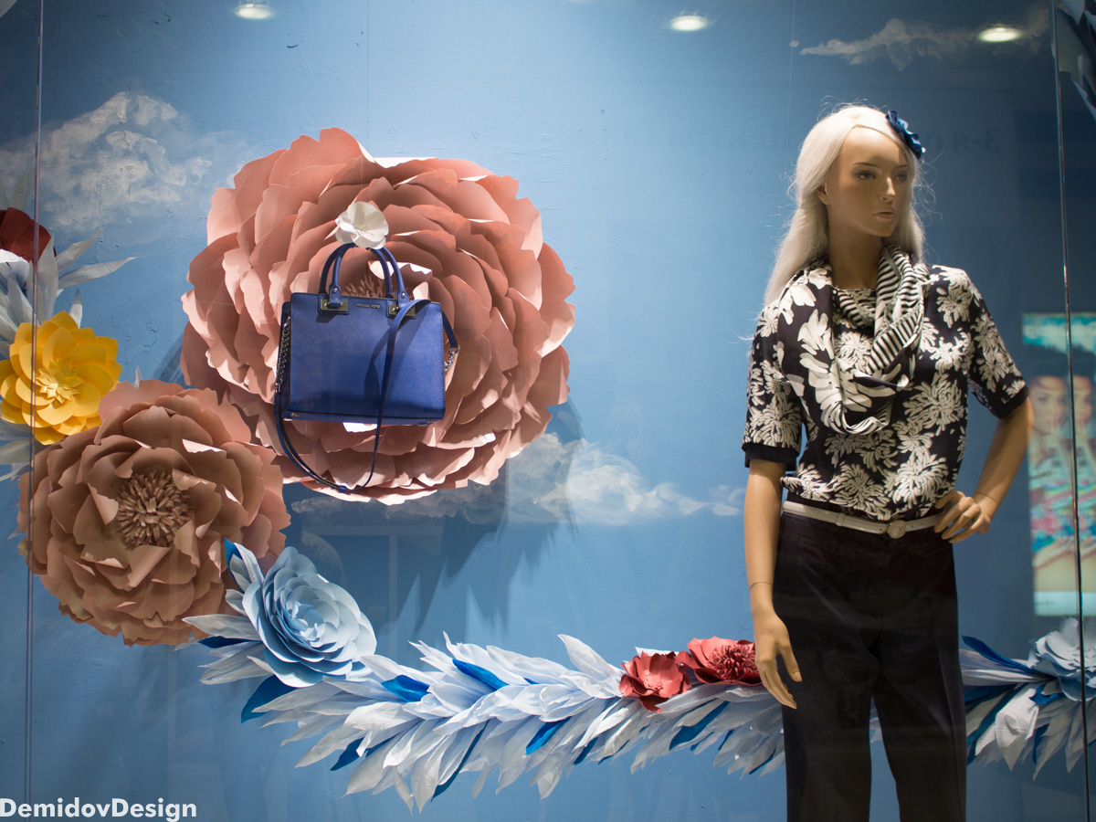 Весенняя витрина для бутика модной одежды +IT. Огромный плющ переходит из витрины в витрину, окрашивая пространство в весенние цвета. Все элементы витрины, включая роспись стен, выполнены вручную.