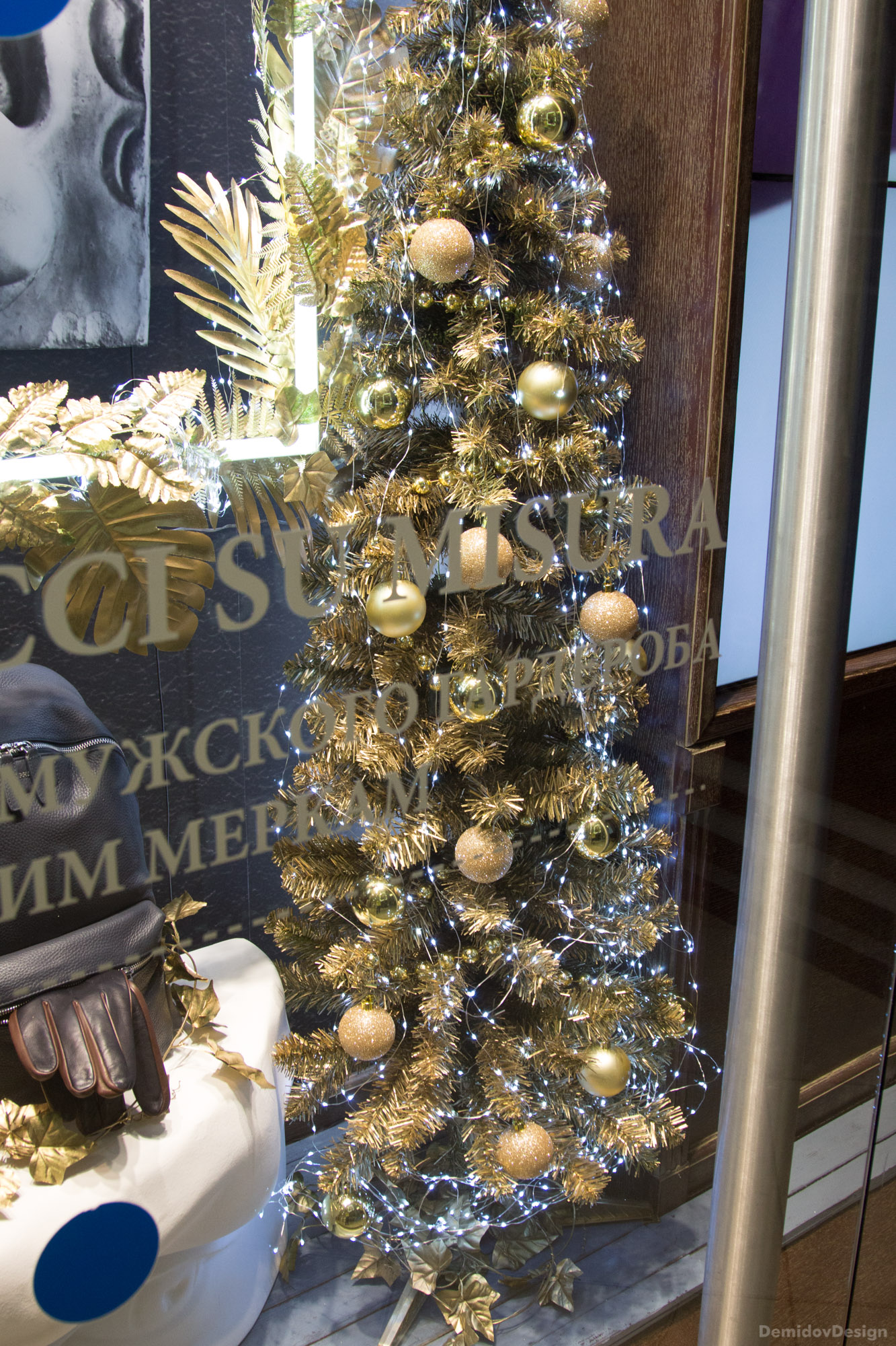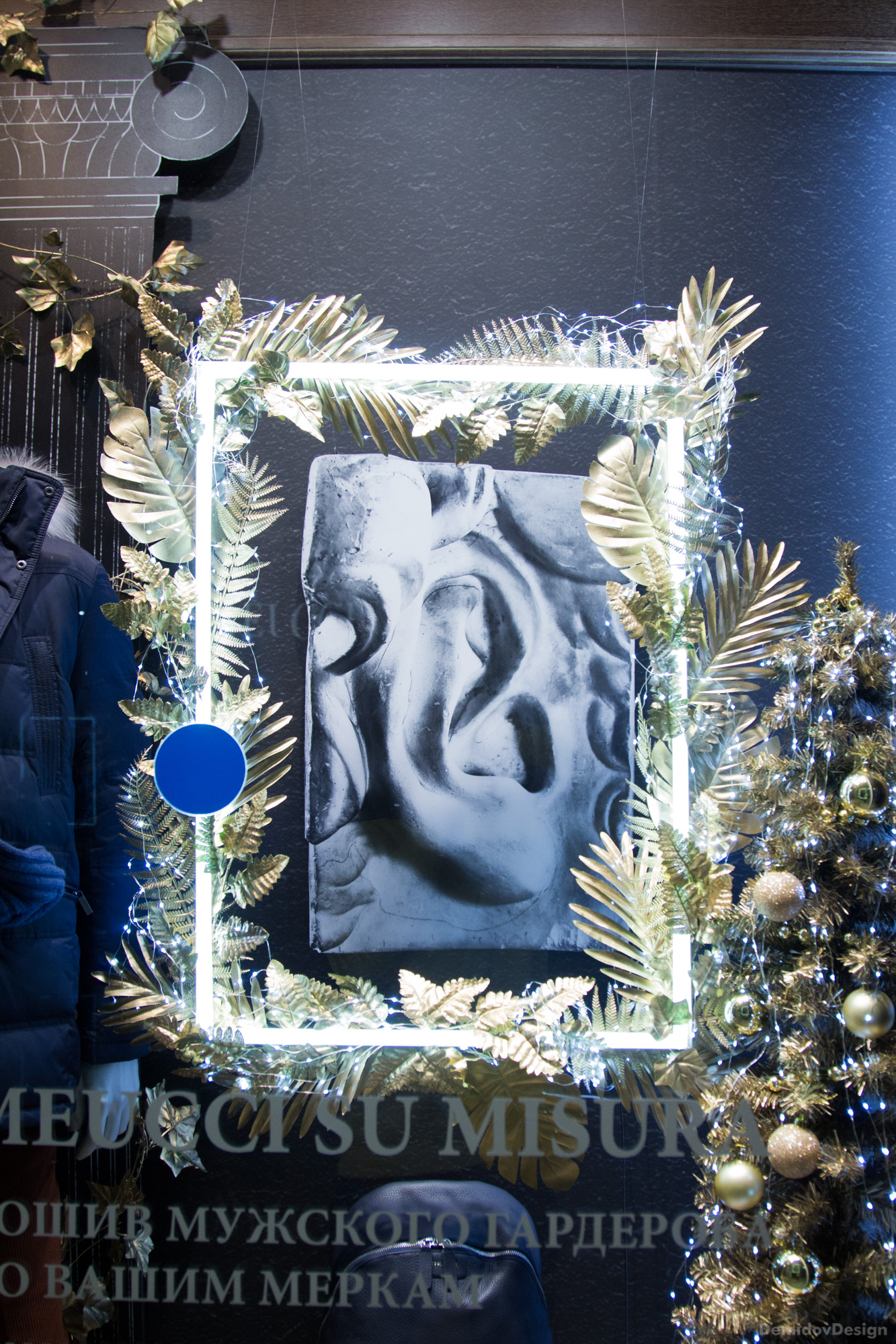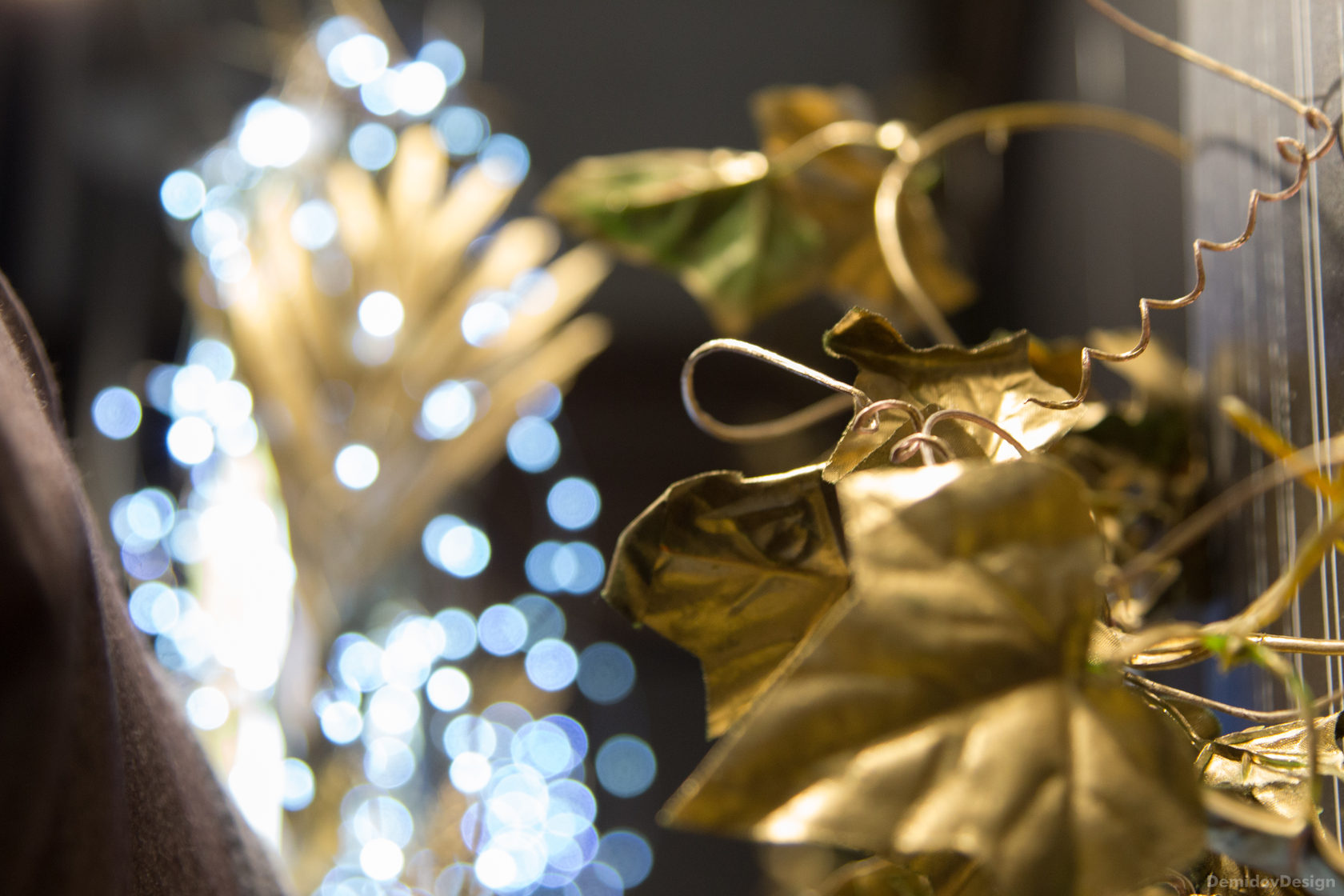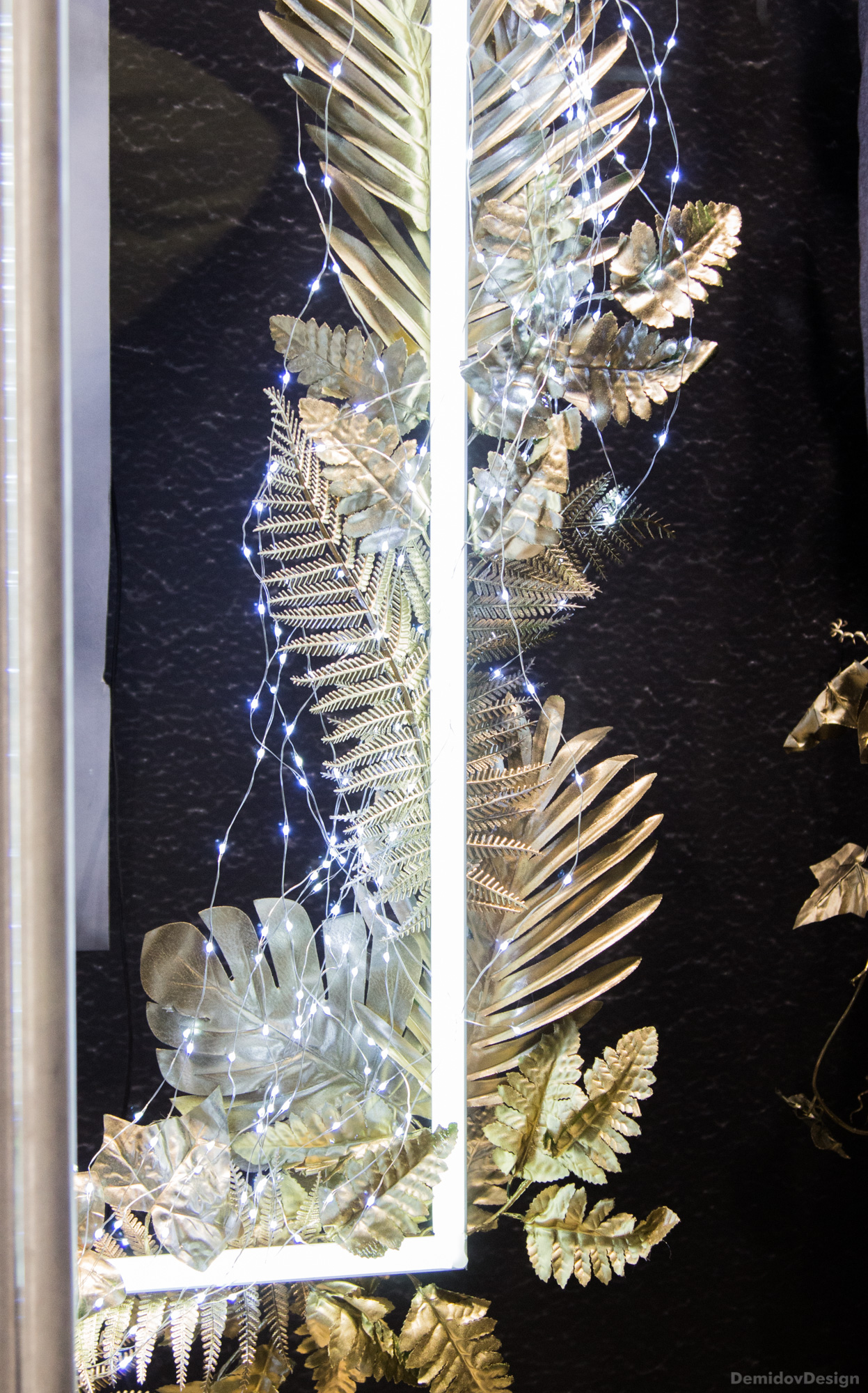 Небольшое дополнение декора для новогоднего оформления бутика мужской одежды. Золотые листья, плющи и золотые металлические гирлянды.