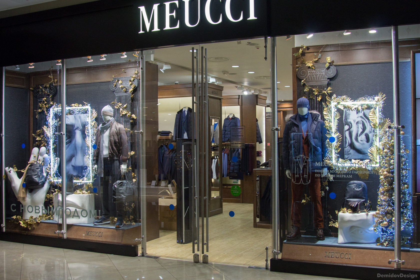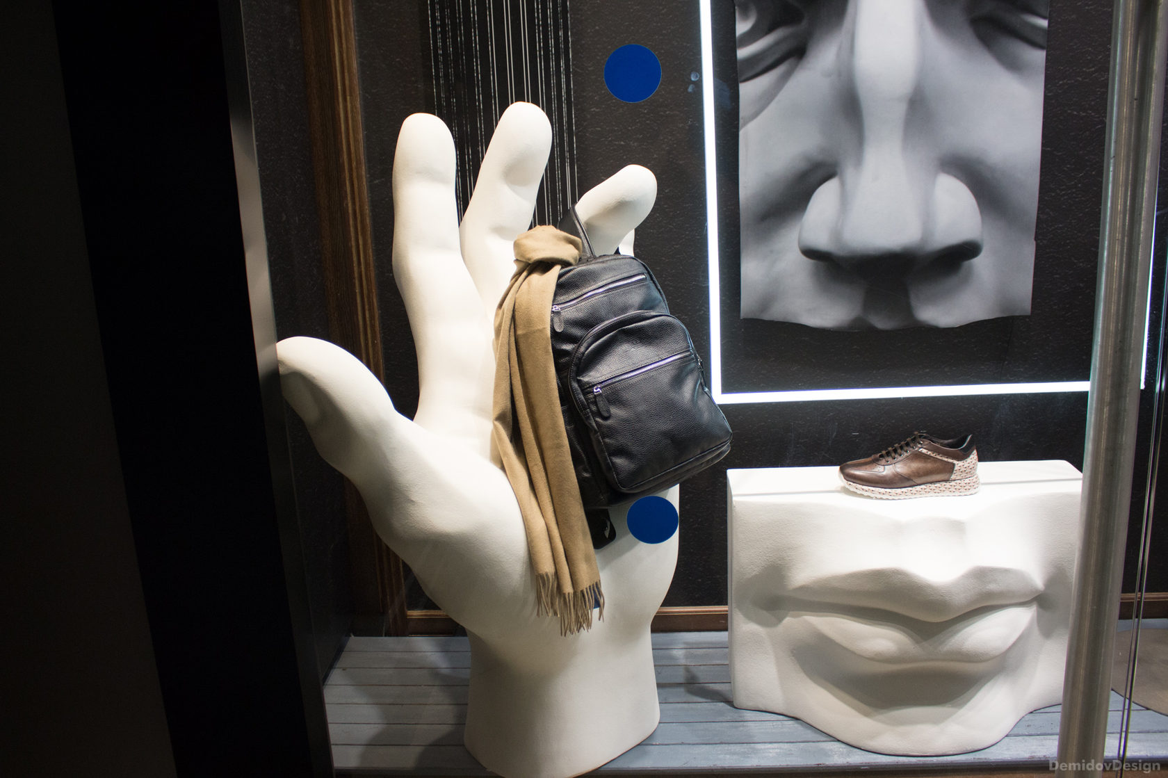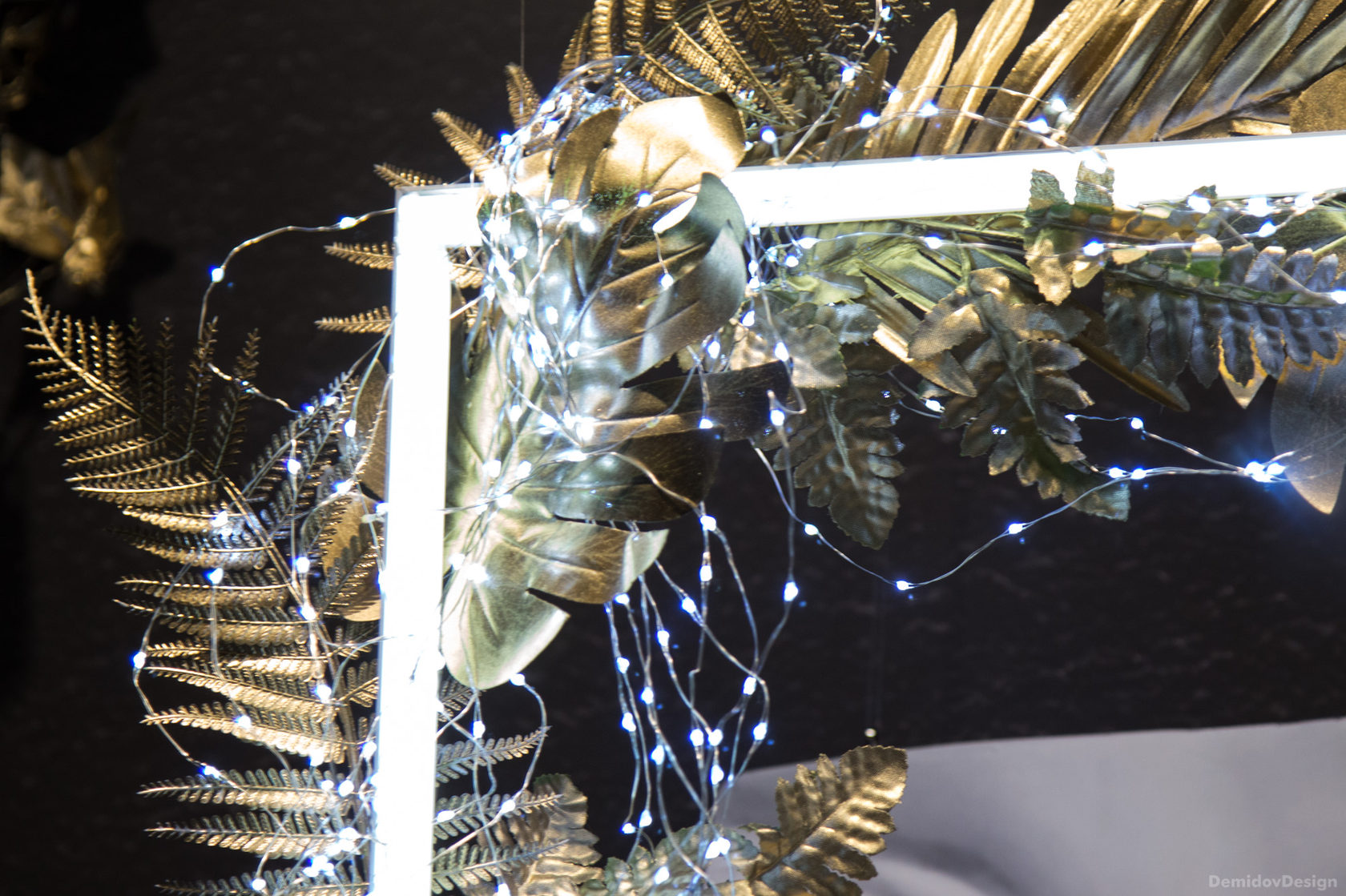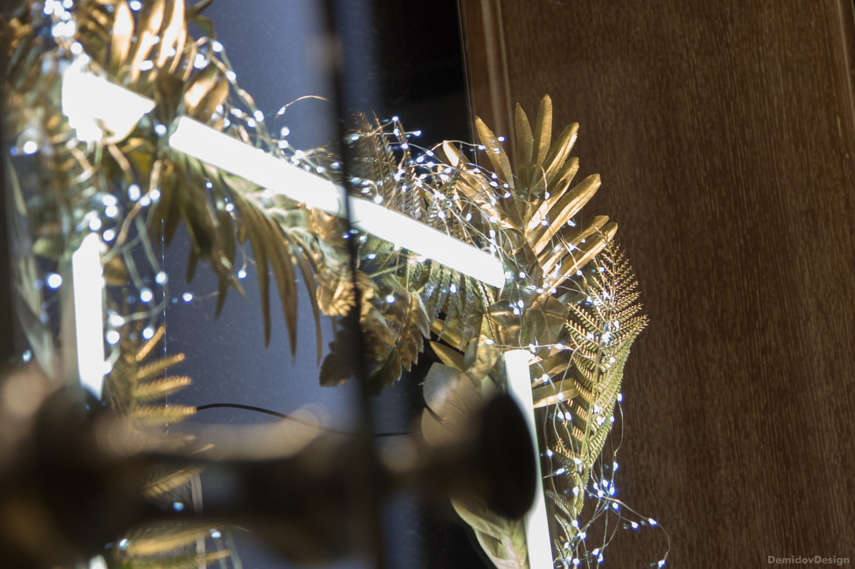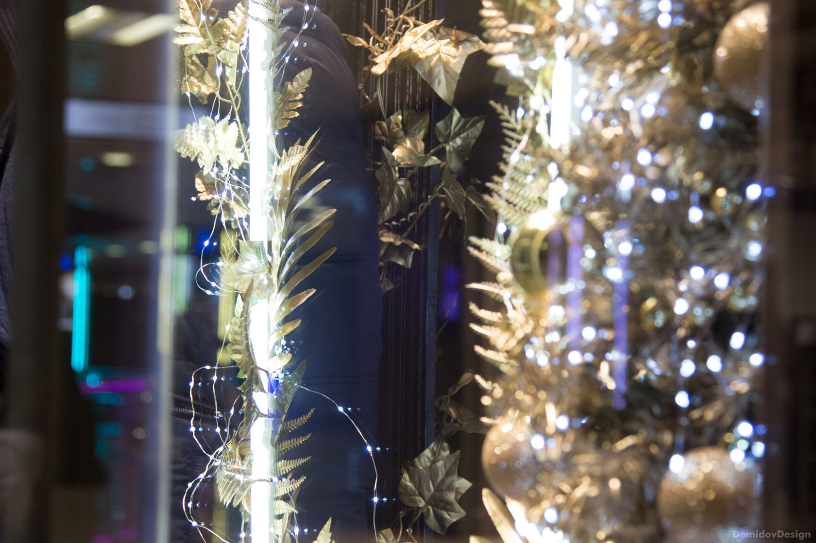 Небольшое дополнение декора для новогоднего оформления бутика мужской одежды. Золотые листья, плющи и золотые металлические гирлянды.