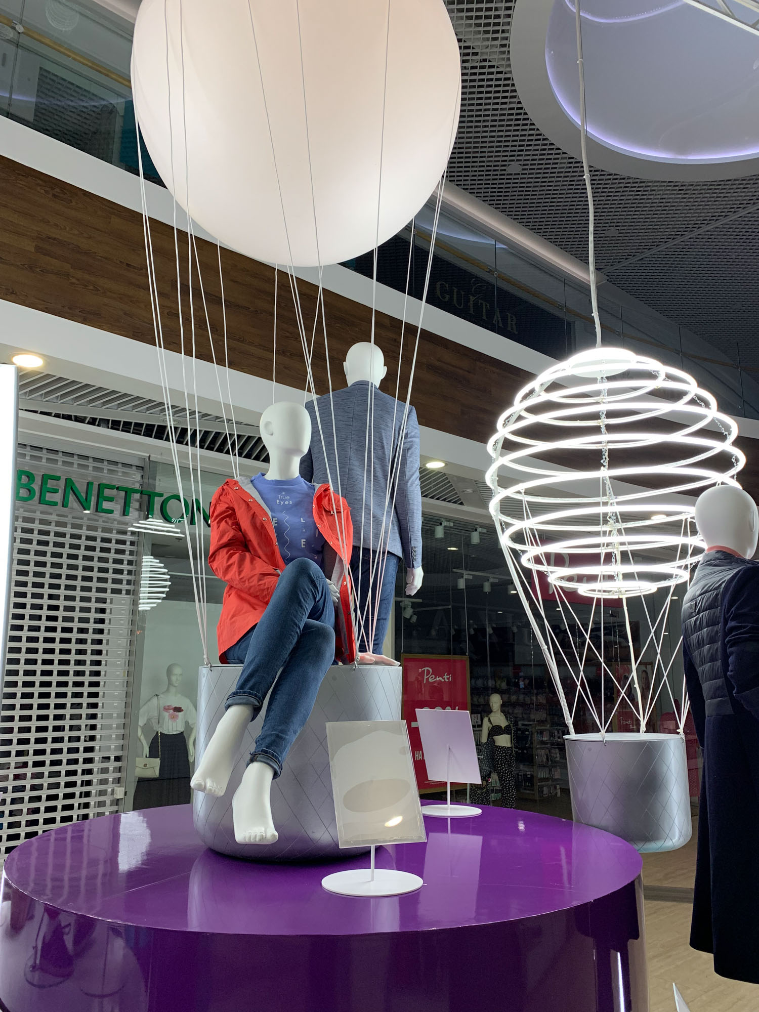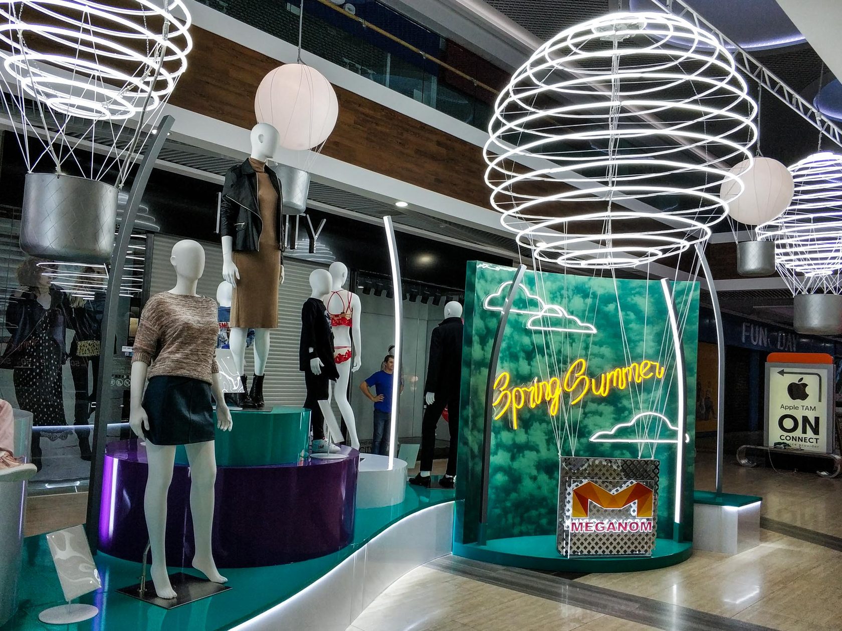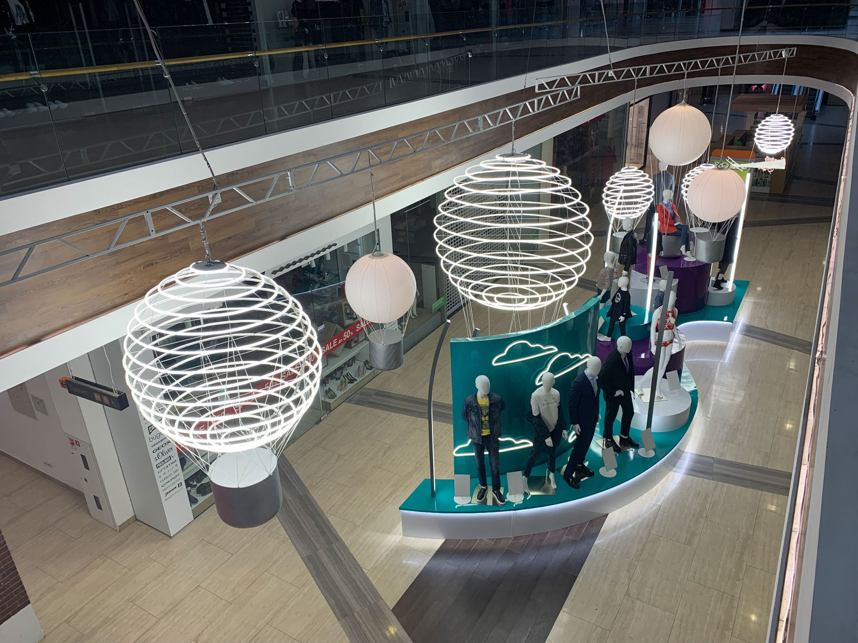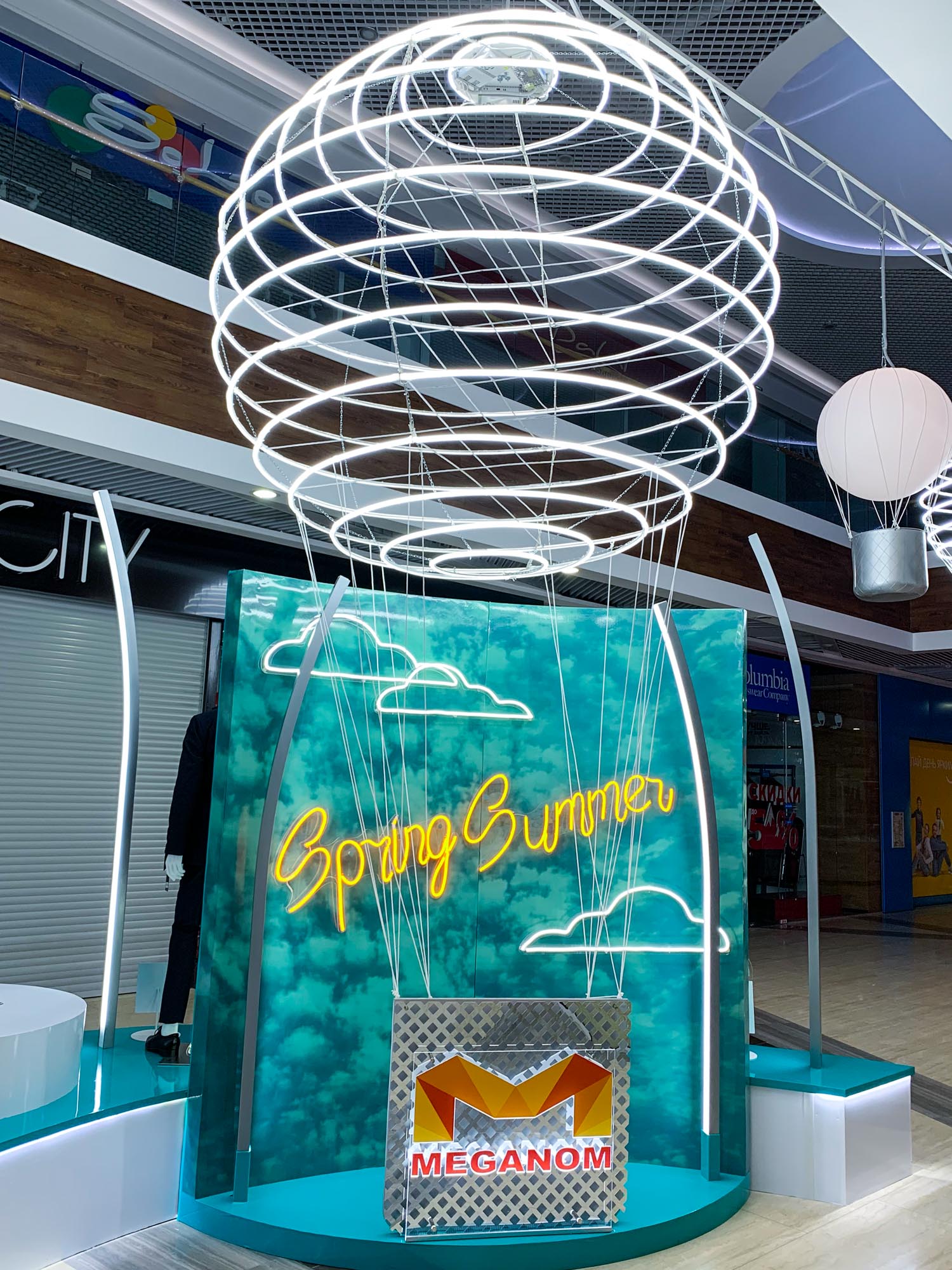 Стенд и оформление манекенной группы в галлерее торгового центра. Оформление выполнено с множеством световых элементов: подвесных неоновых шаров, облаков, фонарей и неоновых вывесок. Также в композицию интегрирована фотозона, позволяющая посетителям сфотографироваться на фоне оформления. Все элементы разработаны и изготовлены на нашем производстве.