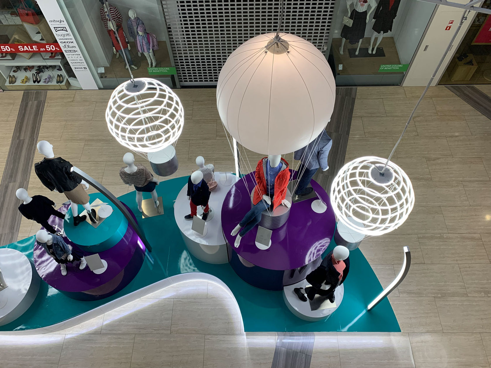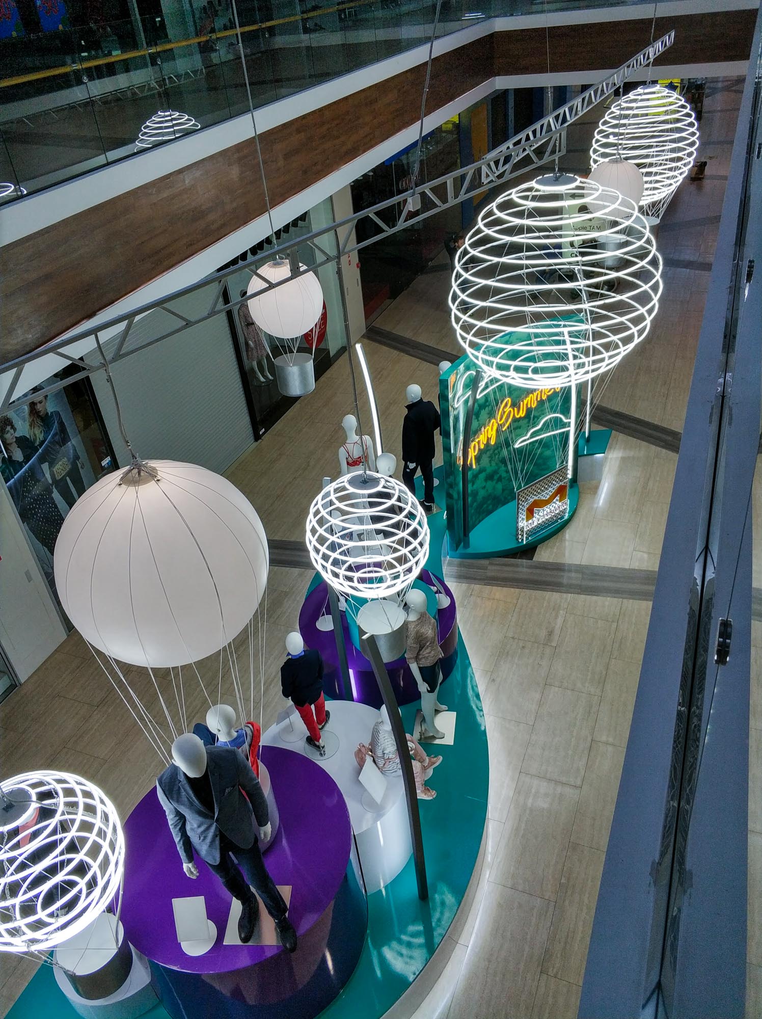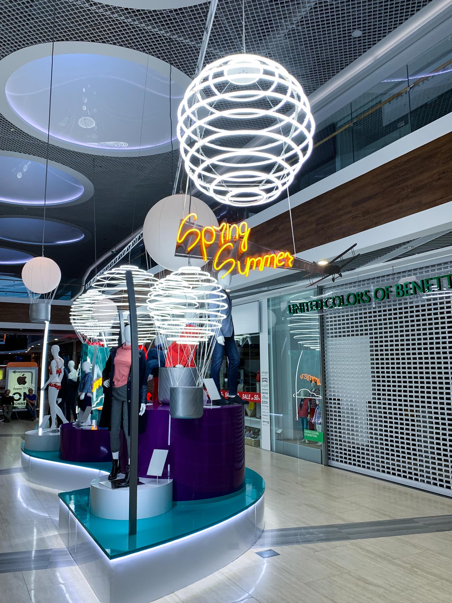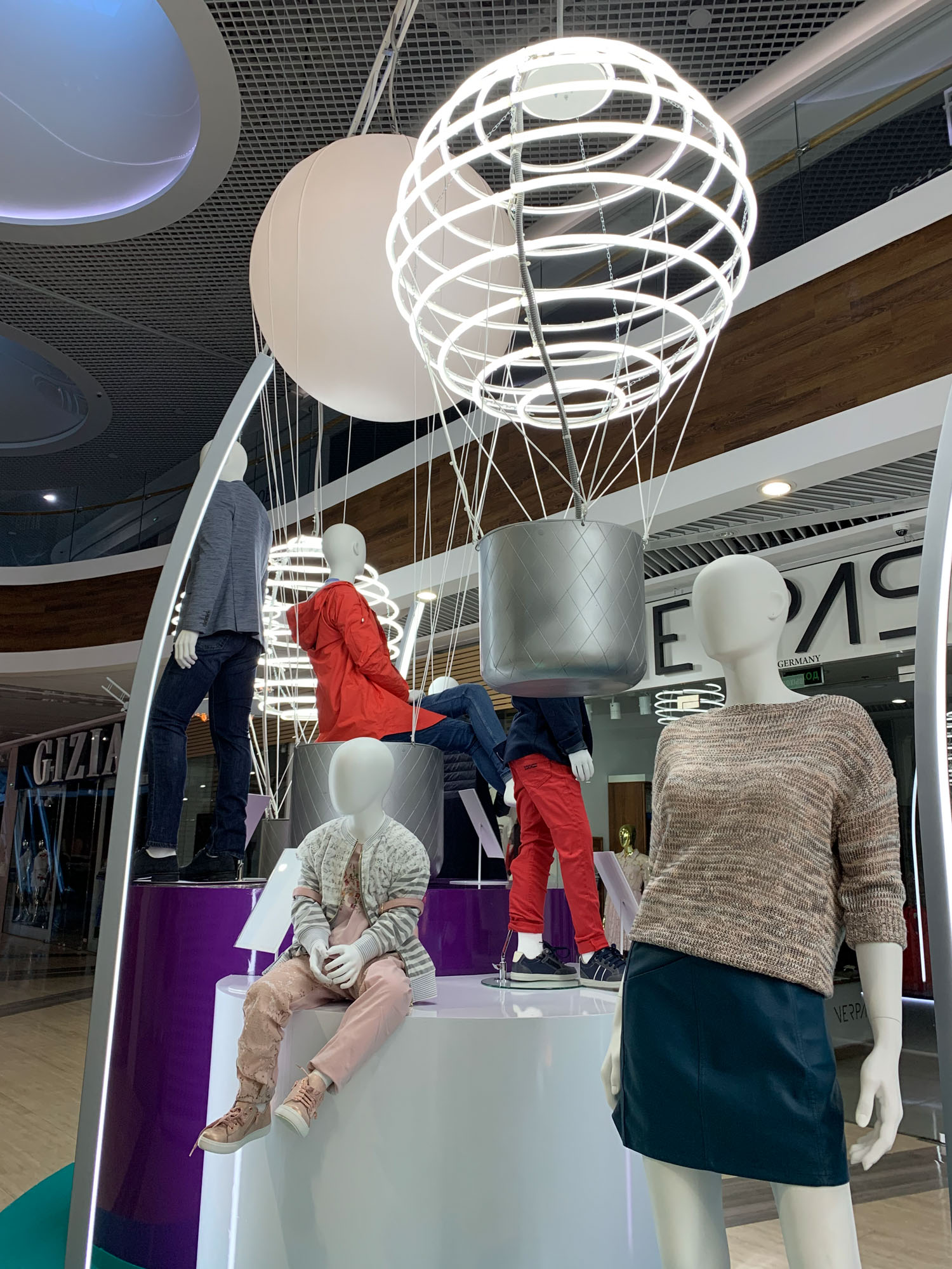 Стенд и оформление манекенной группы в галлерее торгового центра. Оформление выполнено с множеством световых элементов: подвесных неоновых шаров, облаков, фонарей и неоновых вывесок. Также в композицию интегрирована фотозона, позволяющая посетителям сфотографироваться на фоне оформления. Все элементы разработаны и изготовлены на нашем производстве.