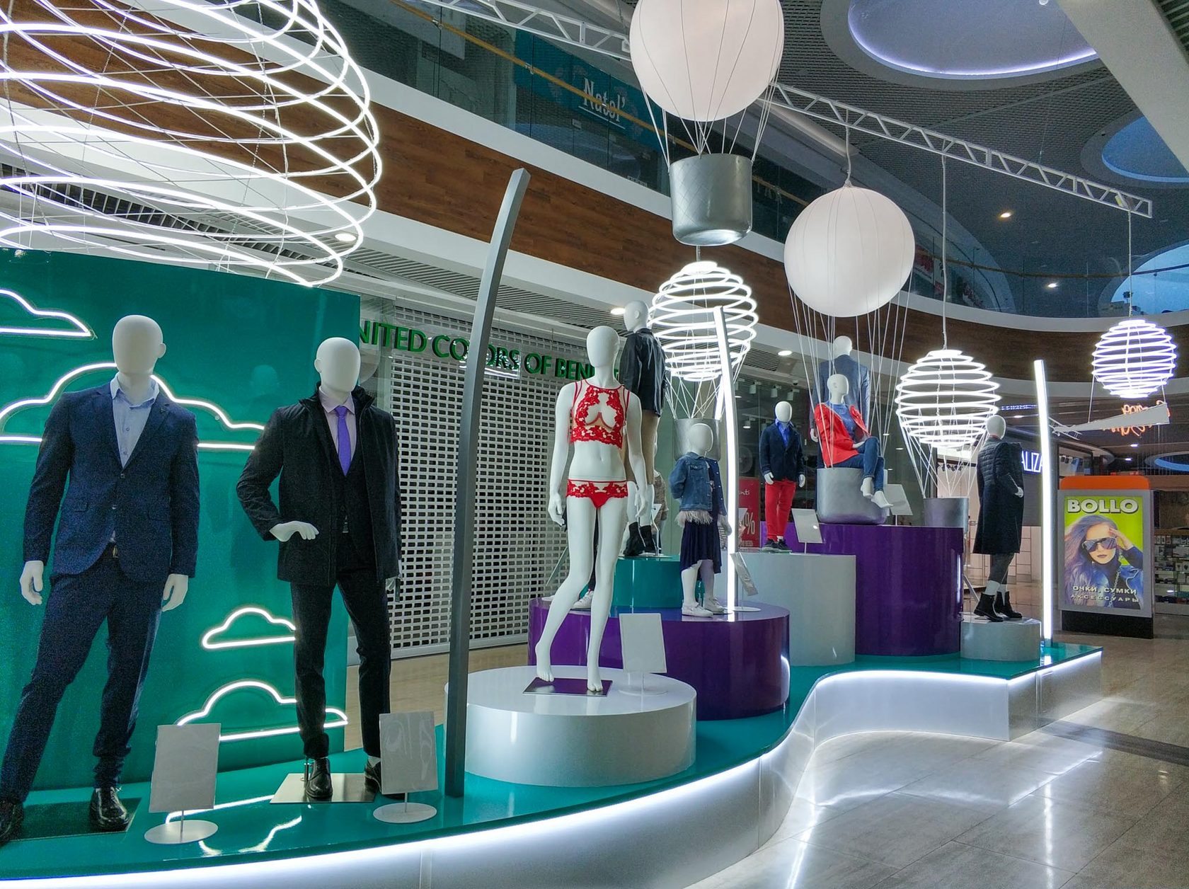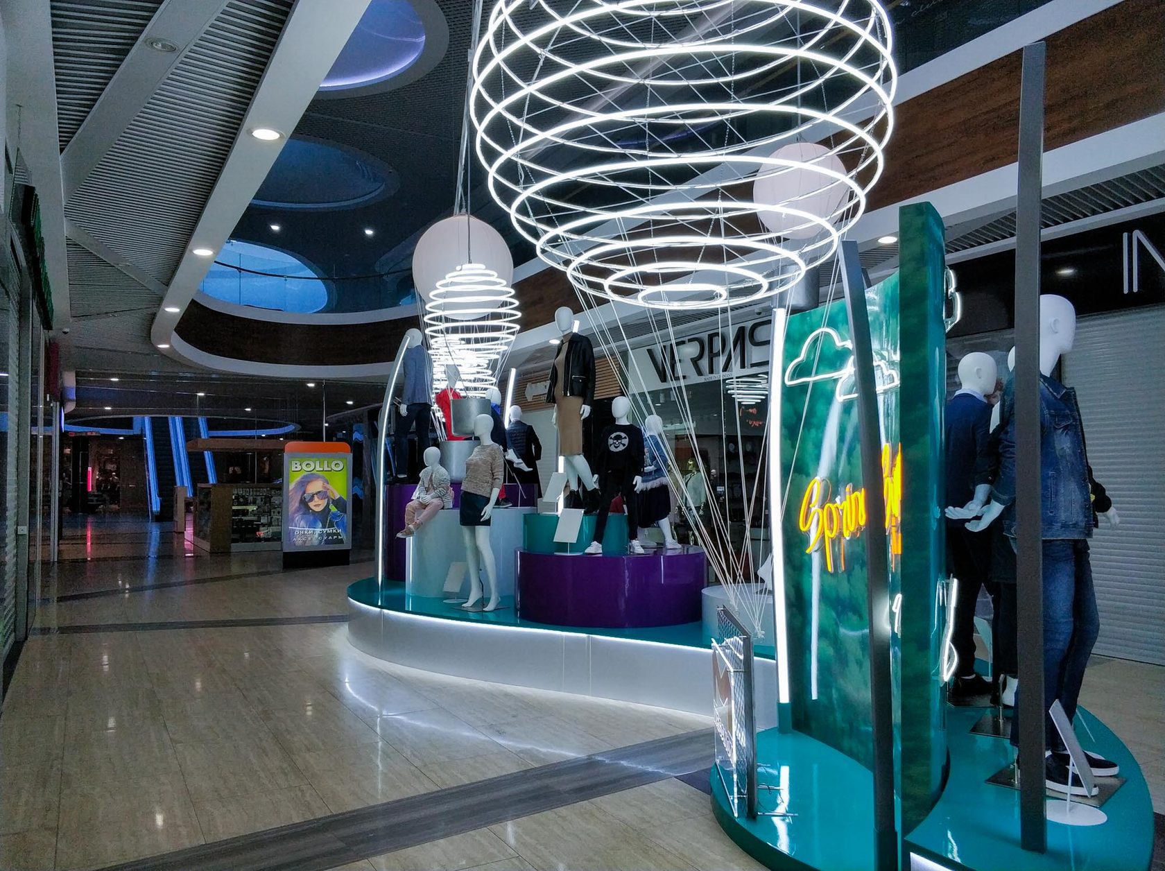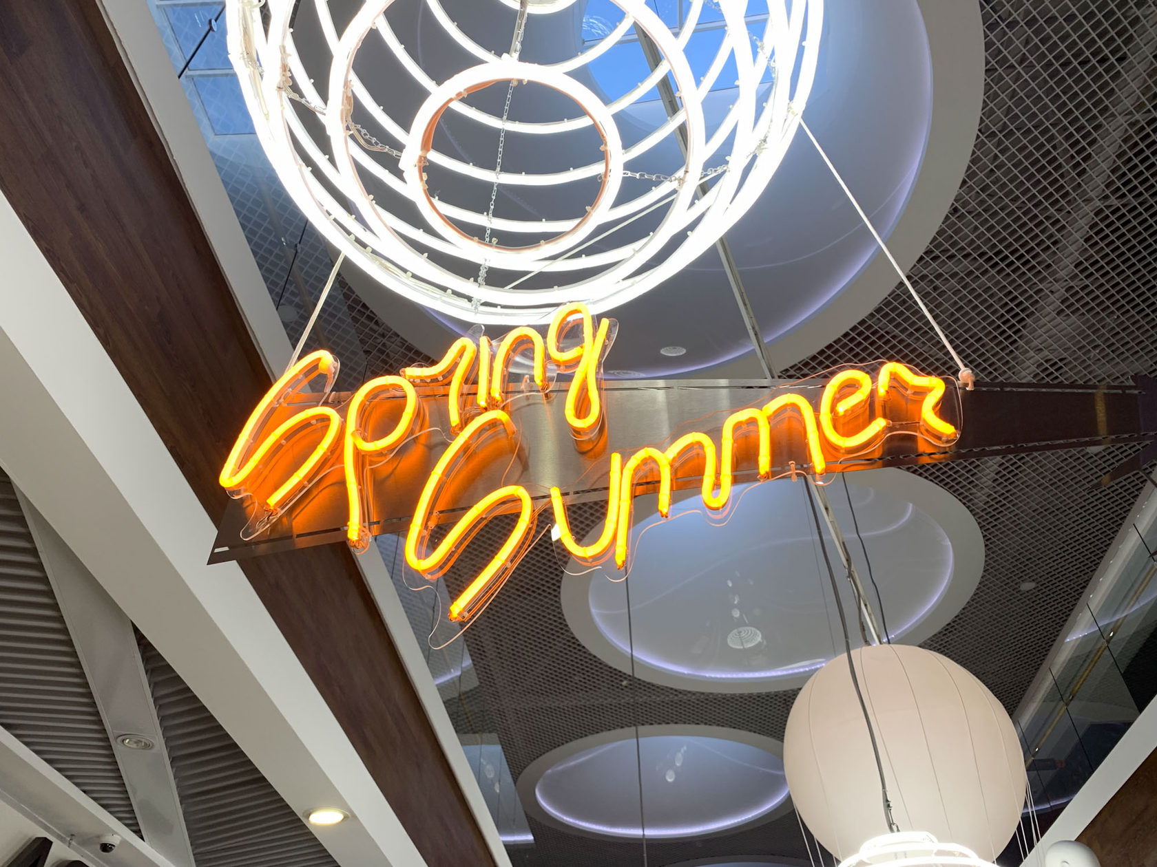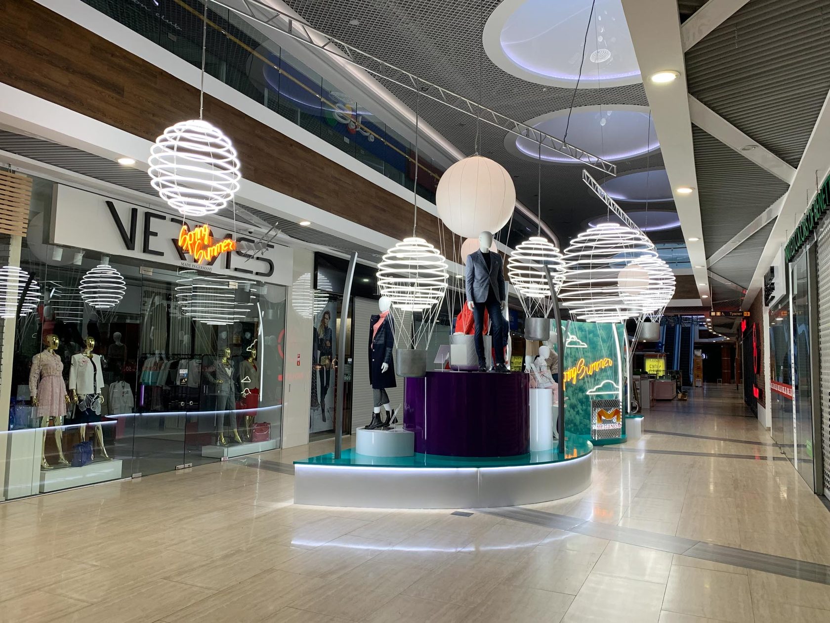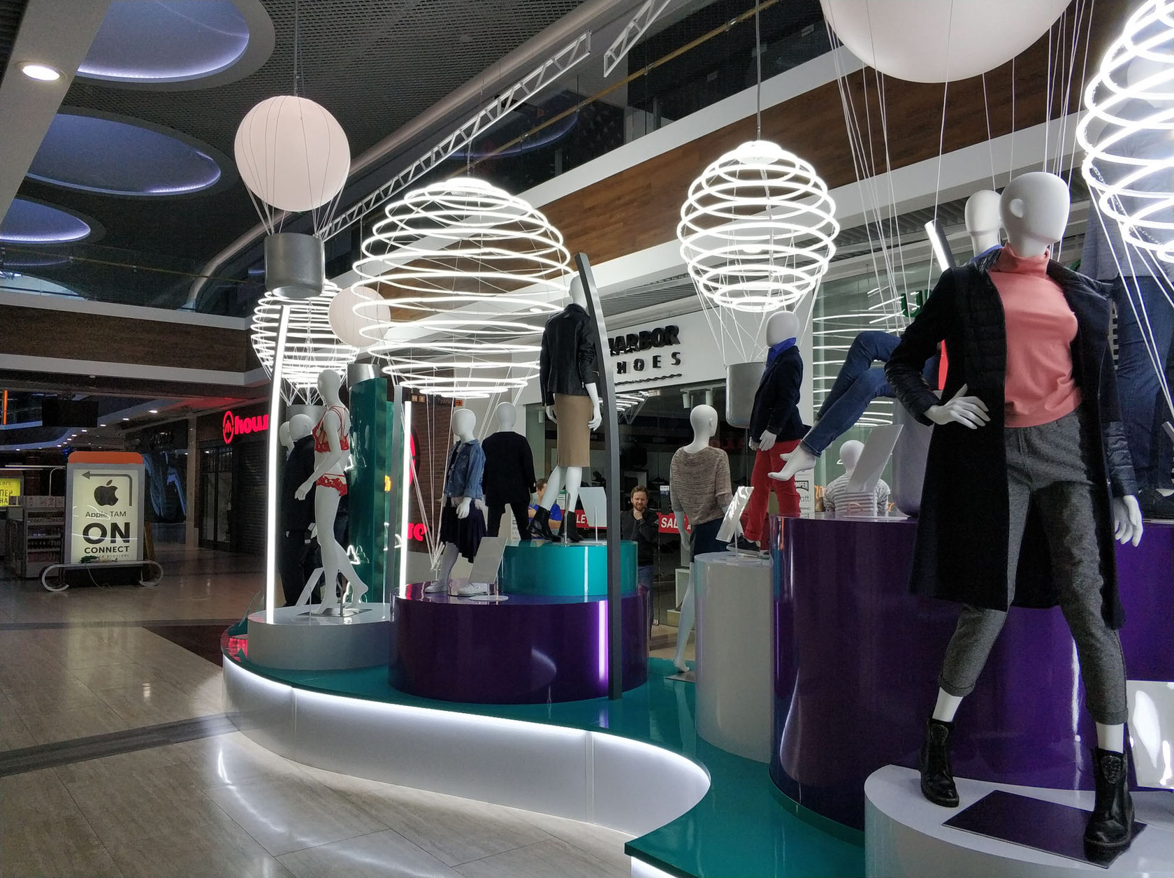 Стенд и оформление манекенной группы в галлерее торгового центра. Оформление выполнено с множеством световых элементов: подвесных неоновых шаров, облаков, фонарей и неоновых вывесок. Также в композицию интегрирована фотозона, позволяющая посетителям сфотографироваться на фоне оформления. Все элементы разработаны и изготовлены на нашем производстве.