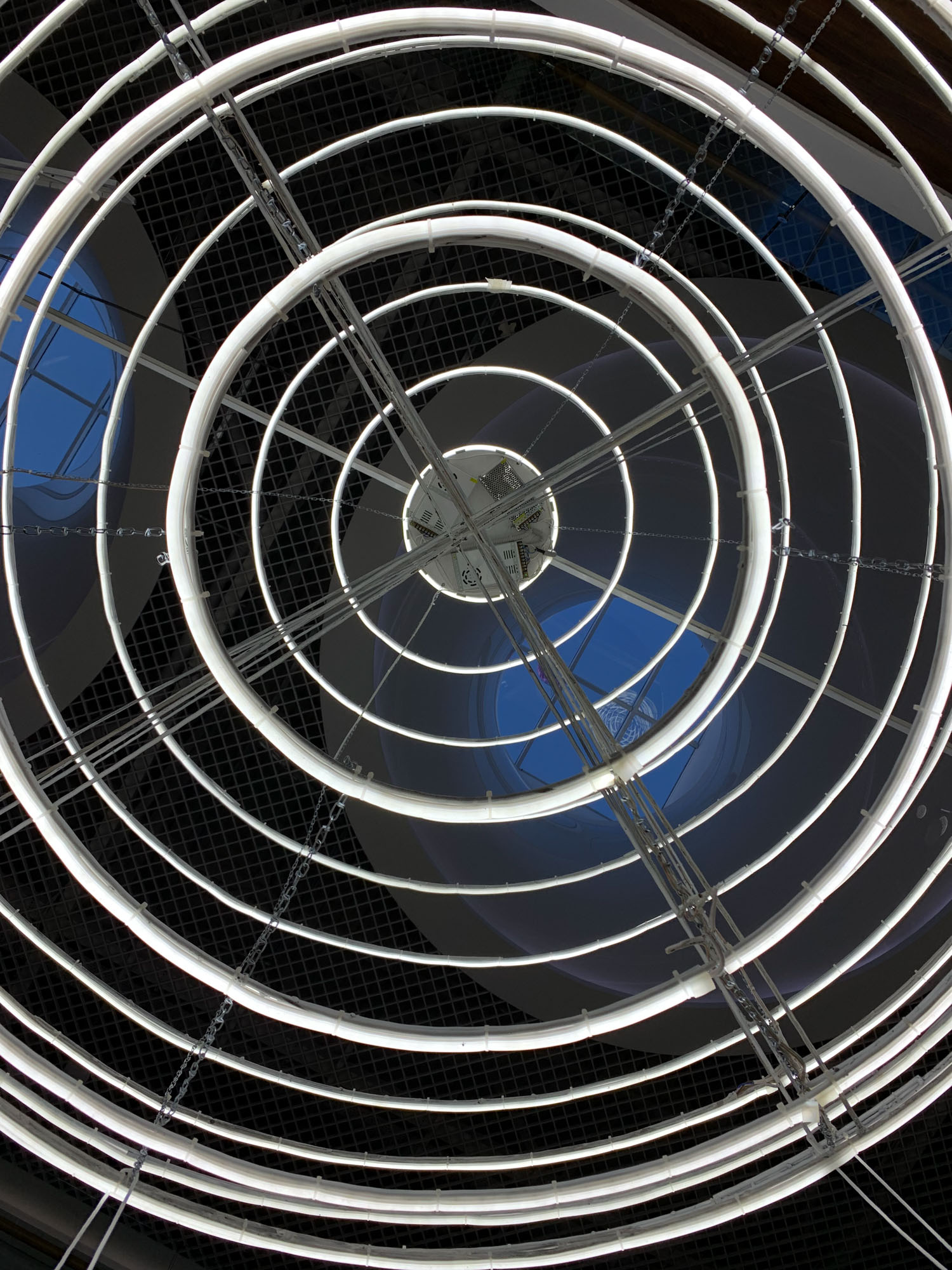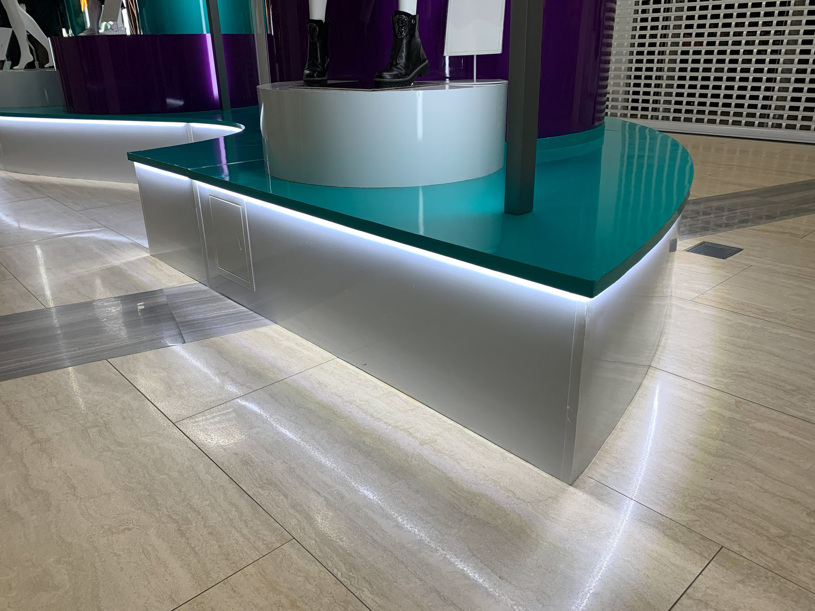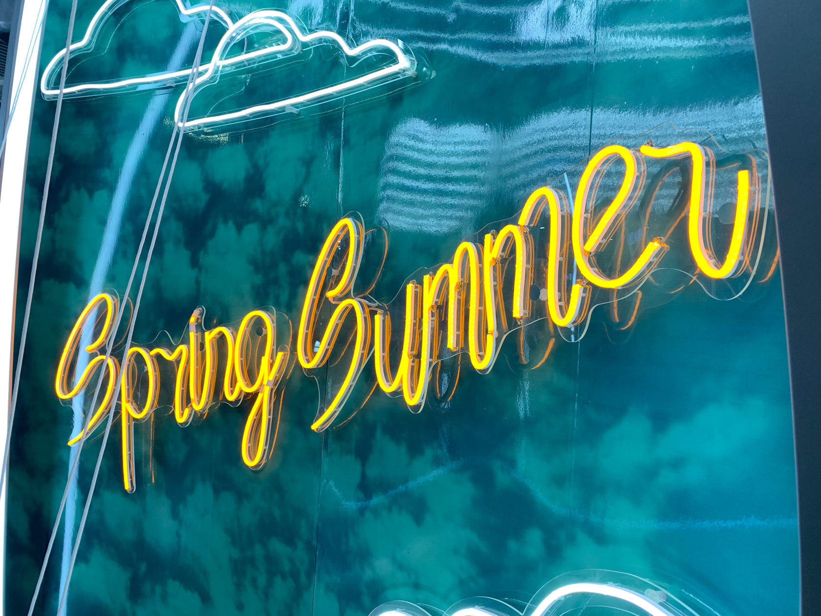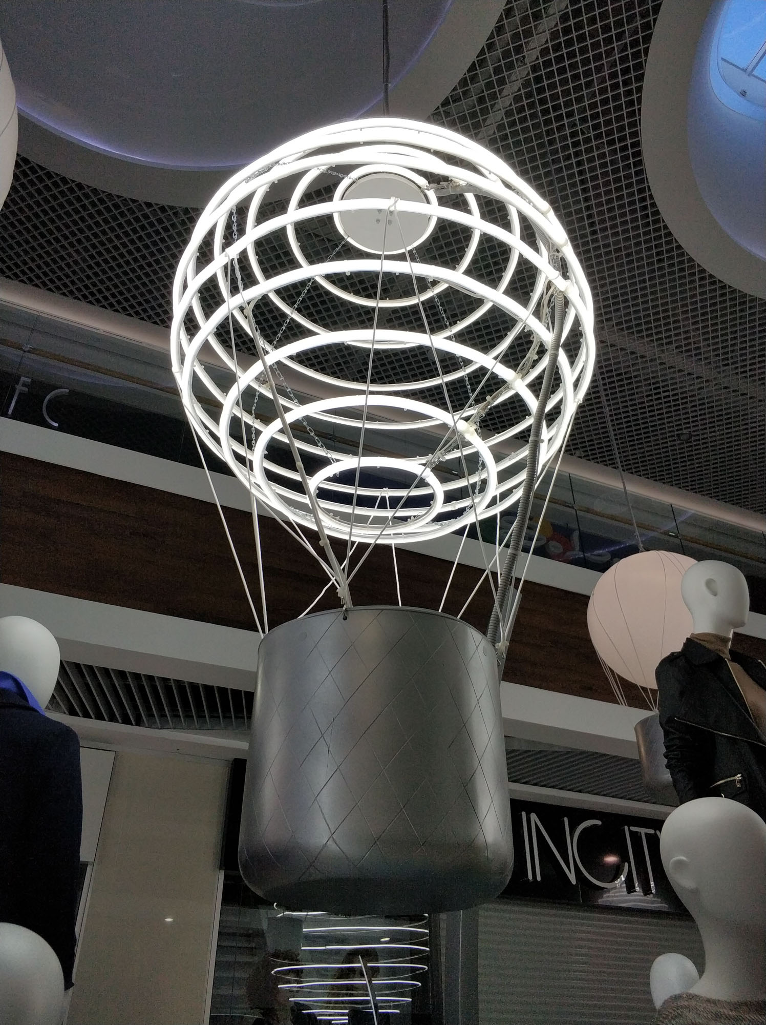 Стенд и оформление манекенной группы в галлерее торгового центра. Оформление выполнено с множеством световых элементов: подвесных неоновых шаров, облаков, фонарей и неоновых вывесок. Также в композицию интегрирована фотозона, позволяющая посетителям сфотографироваться на фоне оформления. Все элементы разработаны и изготовлены на нашем производстве.