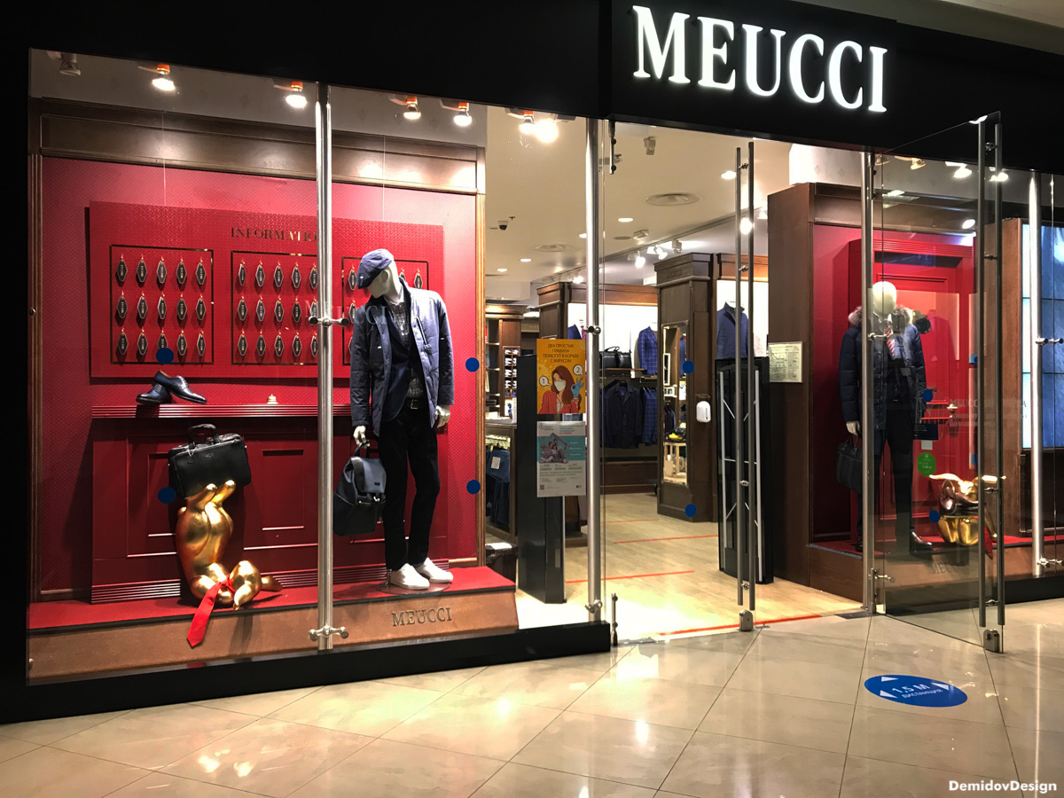 Яркое оформление витрины бутика Meucci в Москве. Идея вдохновлена стилем фильма Отель «Гранд Будапешт». Все элементы изготовлены в ручную на собственном производстве студии.