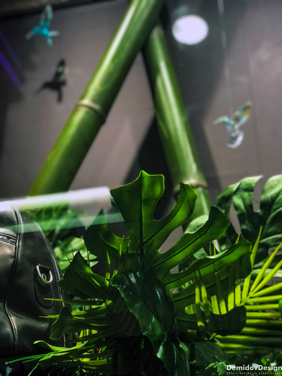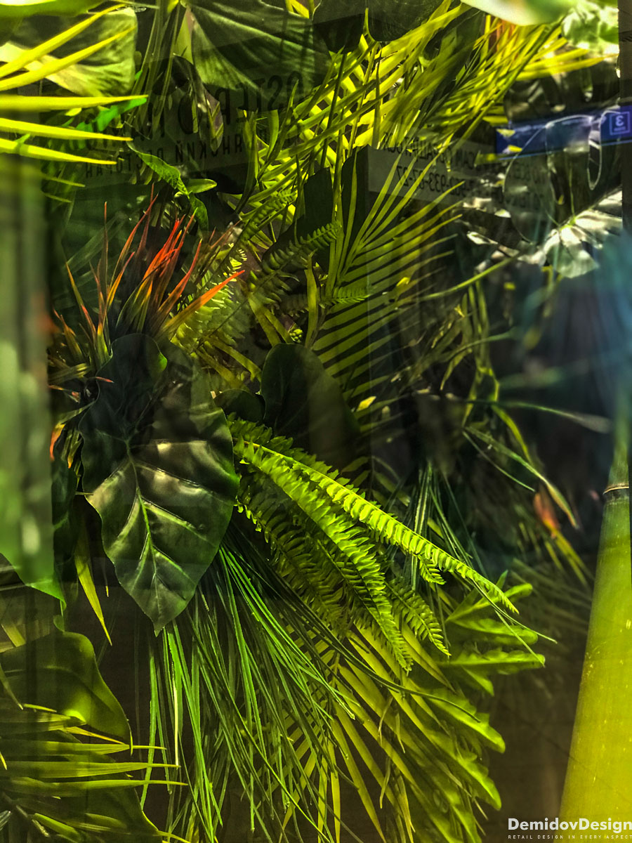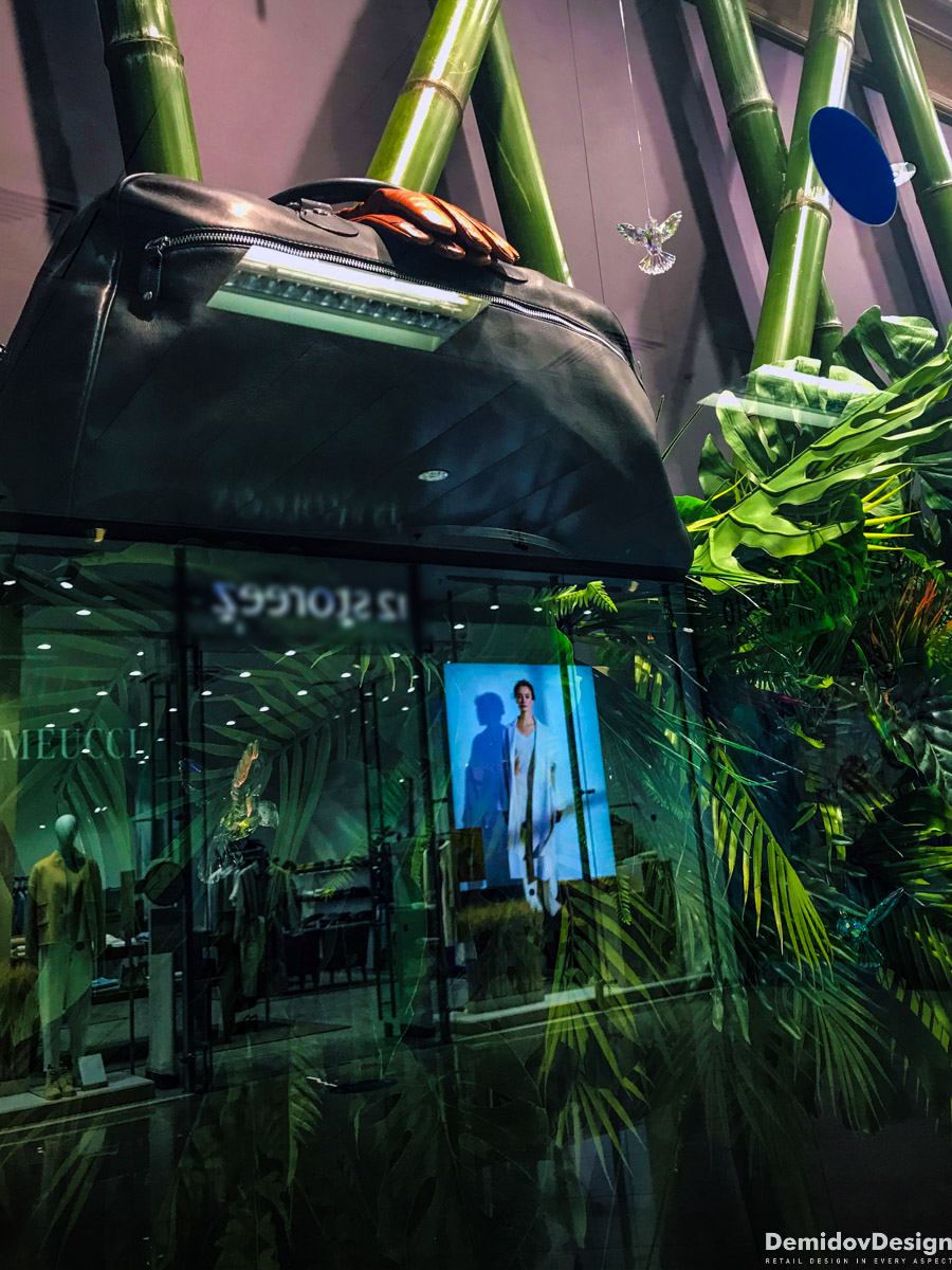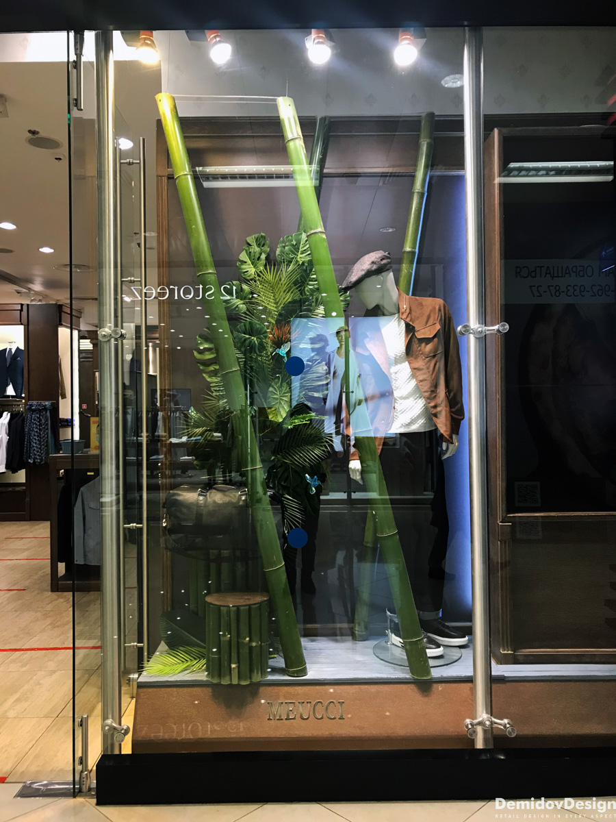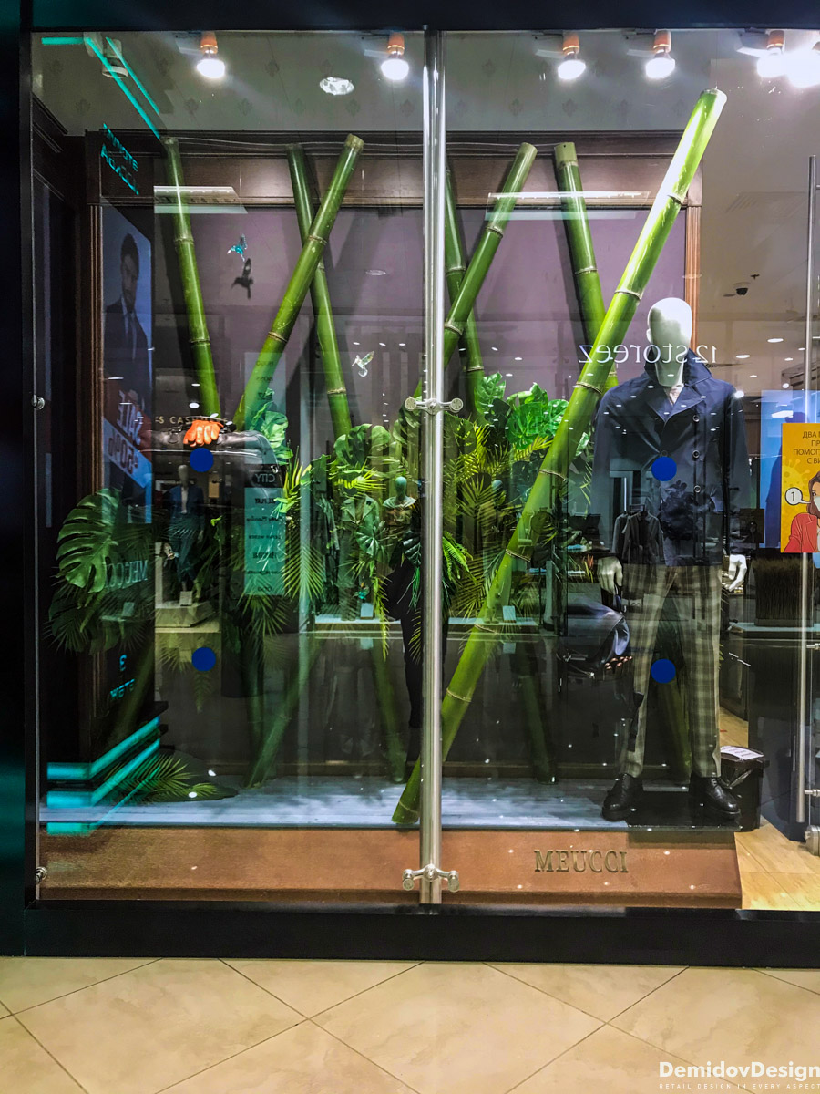 Тропическое весеннее оформление для бутика Meucci в ТЦ Европейский, Москва.