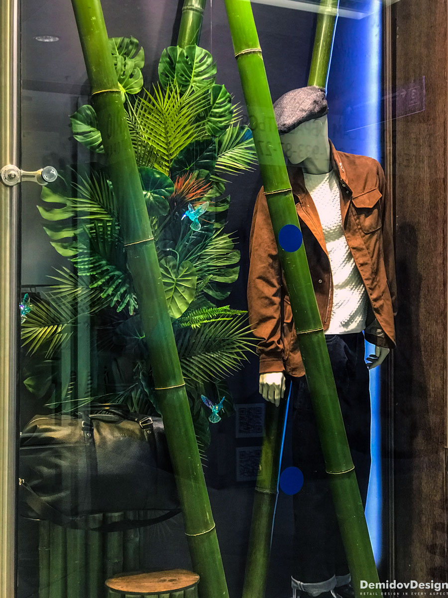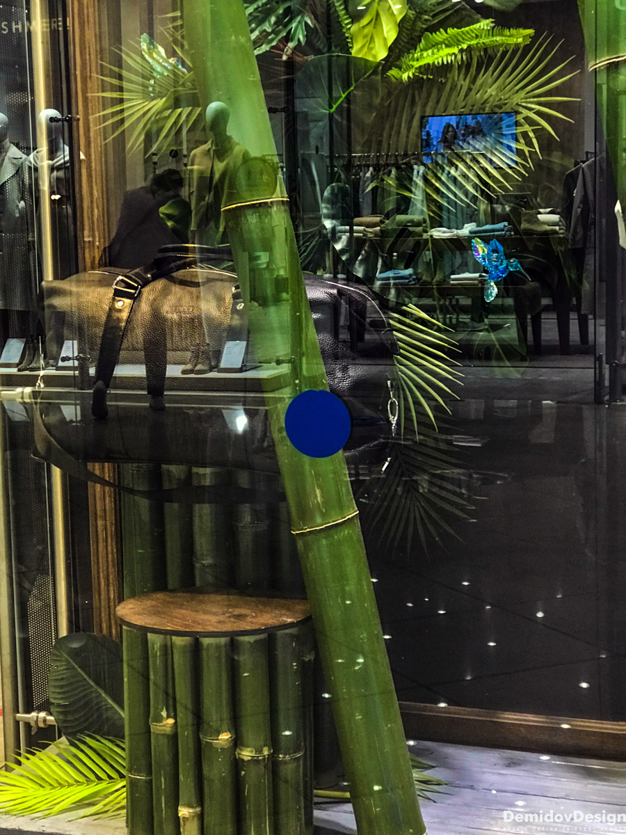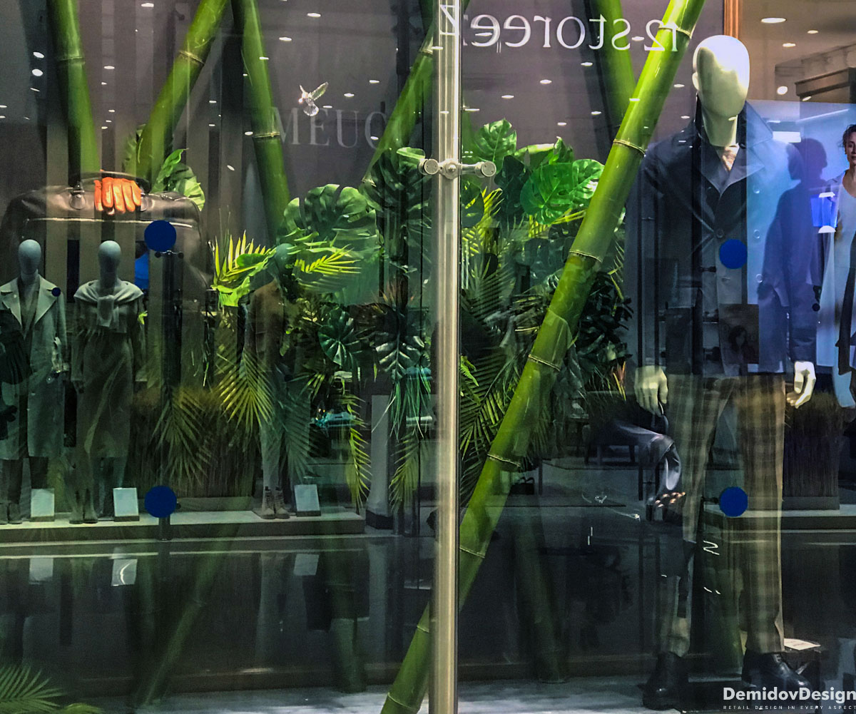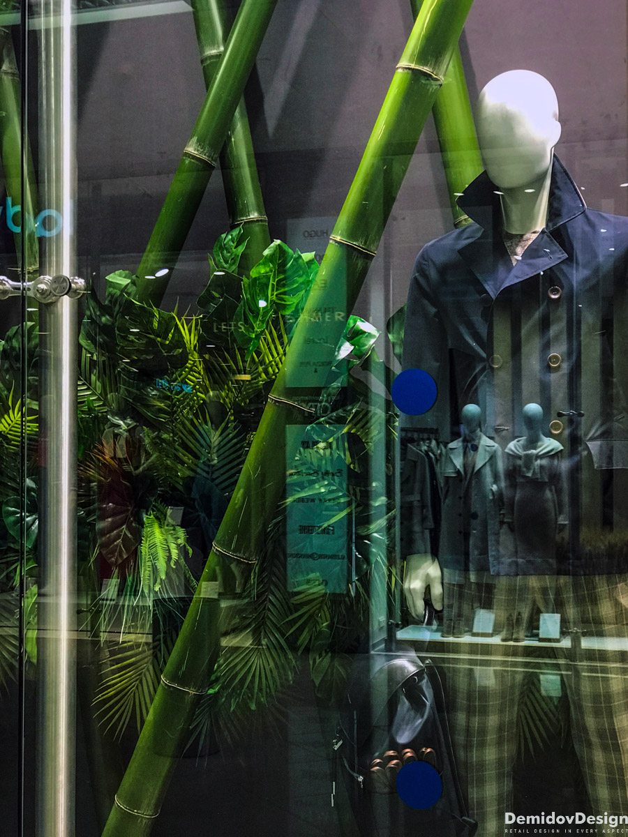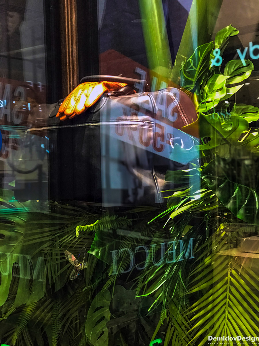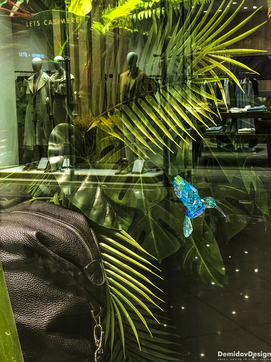 Тропическое весеннее оформление для бутика Meucci в ТЦ Европейский, Москва.