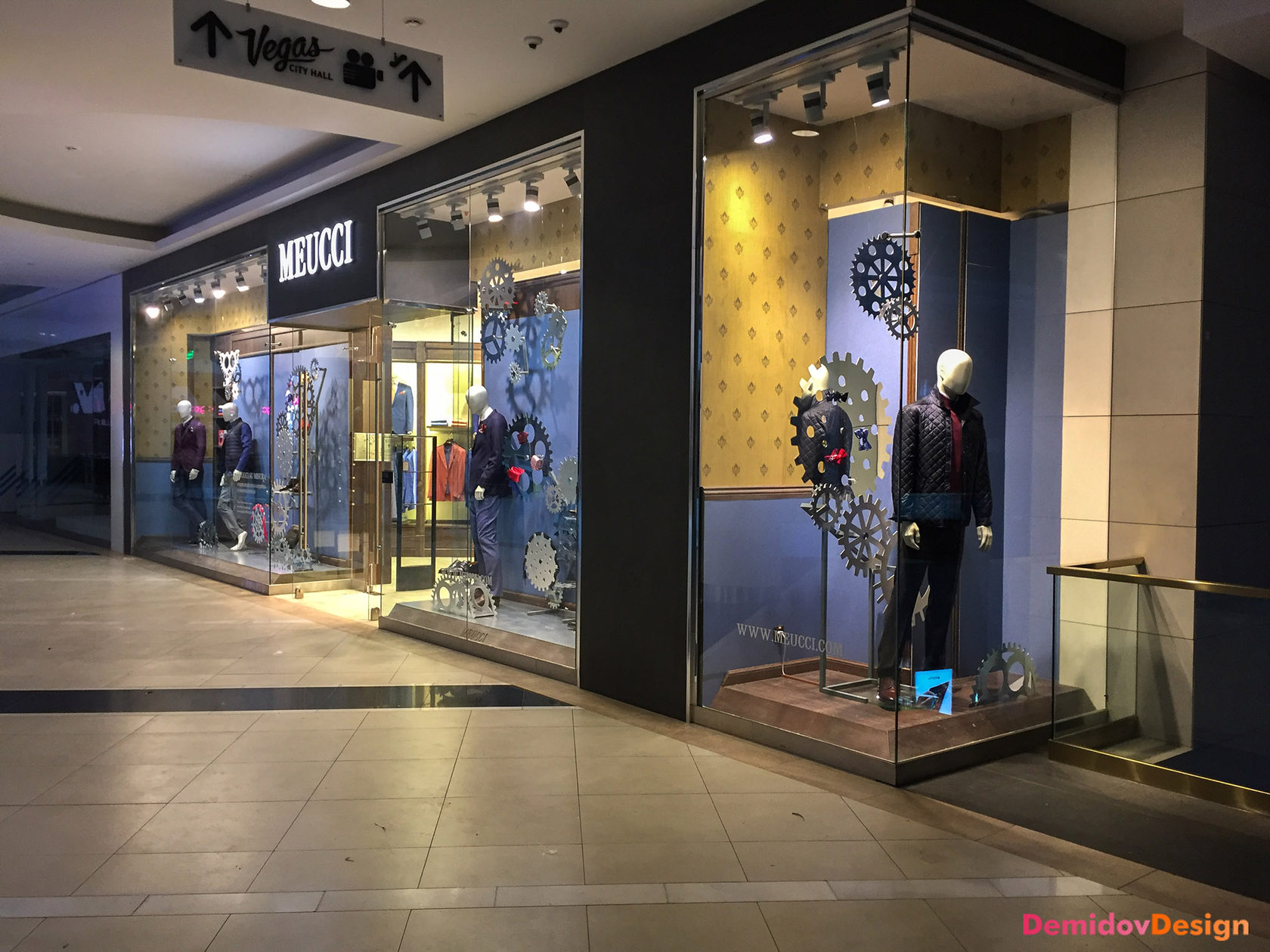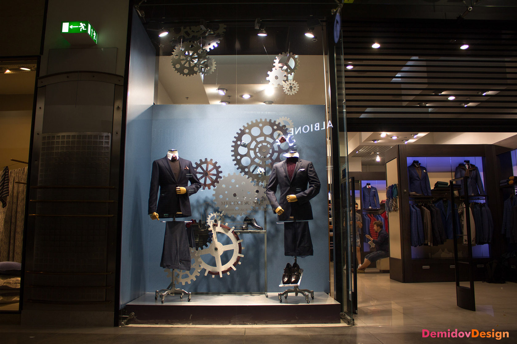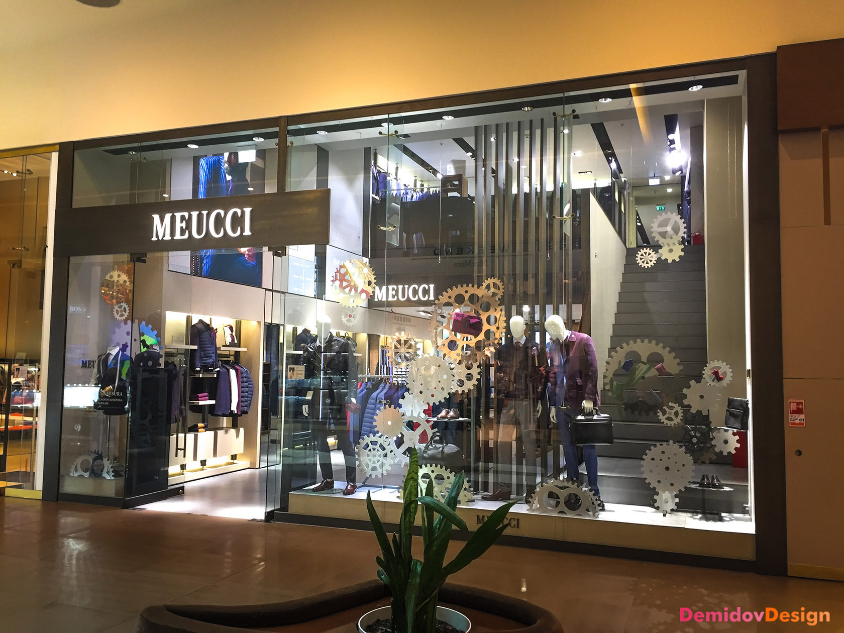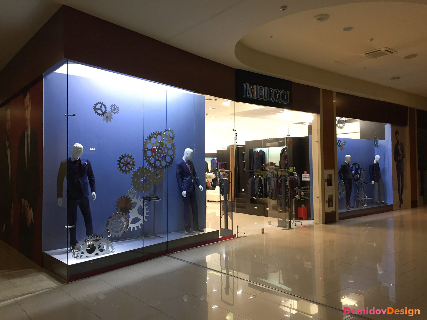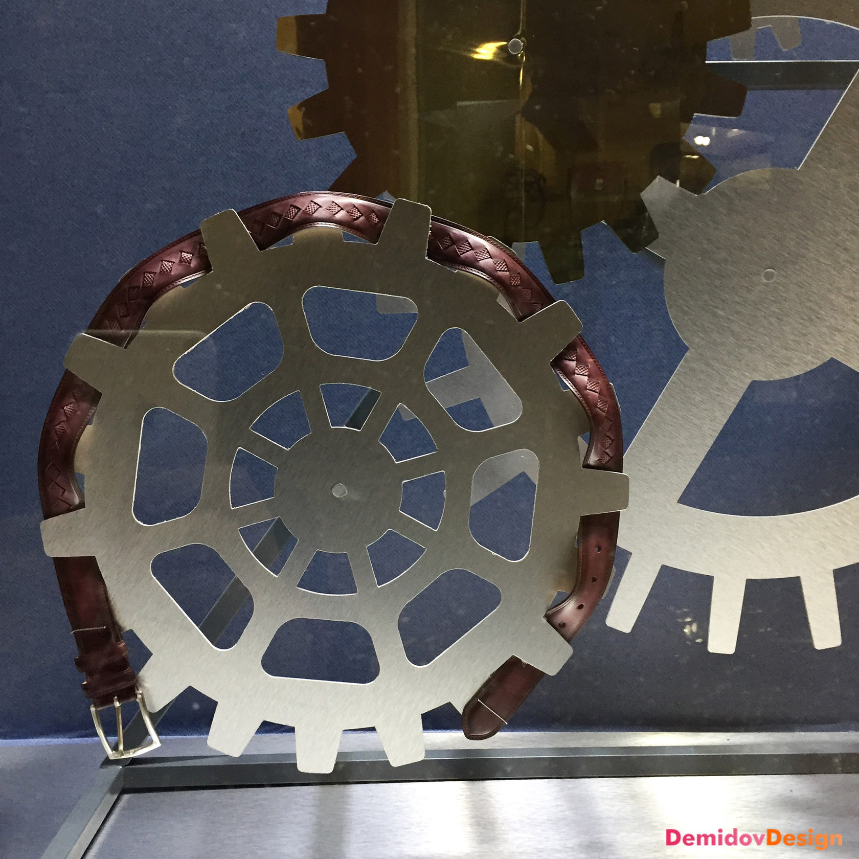 Кинетические витрины в стиле часовых механизмов. Шестеренки приводятся в движение с помощью миниатюрных электродвигателей.