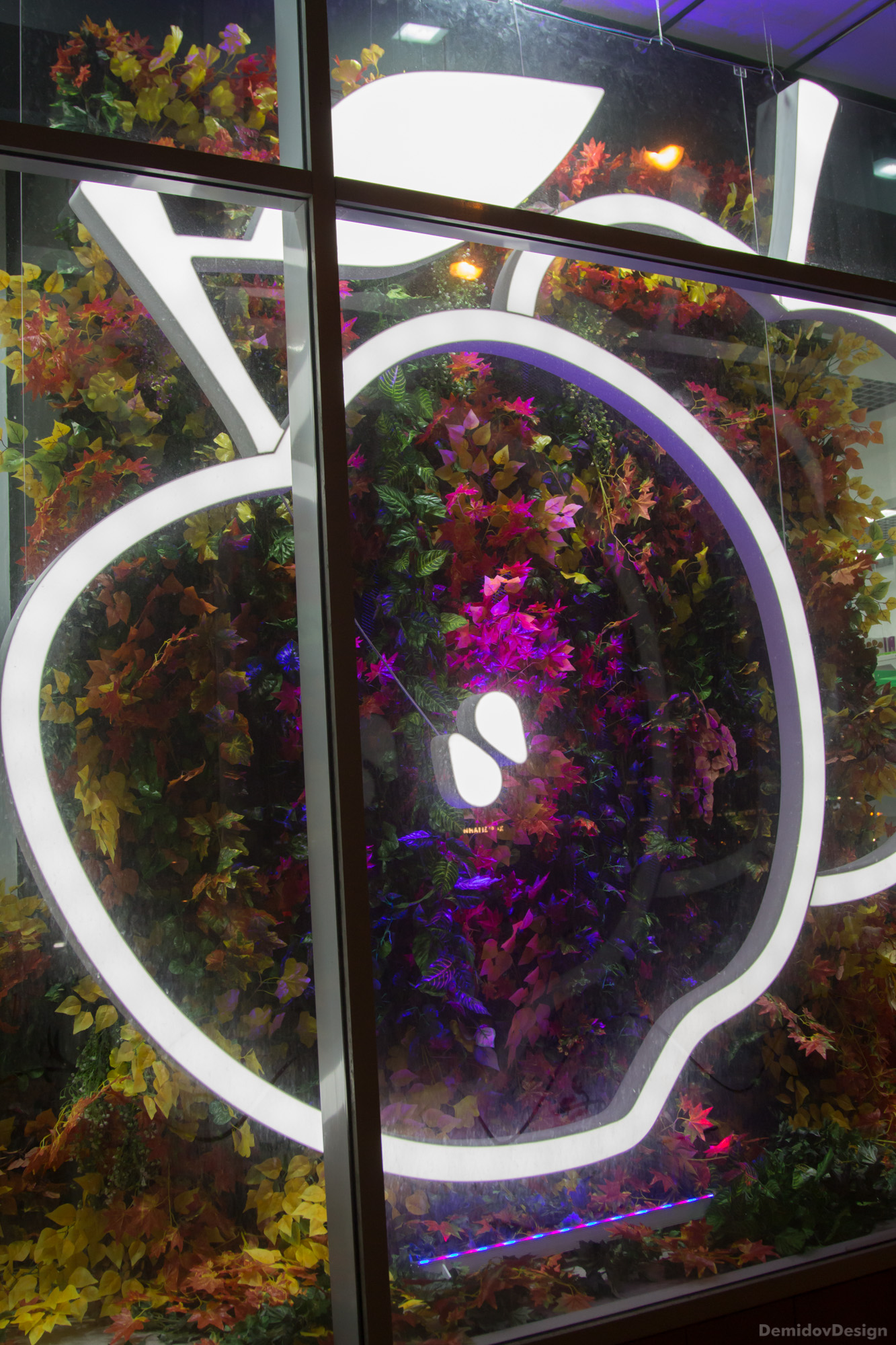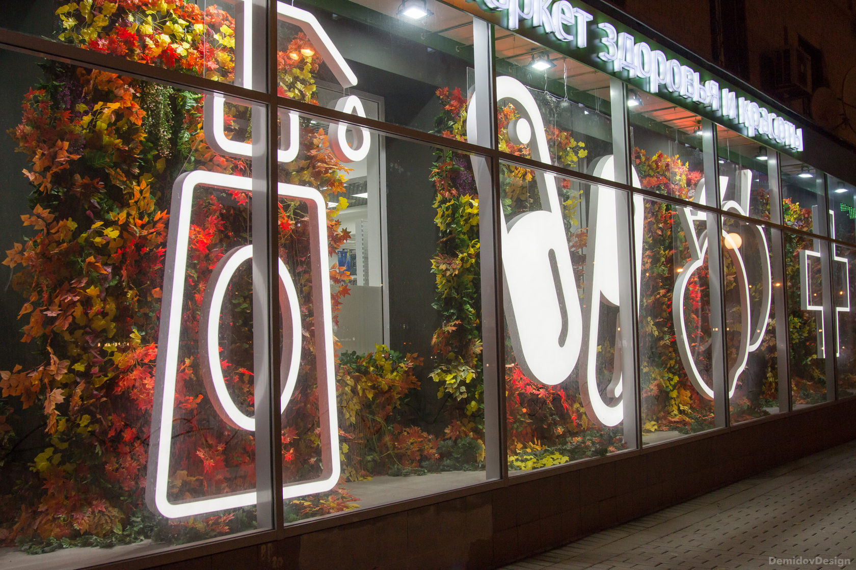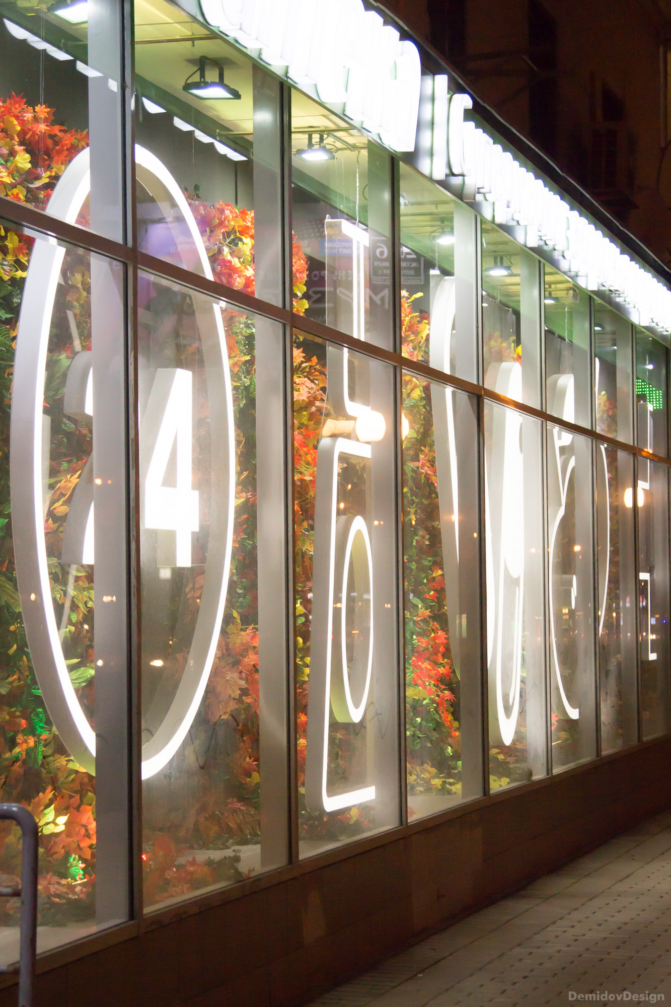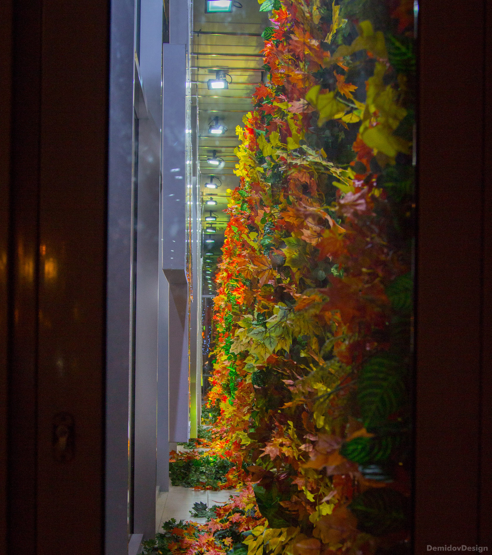 Яркое оформление длинной уличной витрины на Кутузовском проспекте в Москве. Световые объемные фигуры, динамическая подсветка, стены, покрытые искусственной осенней листвой.