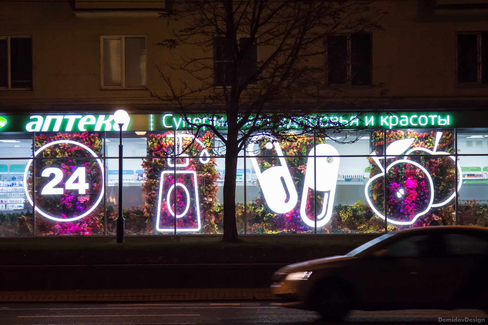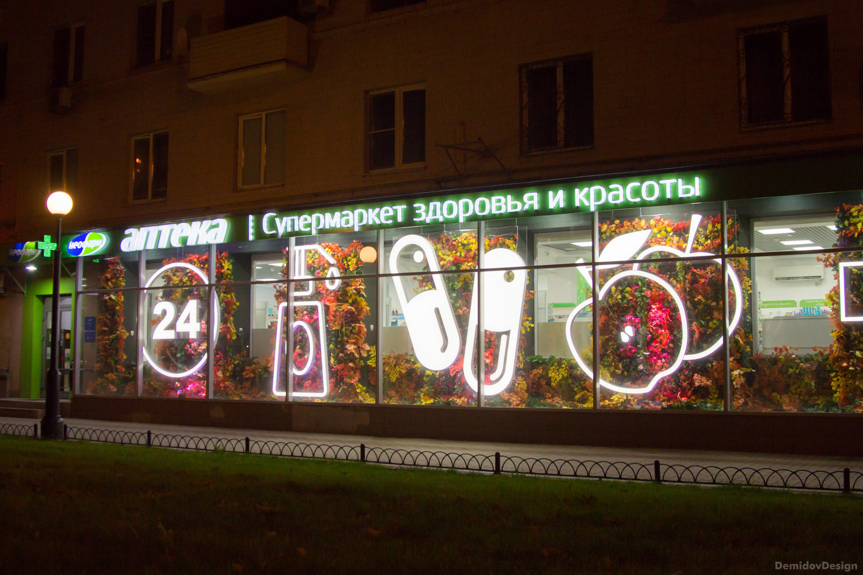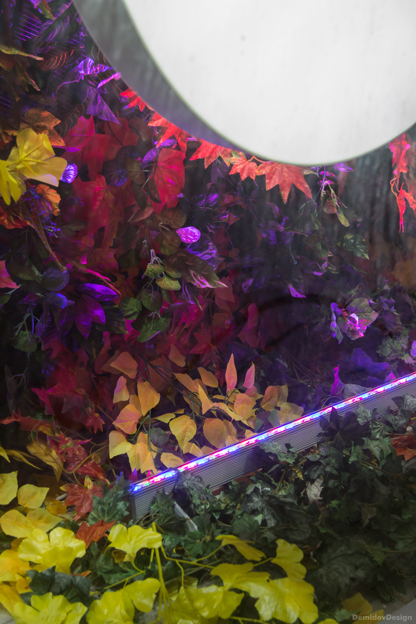 Яркое оформление длинной уличной витрины на Кутузовском проспекте в Москве. Световые объемные фигуры, динамическая подсветка, стены, покрытые искусственной осенней листвой.