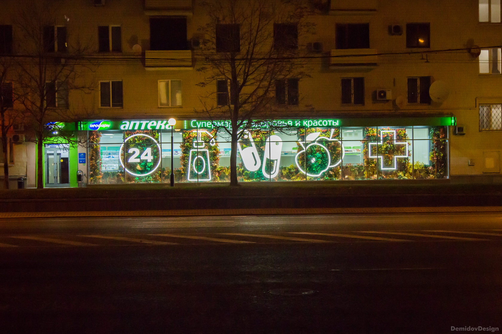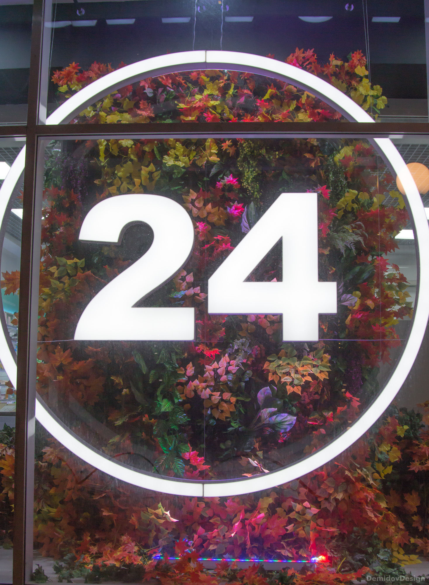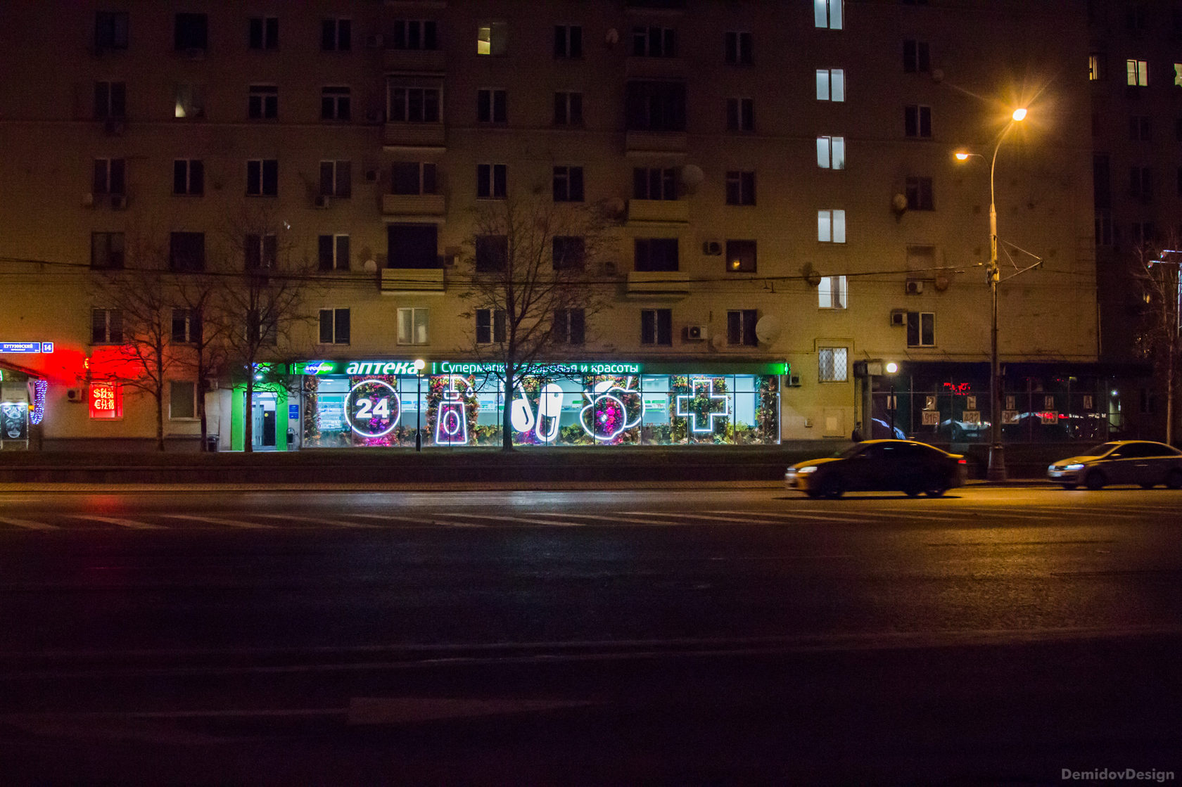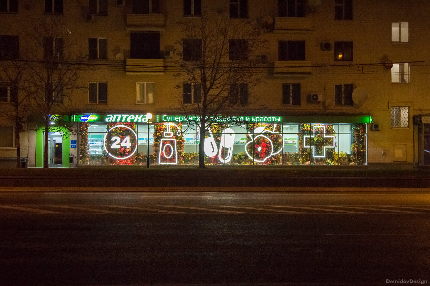 Яркое оформление длинной уличной витрины на Кутузовском проспекте в Москве. Световые объемные фигуры, динамическая подсветка, стены, покрытые искусственной осенней листвой.