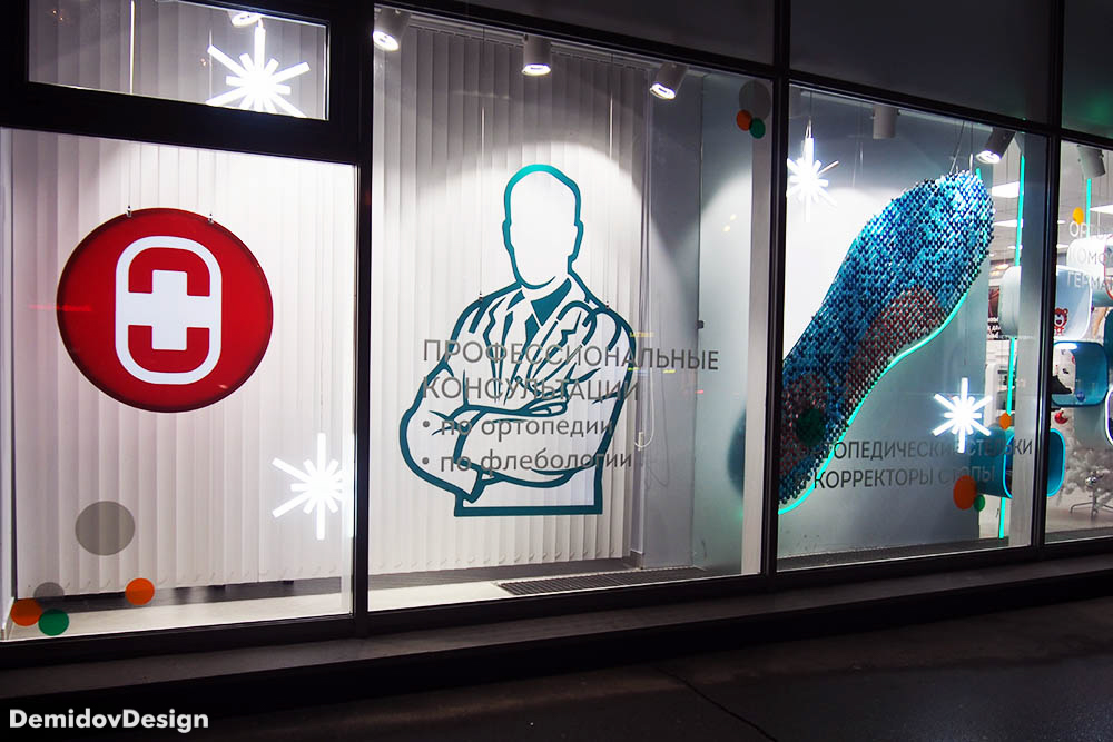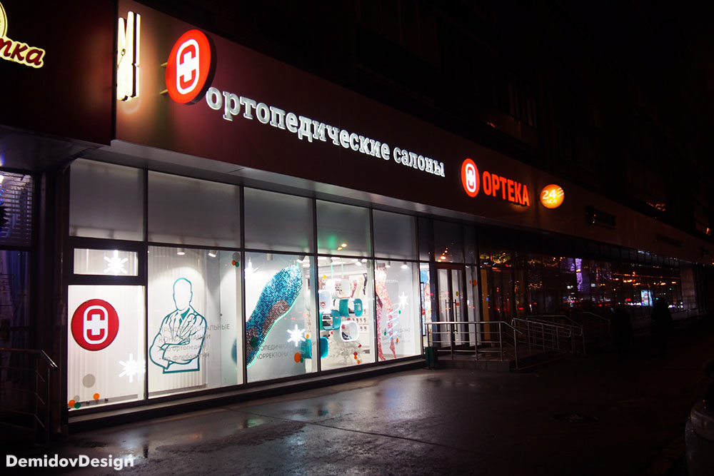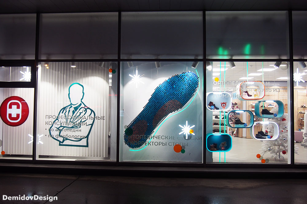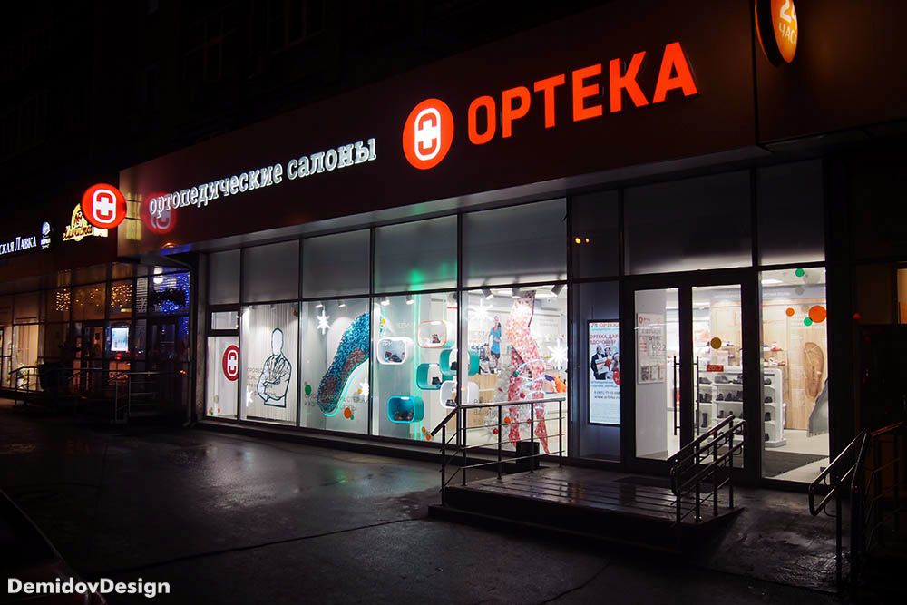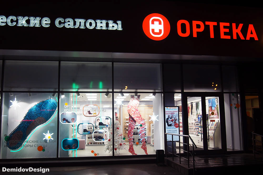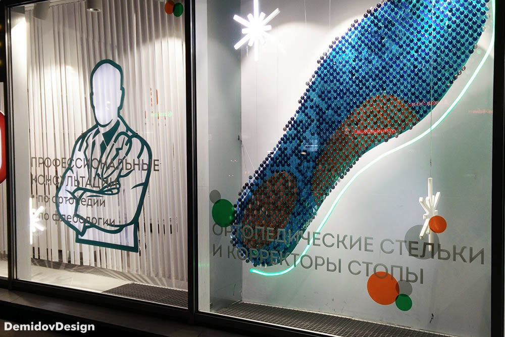 Оформление витрин ортопедических салонов Ортека. Яркий, высокотехнологичный стиль оформления с применением гибкого неона, торцевой подсветки, подвесных панелей и множества других материалов.
