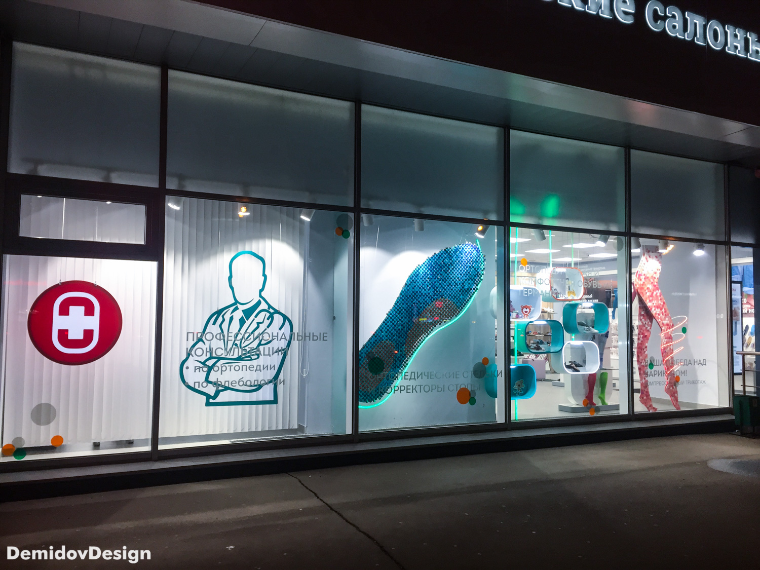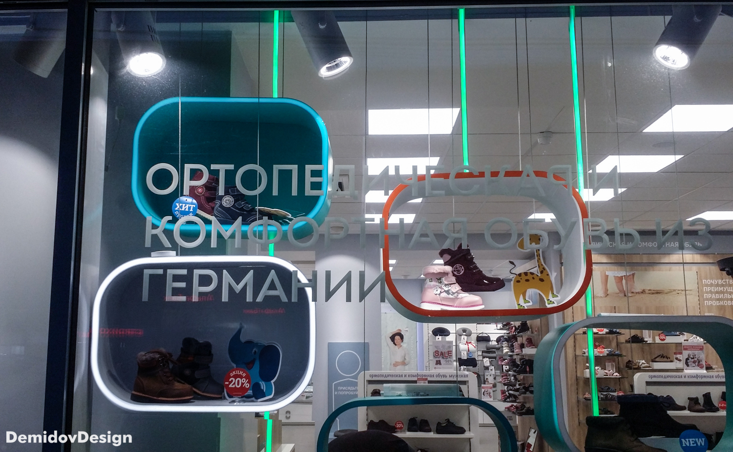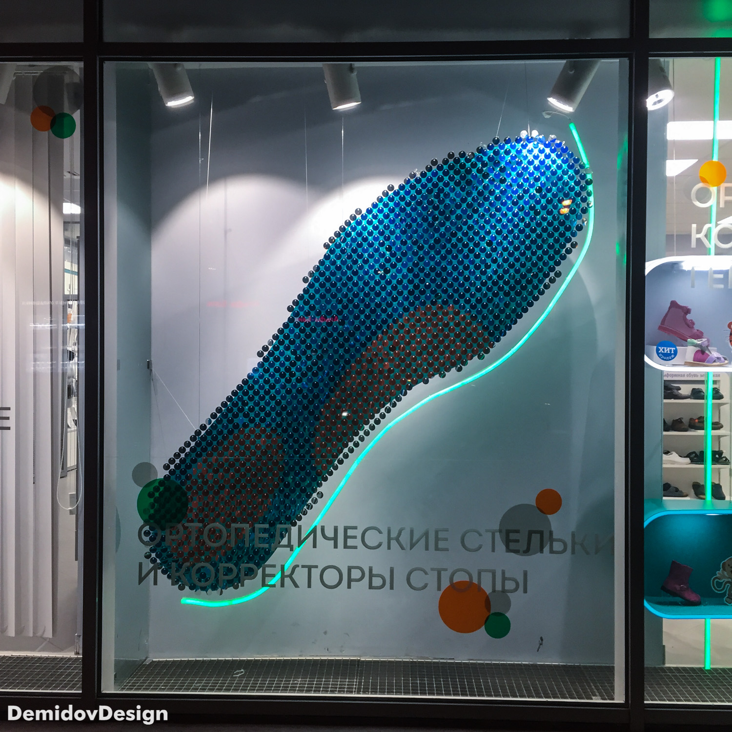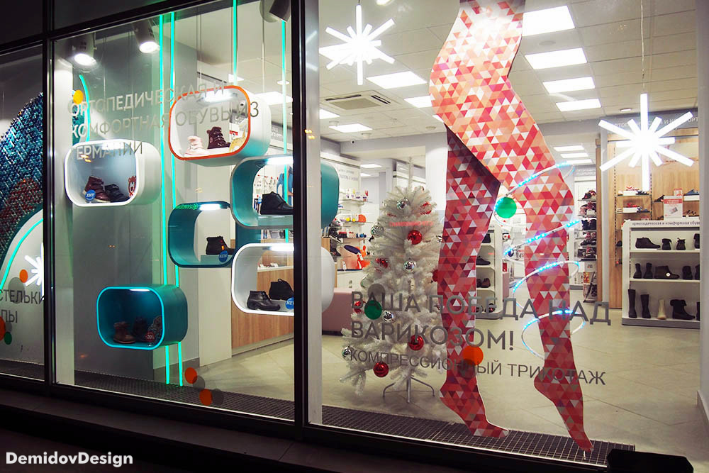 Оформление витрин ортопедических салонов Ортека. Яркий, высокотехнологичный стиль оформления с применением гибкого неона, торцевой подсветки, подвесных панелей и множества других материалов.