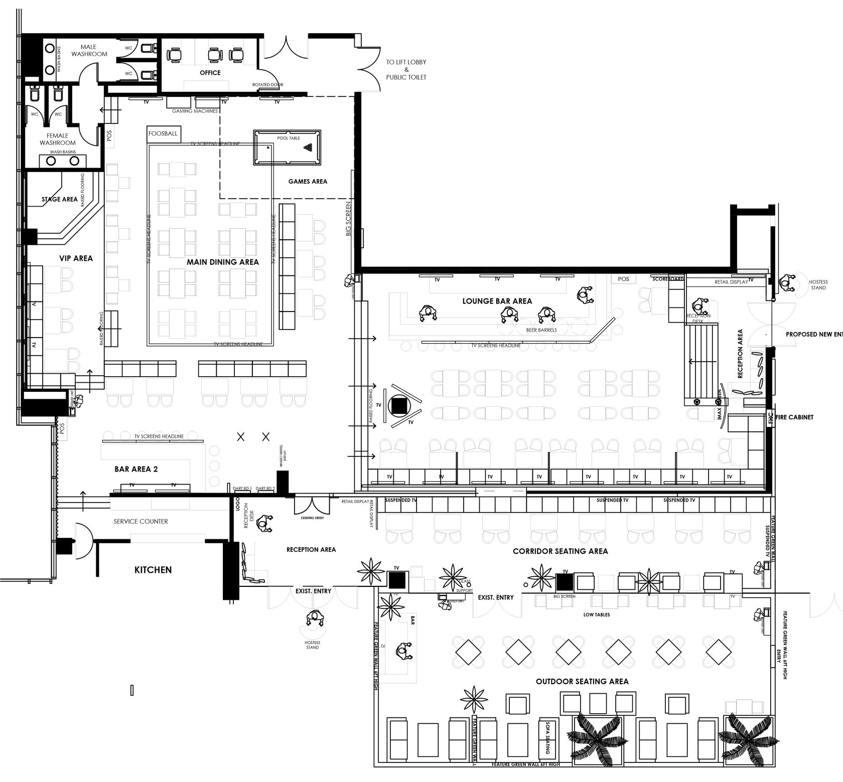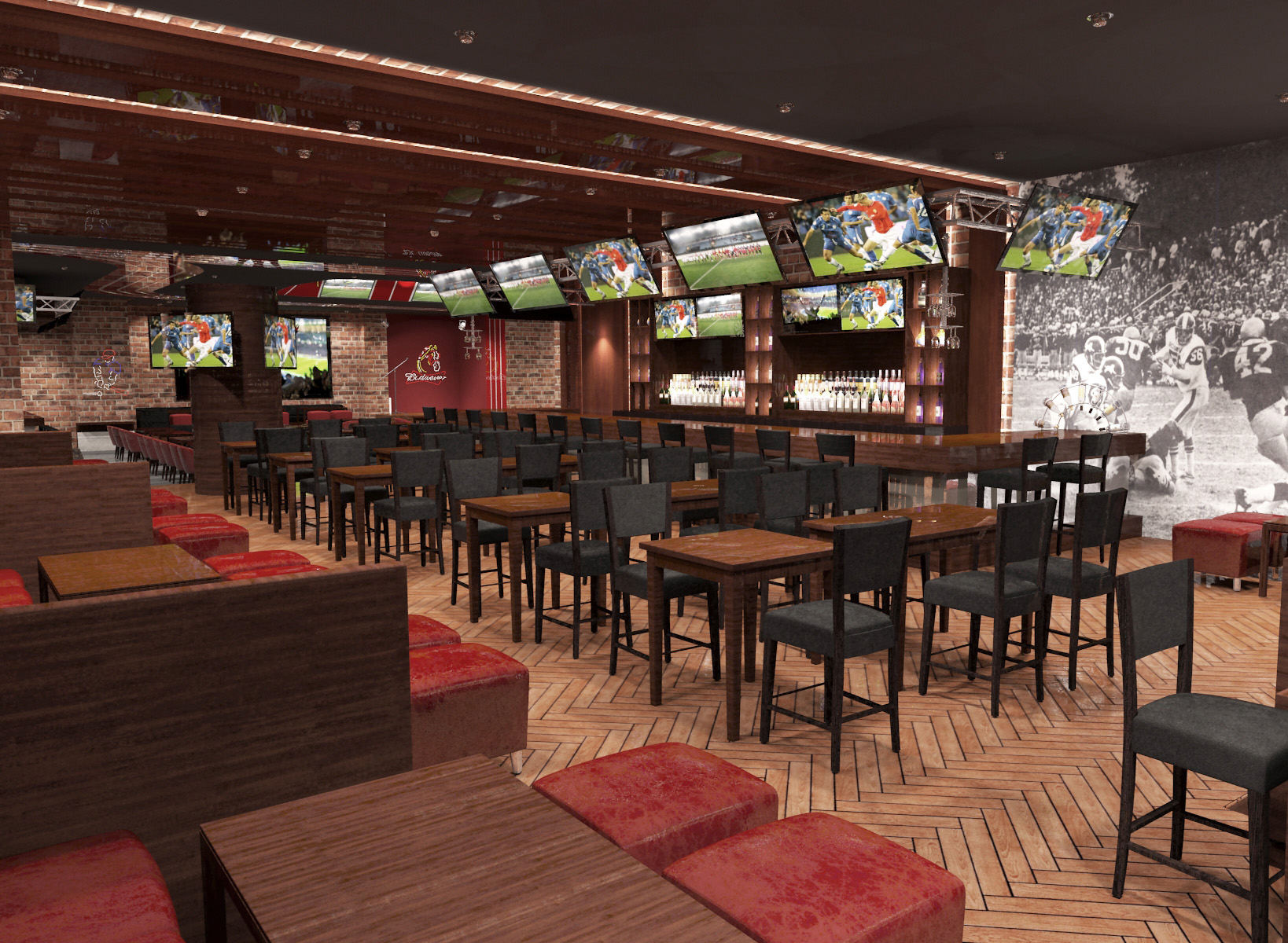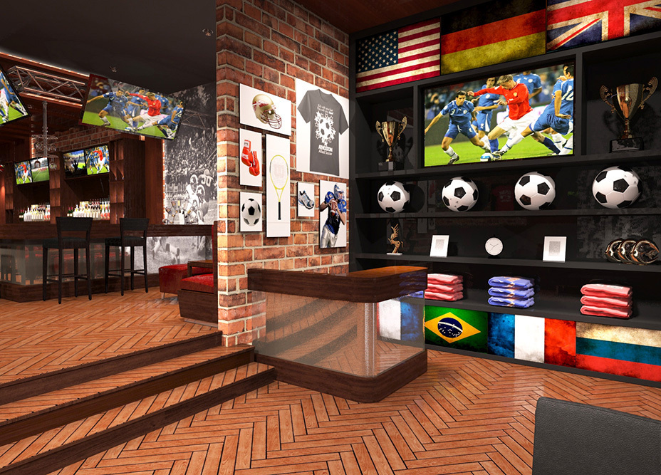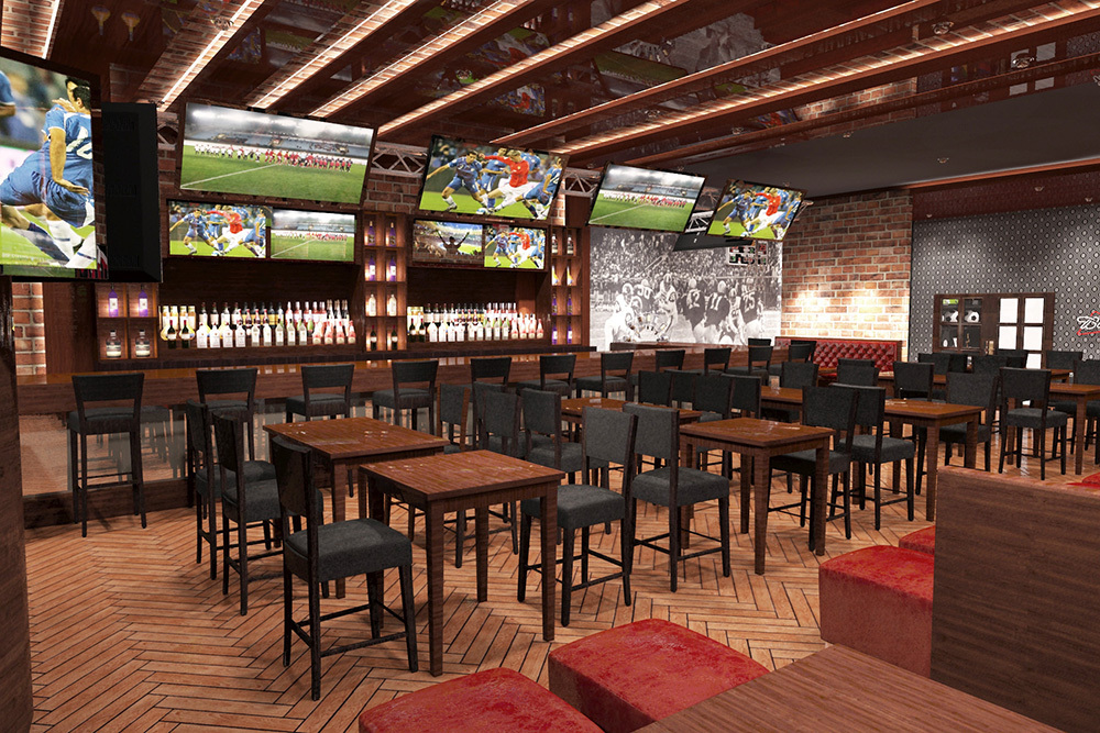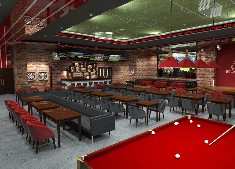Дизайн интерьера спортивного бара со множеством посадочных мест. Проект разрабатывался в преддверии чемпионата мира по футболу 2018 в России.
