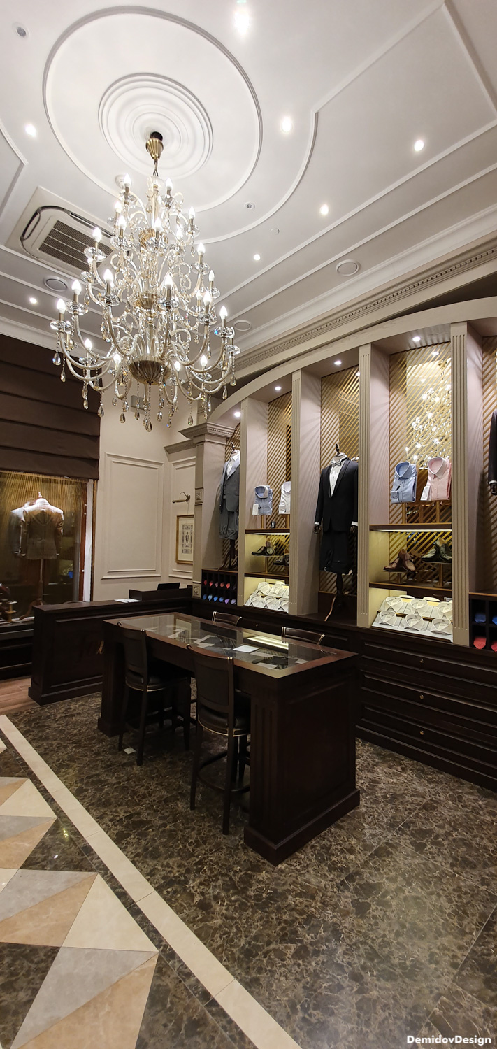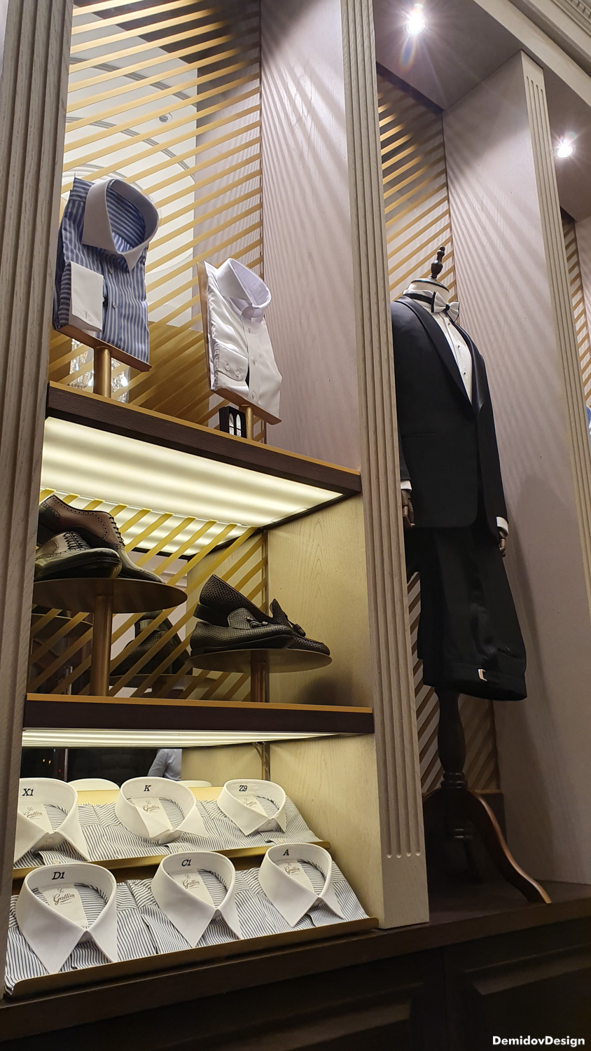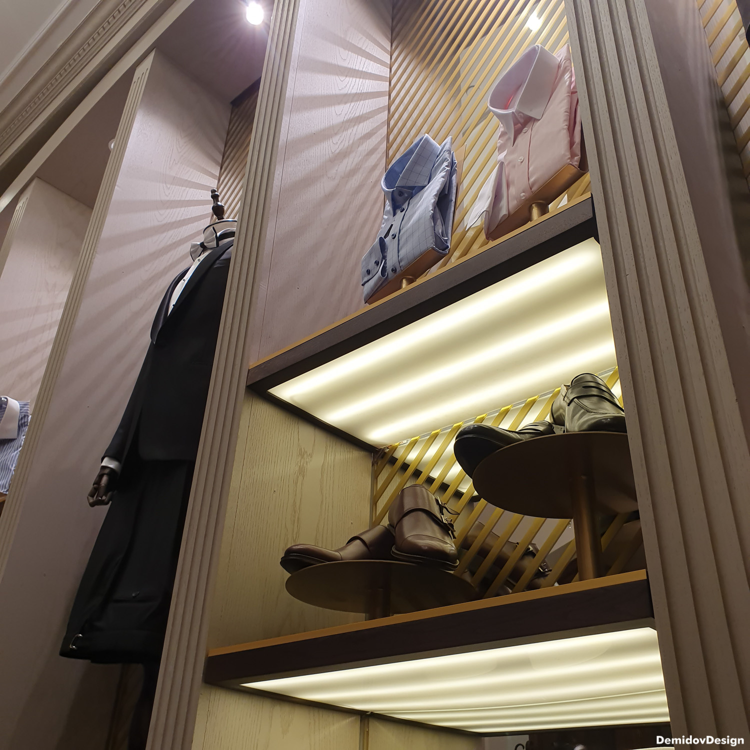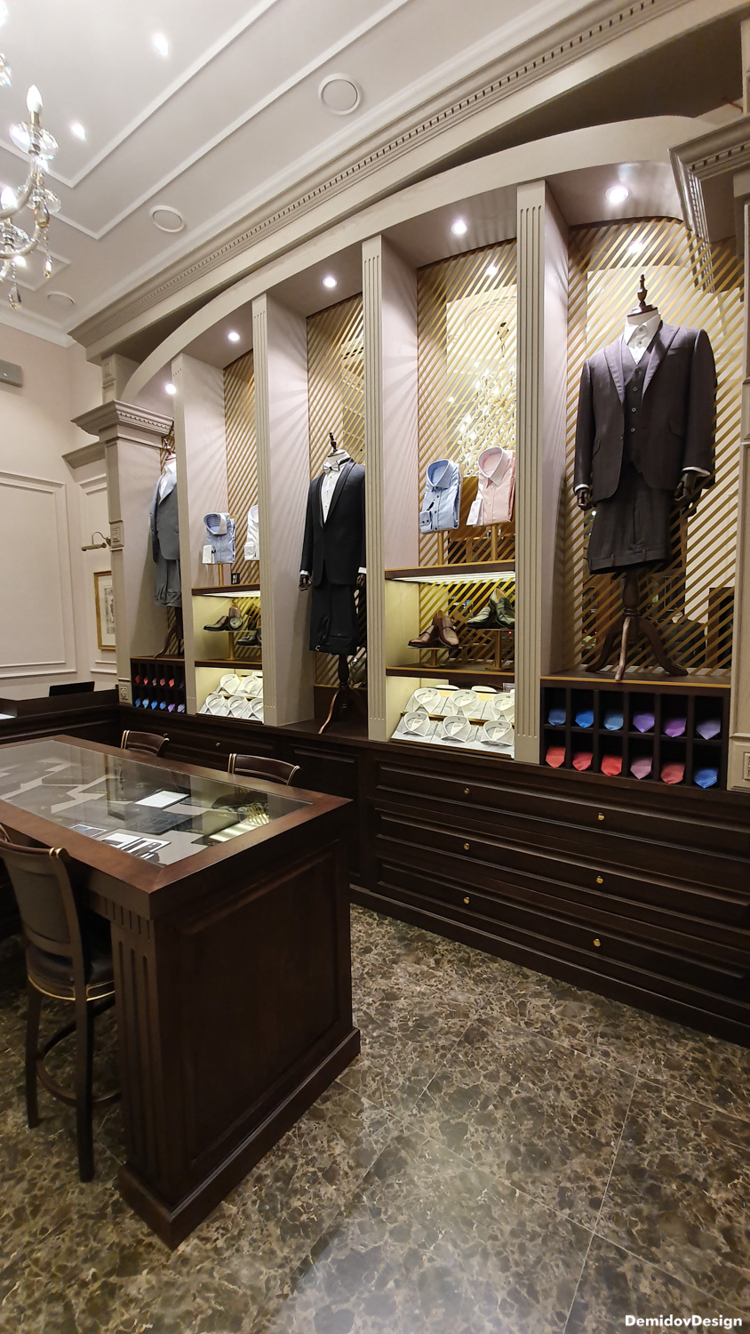Проект оформления для стены с торговым оборудованием и манекенами. В поддержку оформления витрин и дизайна интерьера нами были разработаны световые элементы, полки и подставки для продукции а также оформление зеркал для придания уютной атмосферы в бутике.