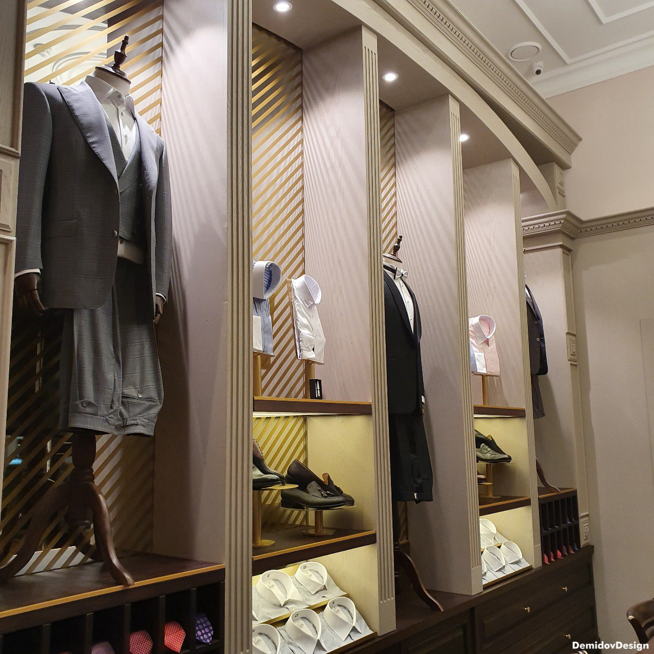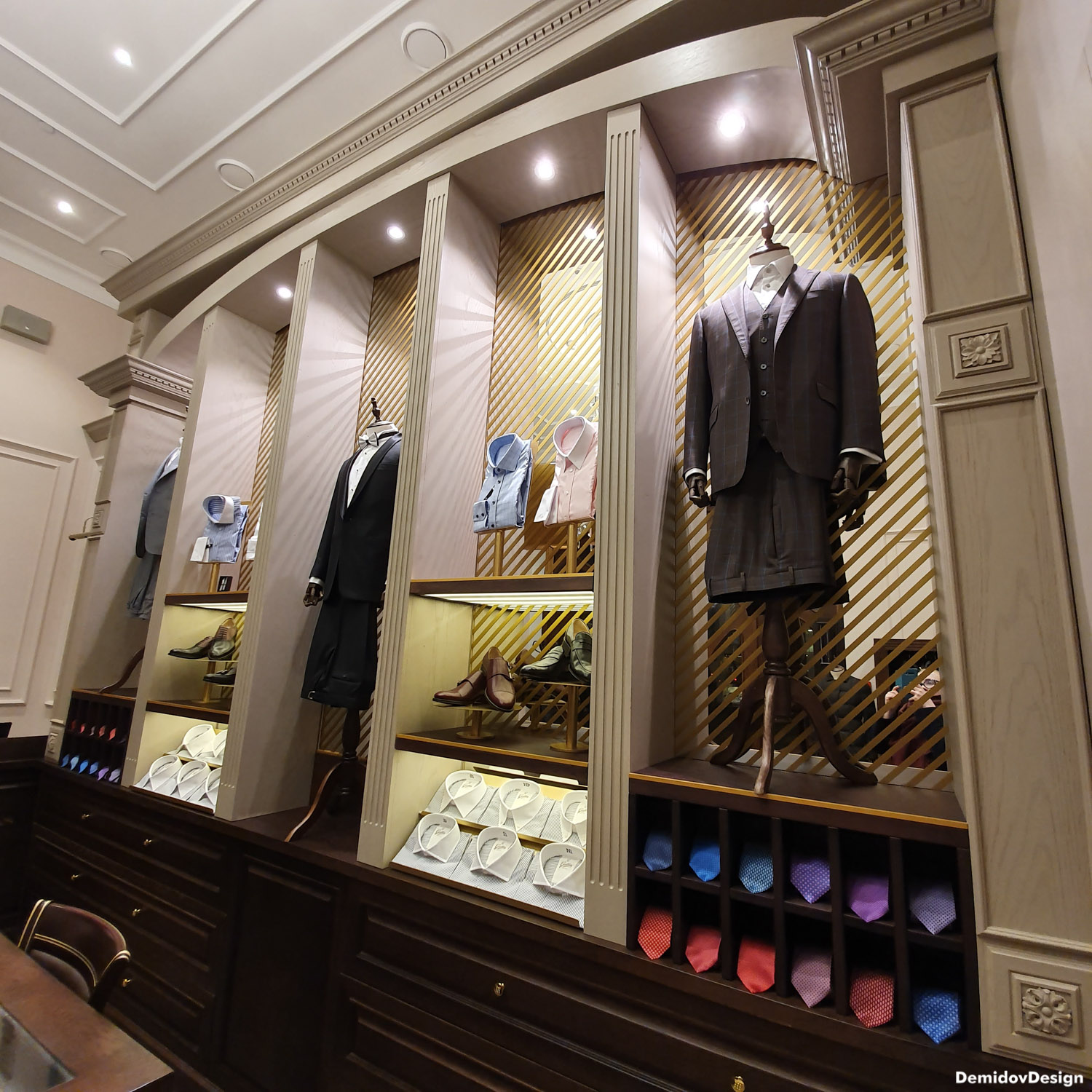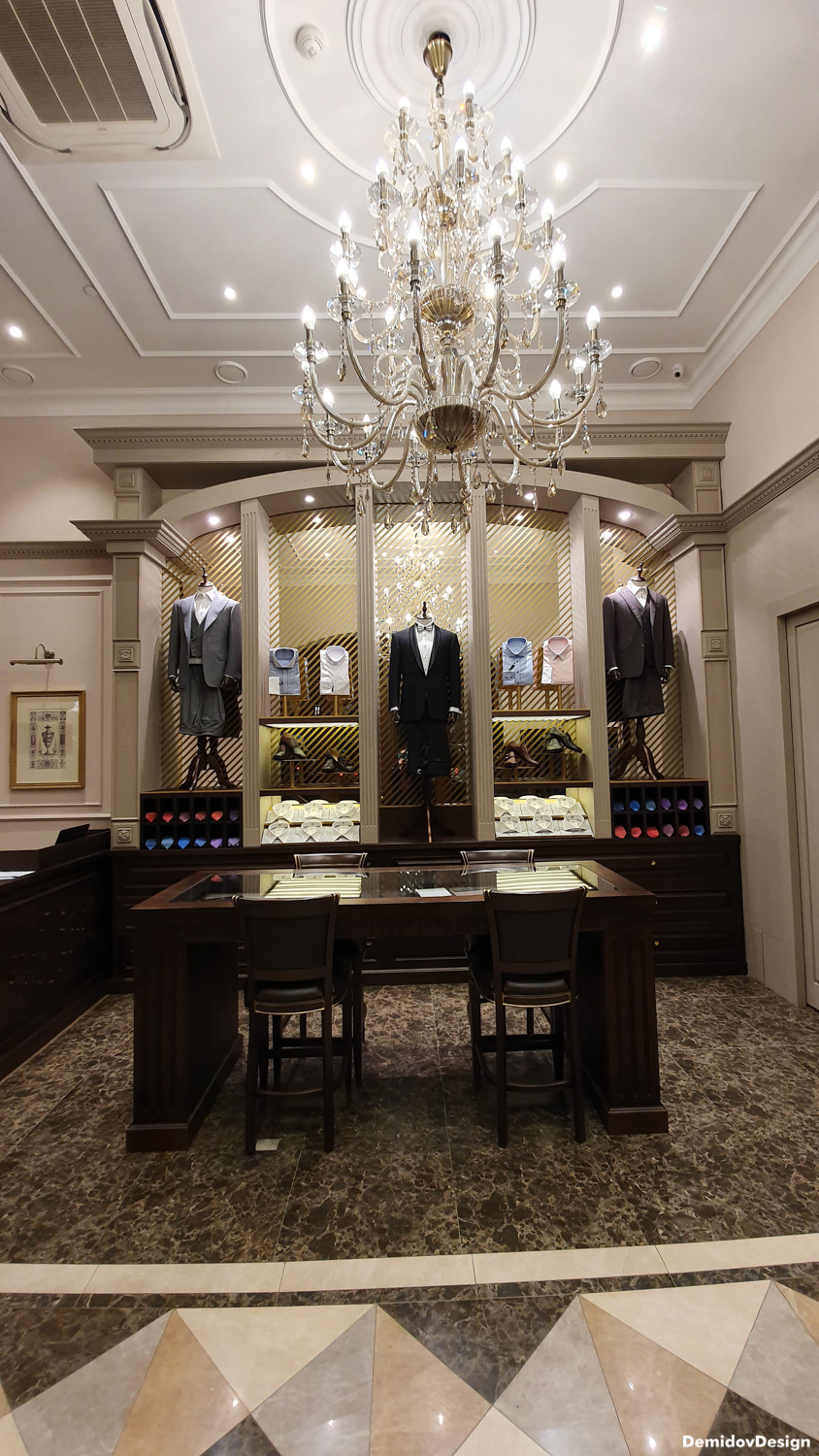 Проект оформления для стены с торговым оборудованием и манекенами. В поддержку оформления витрин и дизайна интерьера нами были разработаны световые элементы, полки и подставки для продукции а также оформление зеркал для придания уютной атмосферы в бутике.