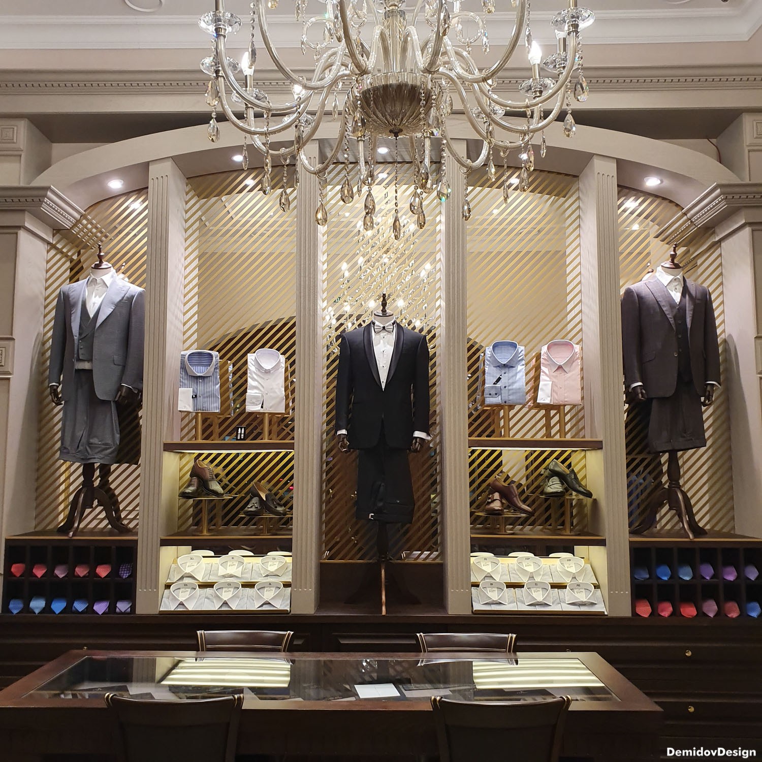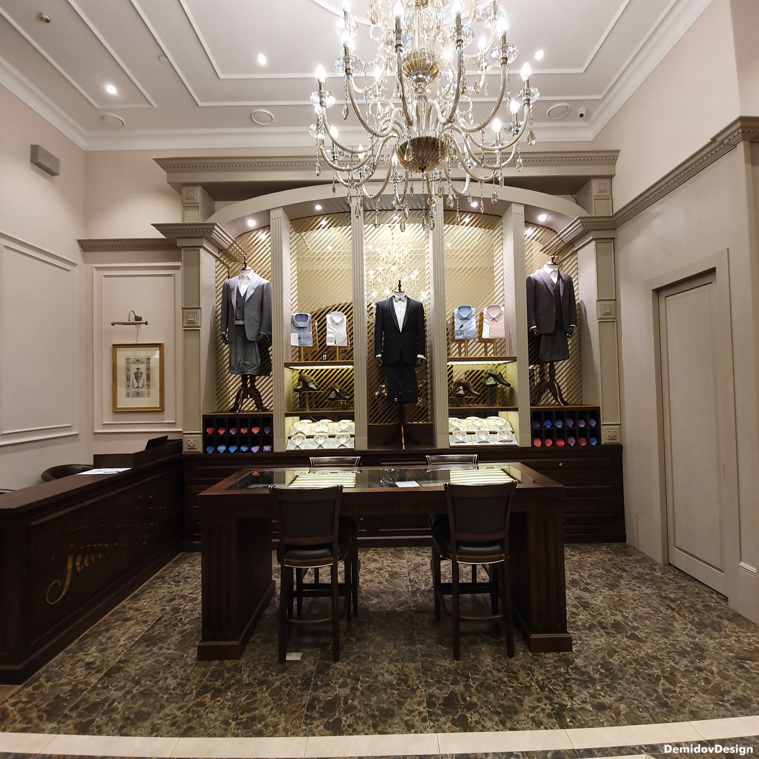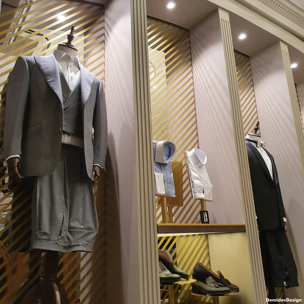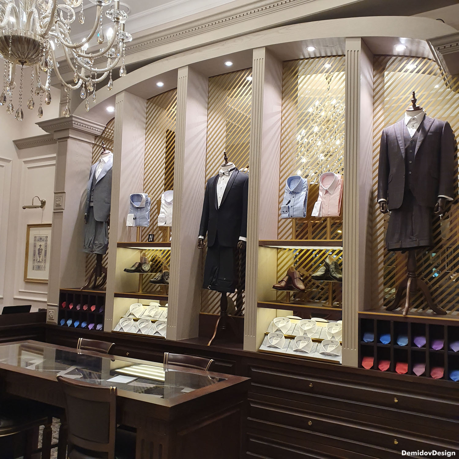Проект оформления для стены с торговым оборудованием и манекенами. В поддержку оформления витрин и дизайна интерьера нами были разработаны световые элементы, полки и подставки для продукции а также оформление зеркал для придания уютной атмосферы в бутике.