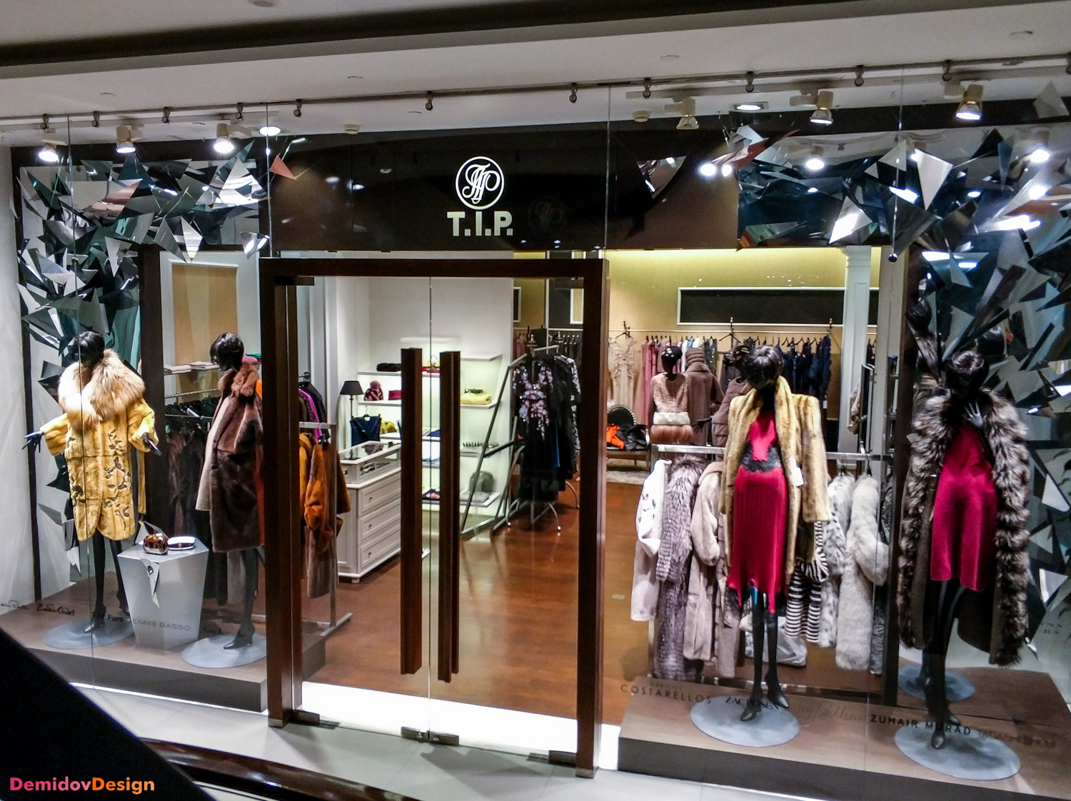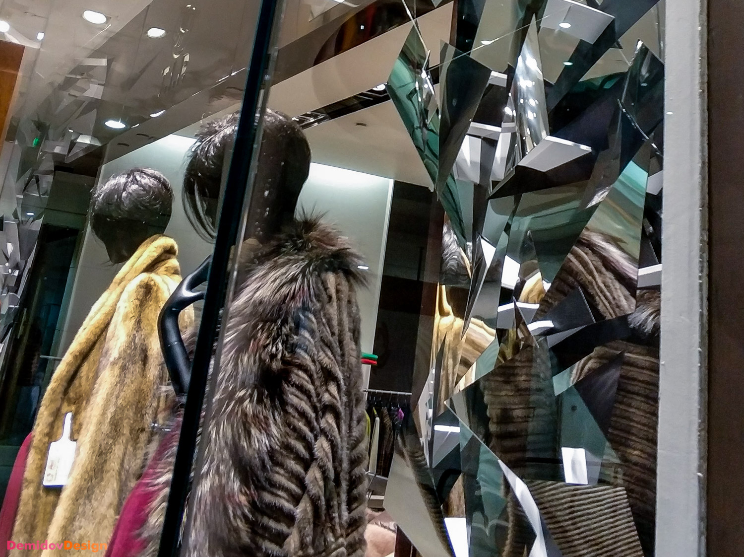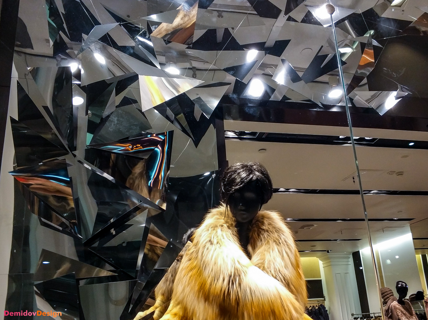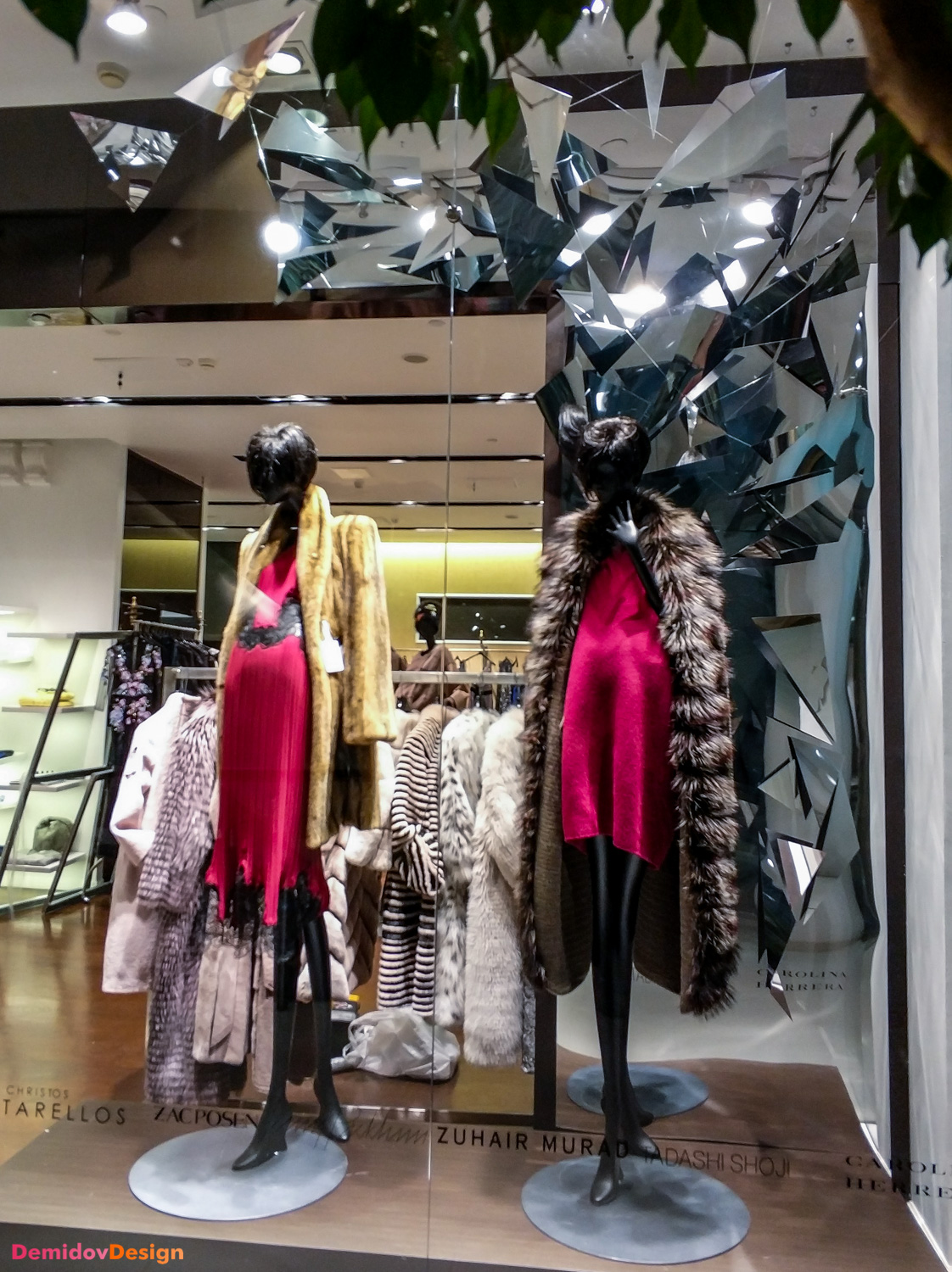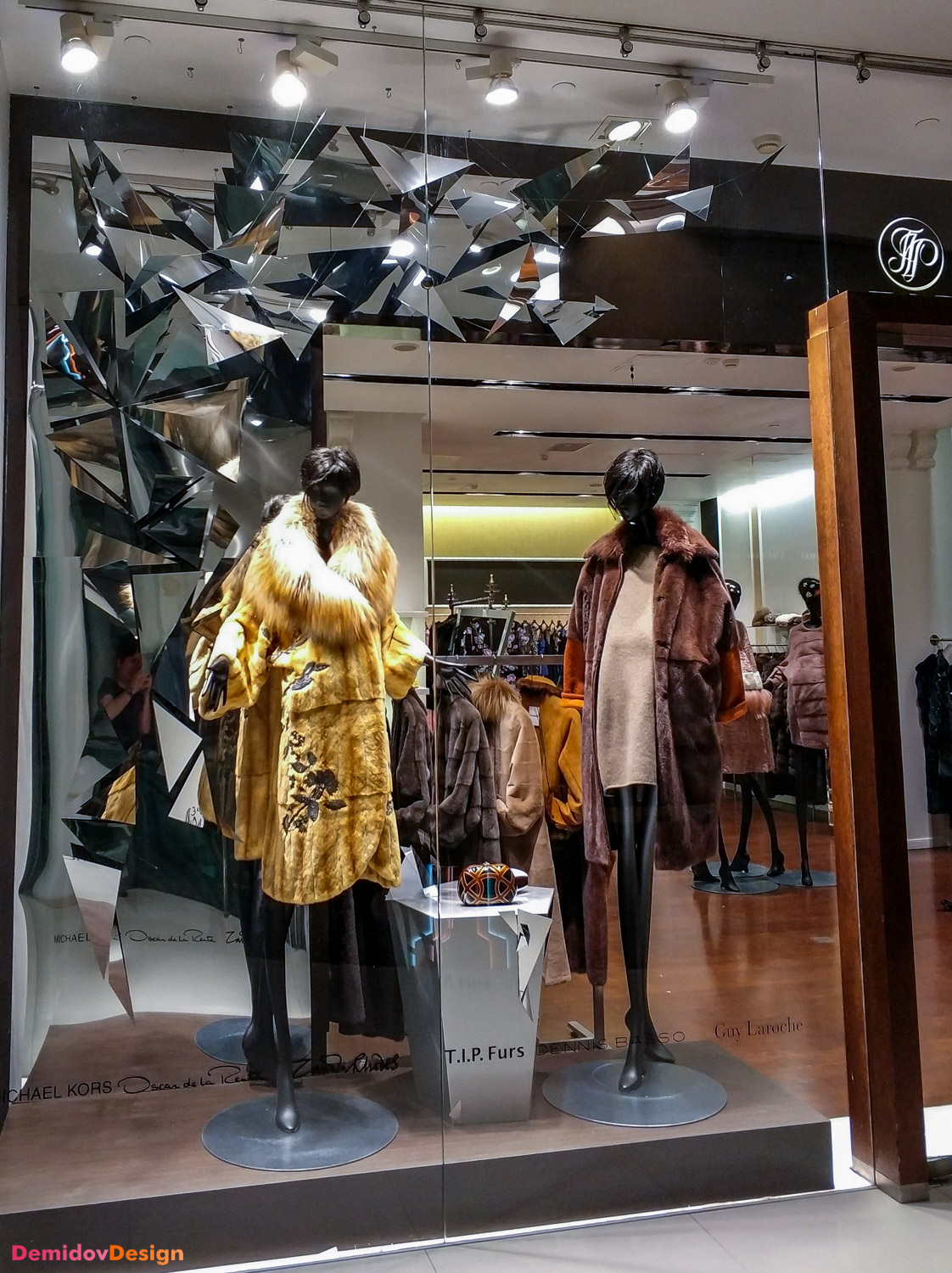 Для новогоднего оформления витрины бутика T.I.P. Furs были использованы зеркальные полигональные фигуры, наполнившие пространство таким образом, чтобы создавалось ощущение ледяной пещеры. Свет, отражаясь от множества плоскостей, превращается в искрящиеся блики и привлекает внимание к витрине.