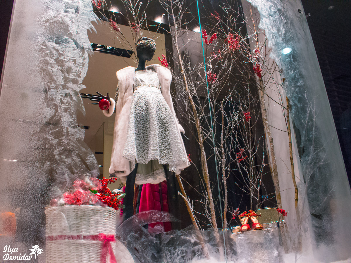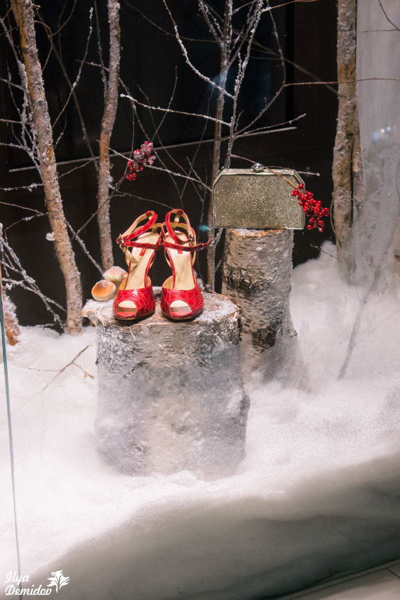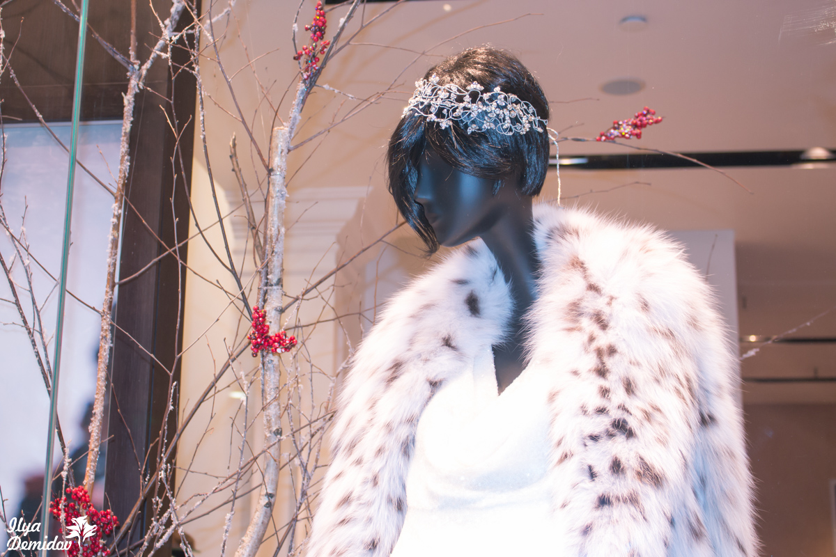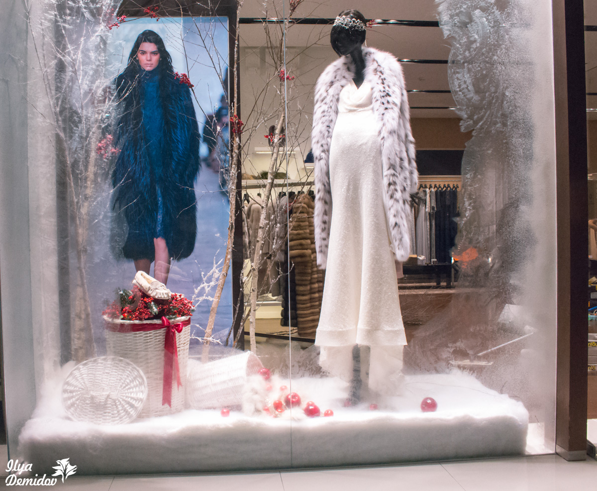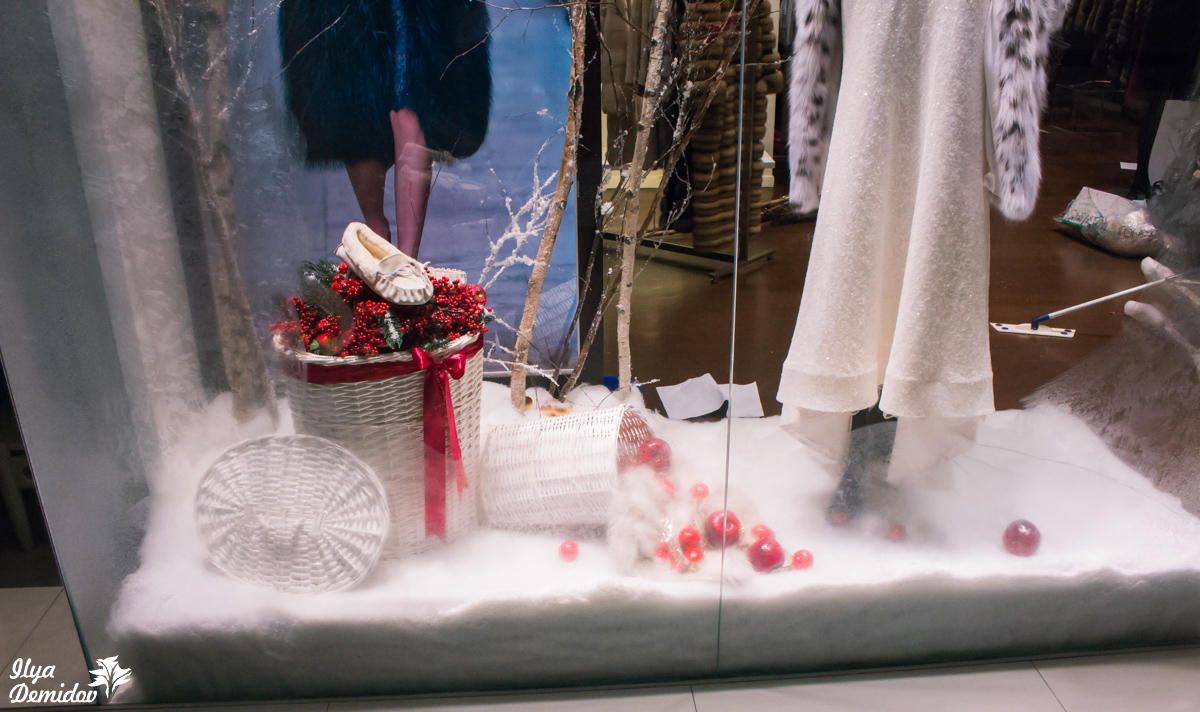 Витрины бутика T.I.P. Furs в торговом доме Времена Года стали уголком настоящей снежной зимы: стекла покрылись морозными узорами, а ветви рябины инеем. Манекены в белых мехах собирают яркие красные ягоды и фрукты в белые корзины, чтобы сохранить их на долгую, но уютную зиму.