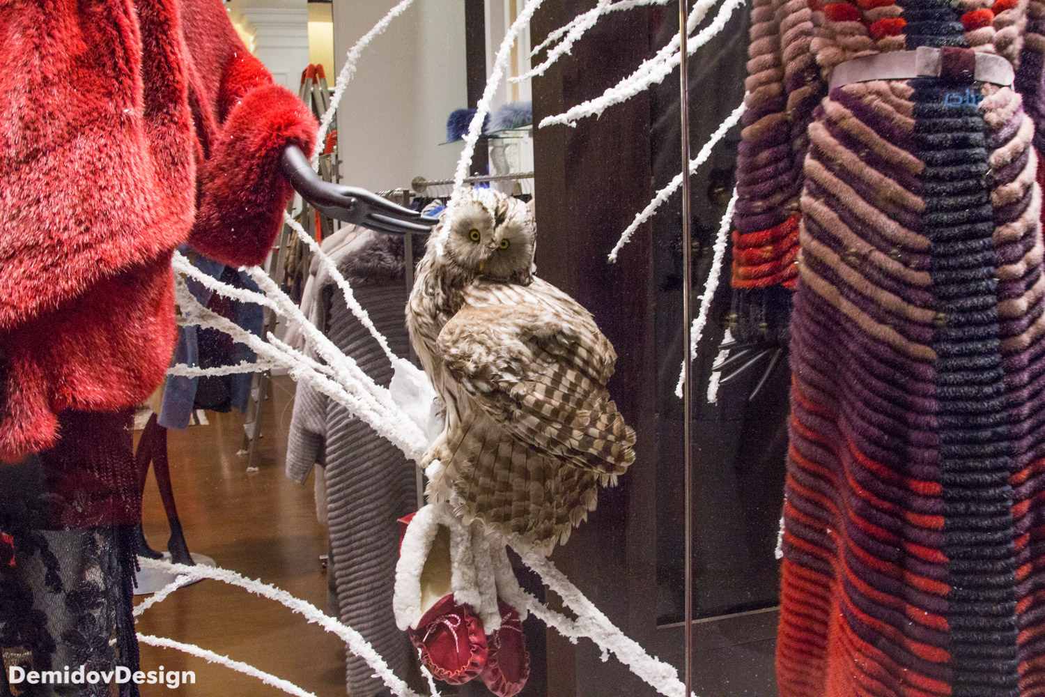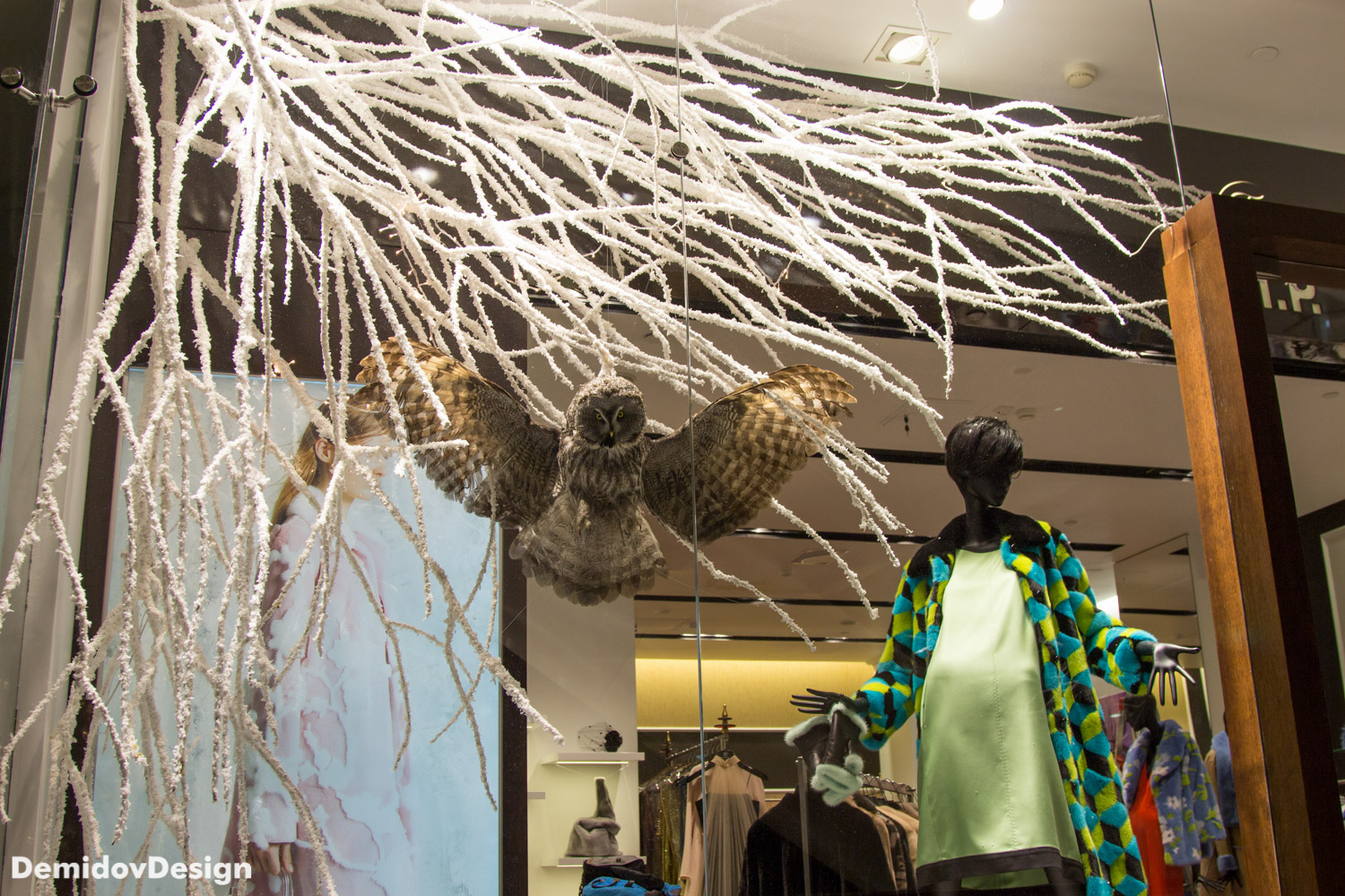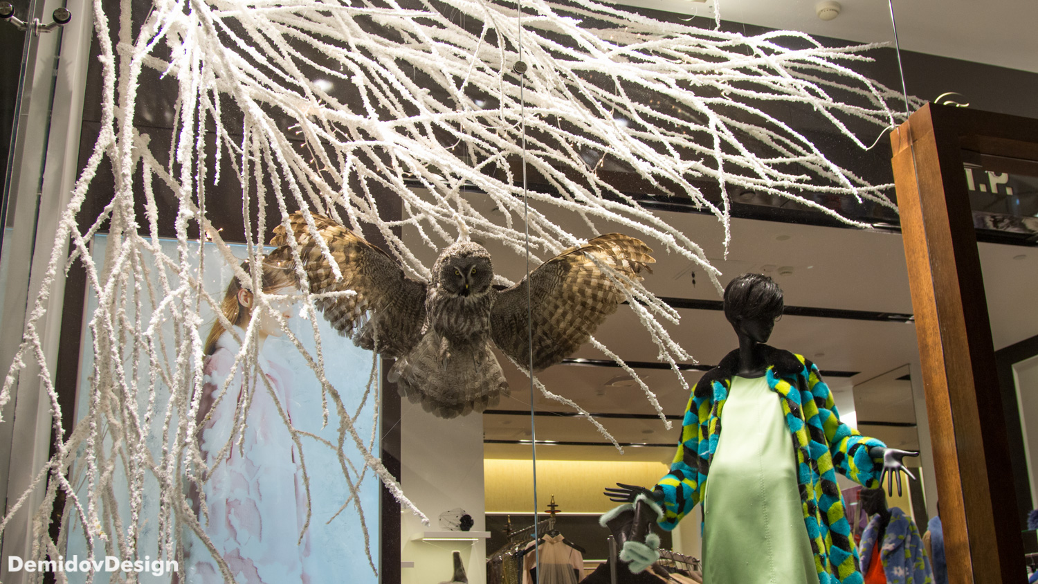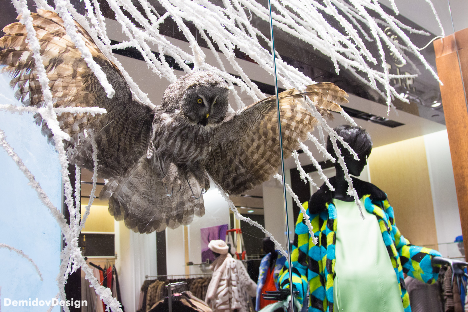 Необыкновенные заснеженные ветви в витринах мехового салона T.I.P. Furs в торговом центре "Времена Года" в Москве были бы неполными, если бы на них грациозно не восседали потрясающие совы.
