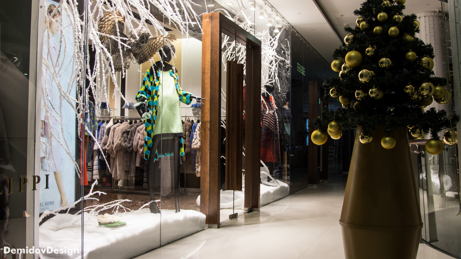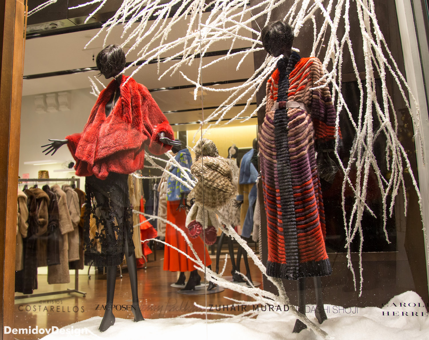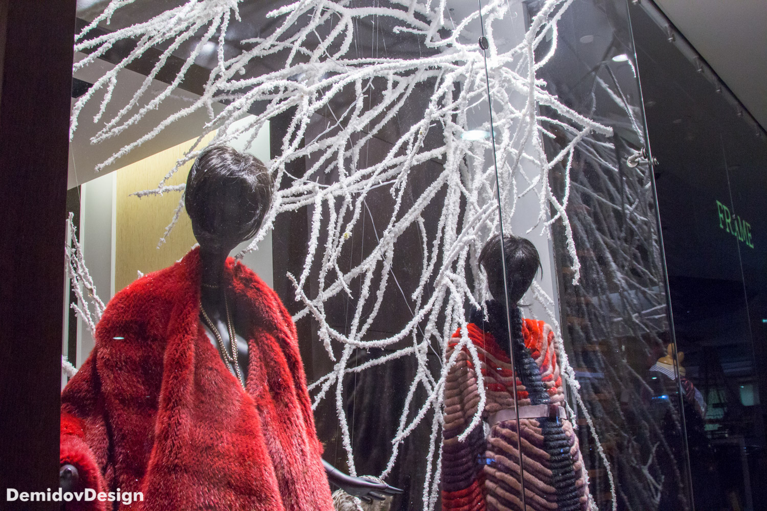 Необыкновенные заснеженные ветви в витринах мехового салона T.I.P. Furs в торговом центре "Времена Года" в Москве были бы неполными, если бы на них грациозно не восседали потрясающие совы.