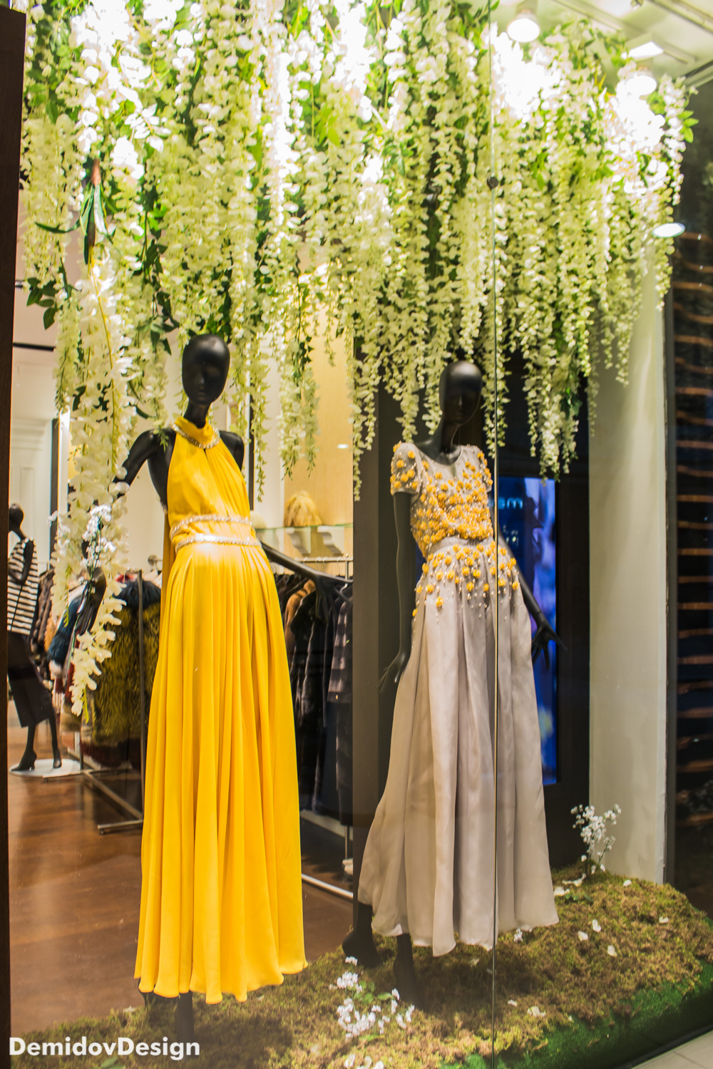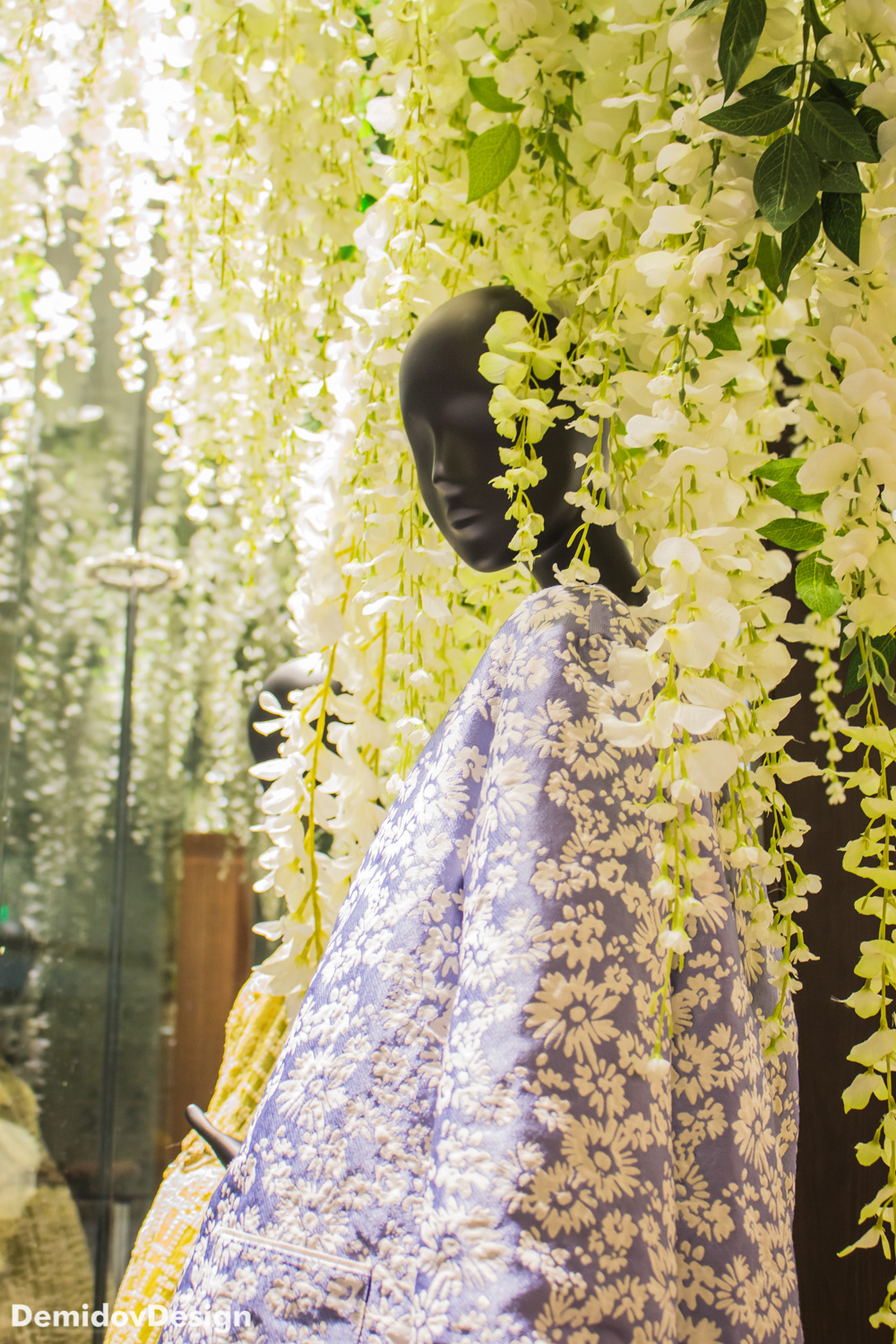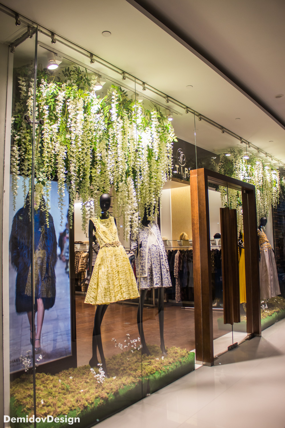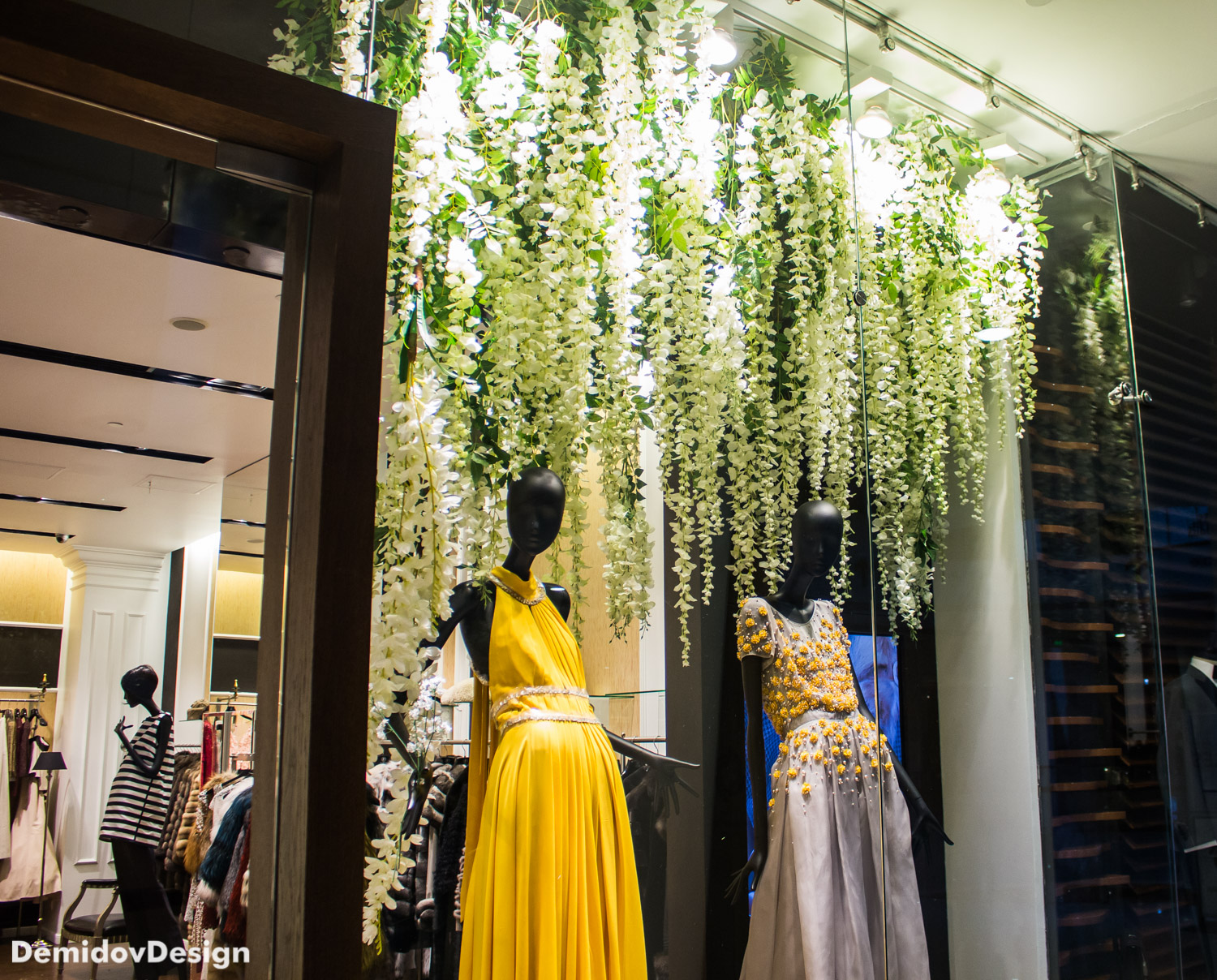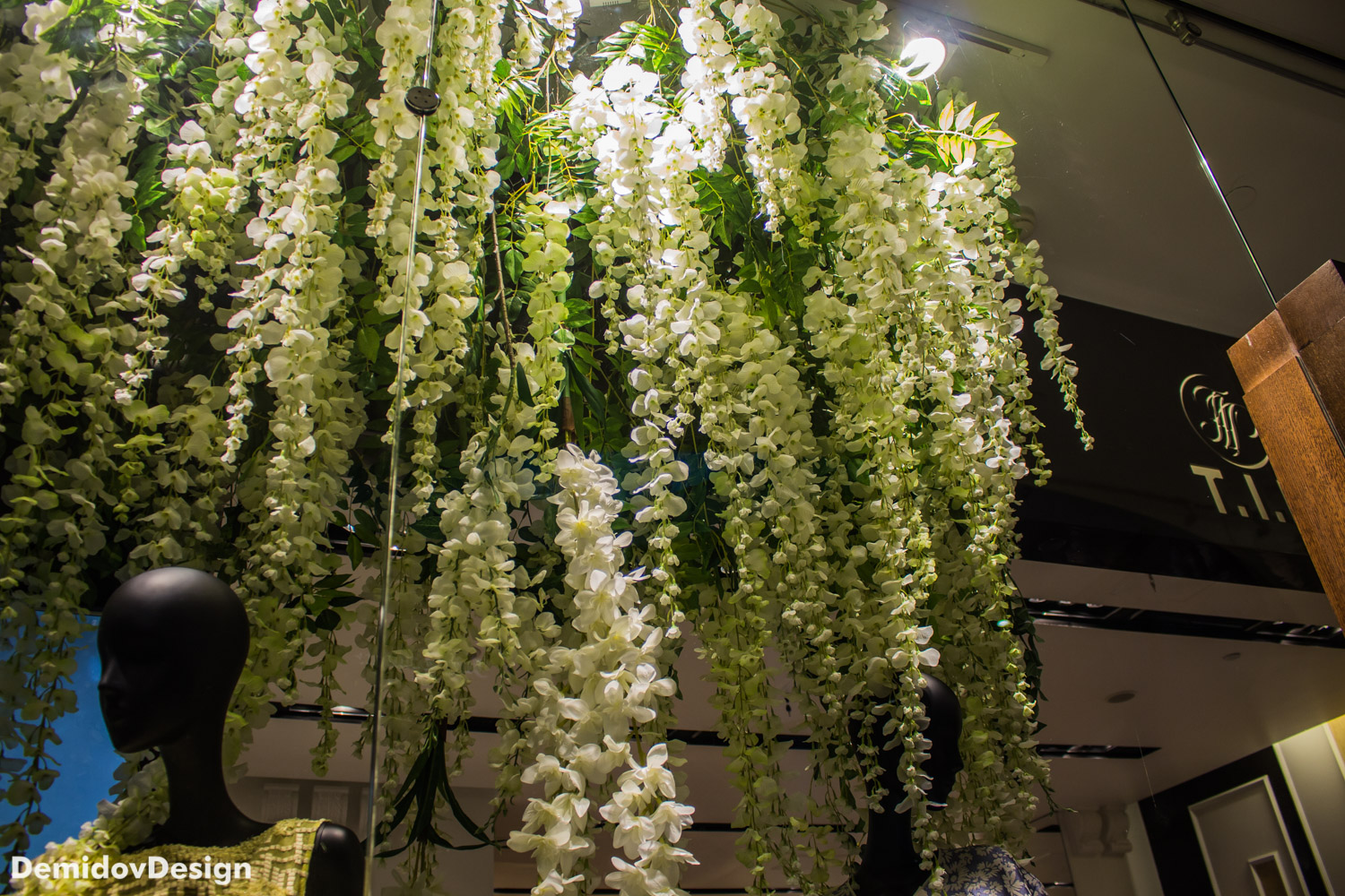 Витрина выполнена из сотен шелковых цветов акации, подвешенных в пространстве. Цветы создают ощущение уютного уголка под деревьями в саду. Подиумы в витрине покрыты натуральным мхом.