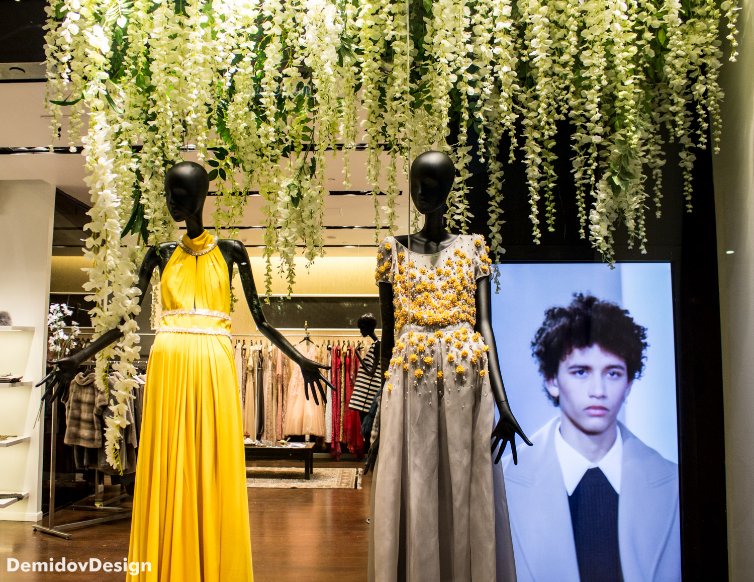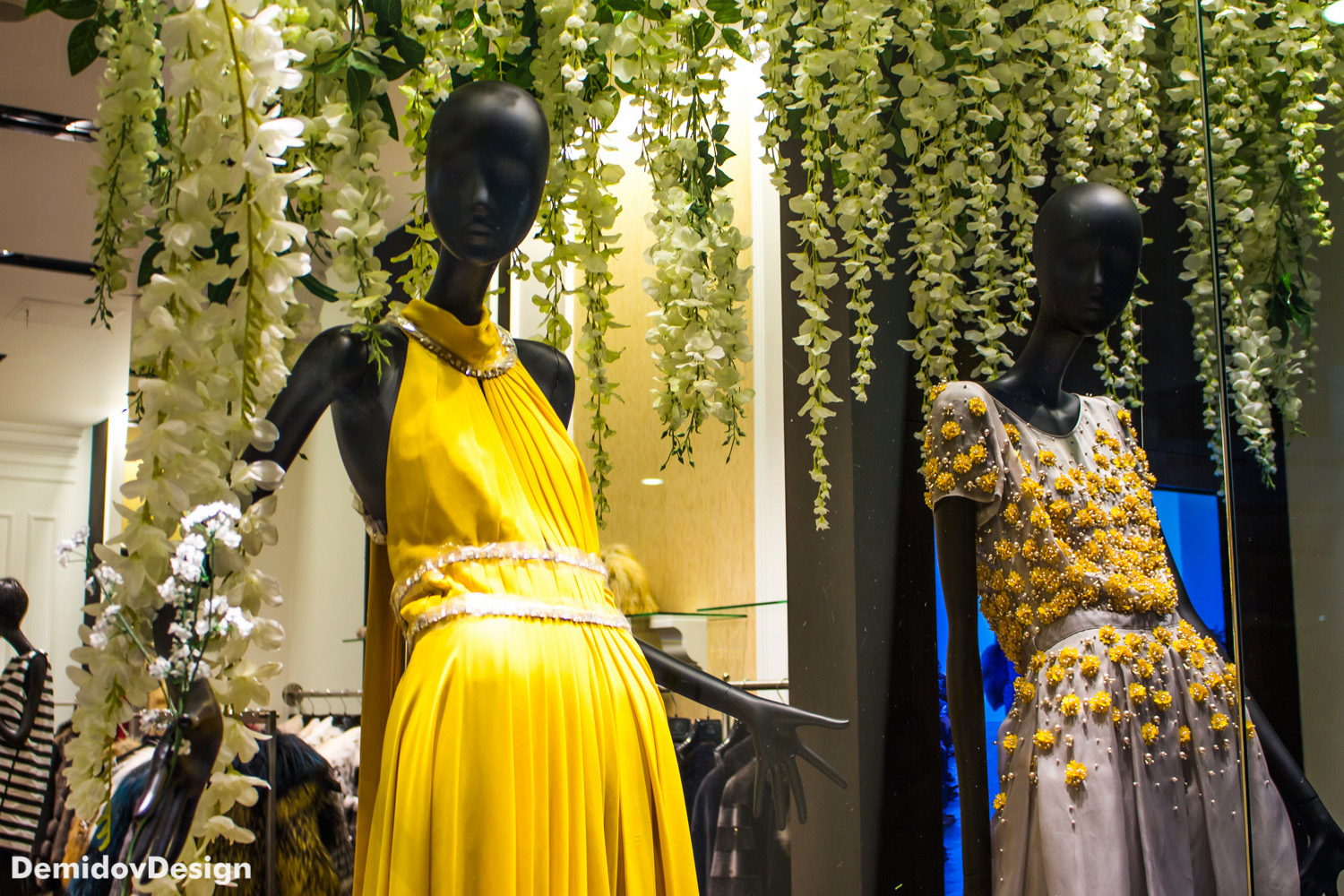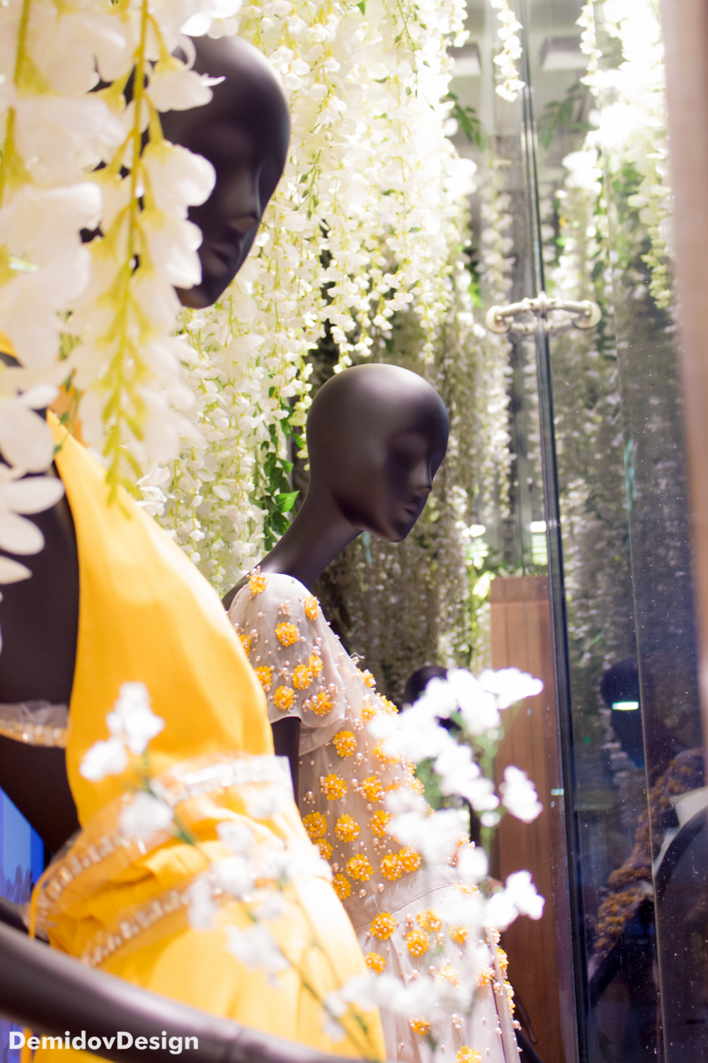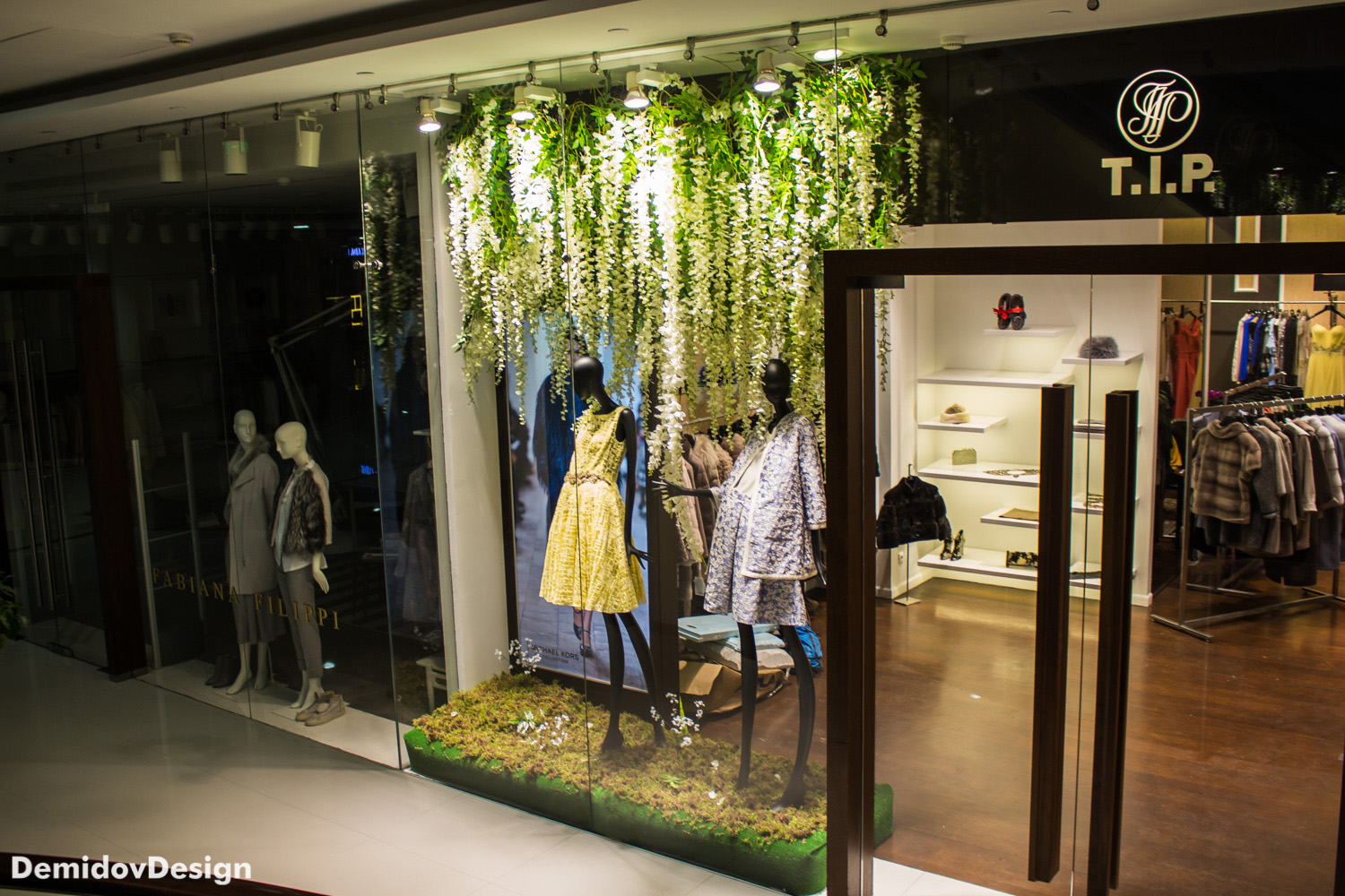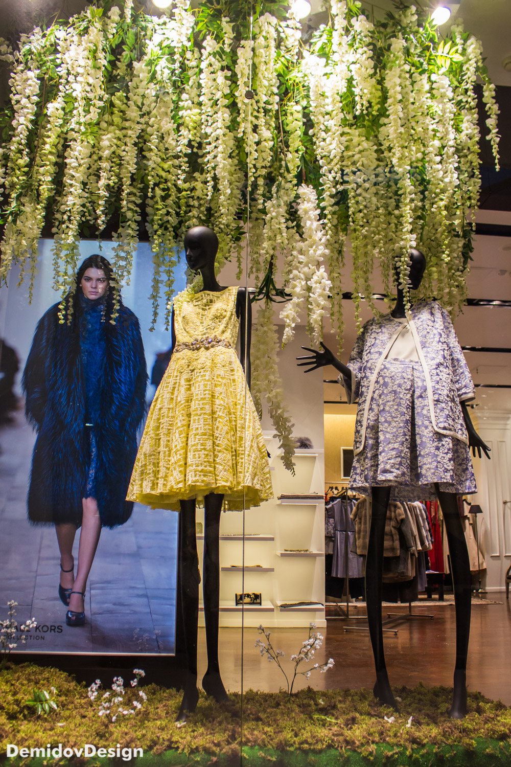 Витрина выполнена из сотен шелковых цветов акации, подвешенных в пространстве. Цветы создают ощущение уютного уголка под деревьями в саду. Подиумы в витрине покрыты натуральным мхом.