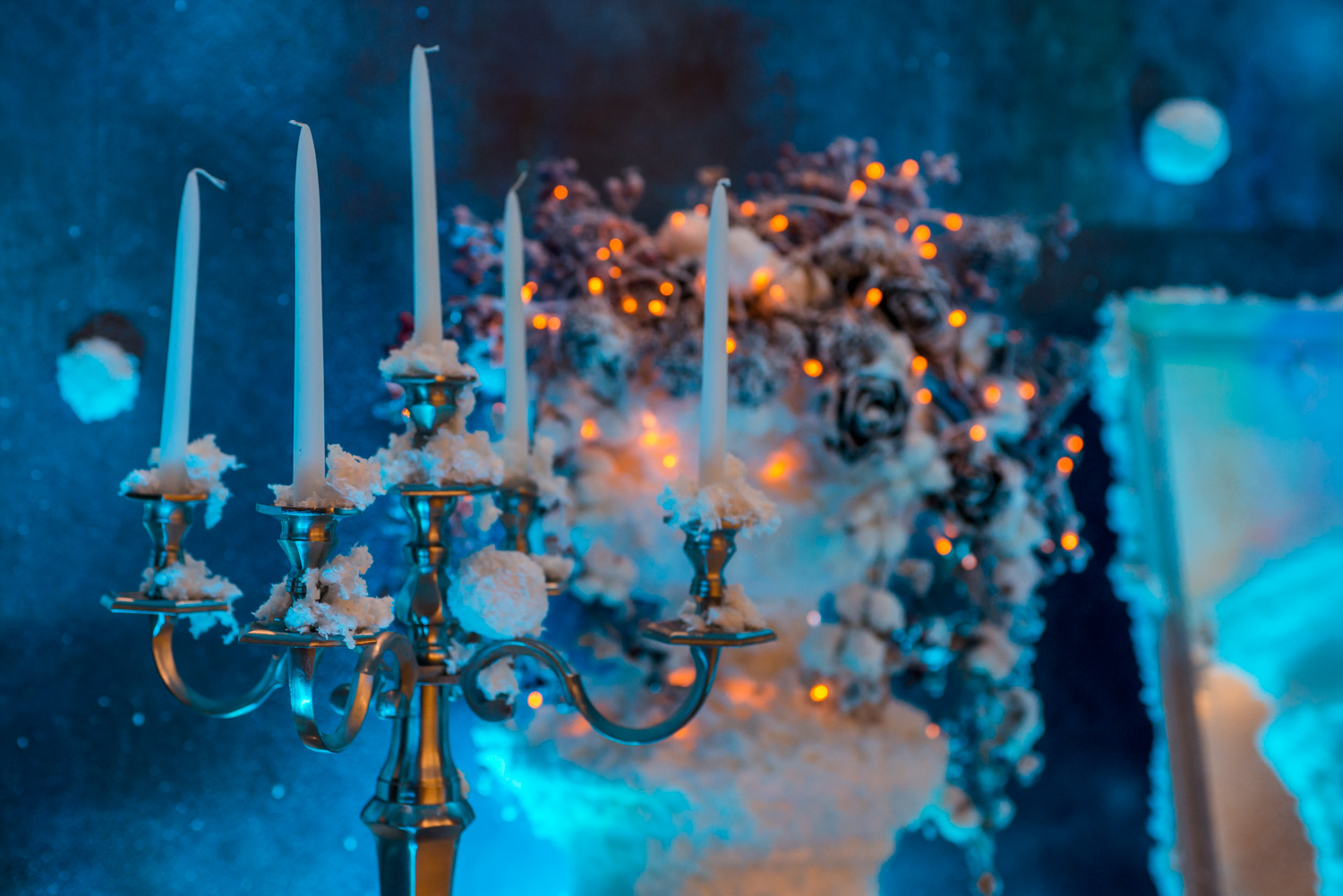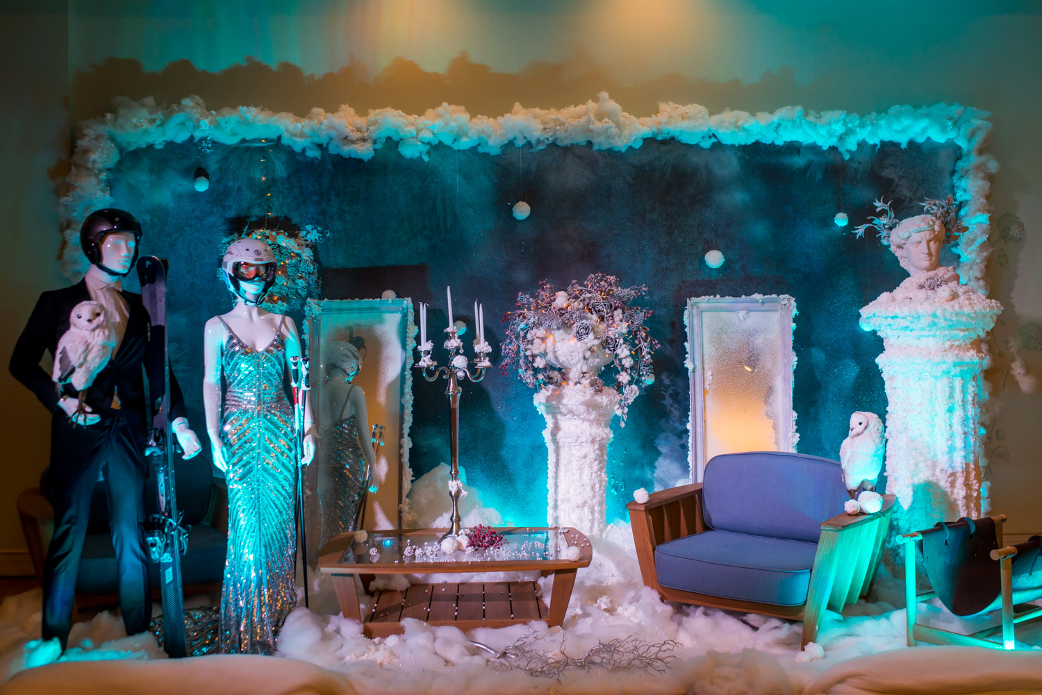 Классические колонны, большие зеркала, красивые декоративные элементы и сугробы – все замерло в своем снежном великолепии. Вечерние наряды на манекенах, в сочетании со спортивным инвентарем, создали особую атмосферу. Теплый свет праздничных гирлянд очень уютно сочетается с общим холодным освещением всего пространства. Наши дизайнеры смогли создать удивительный по своей атмосфере декор, напоминающий царство Снежной Королевы.